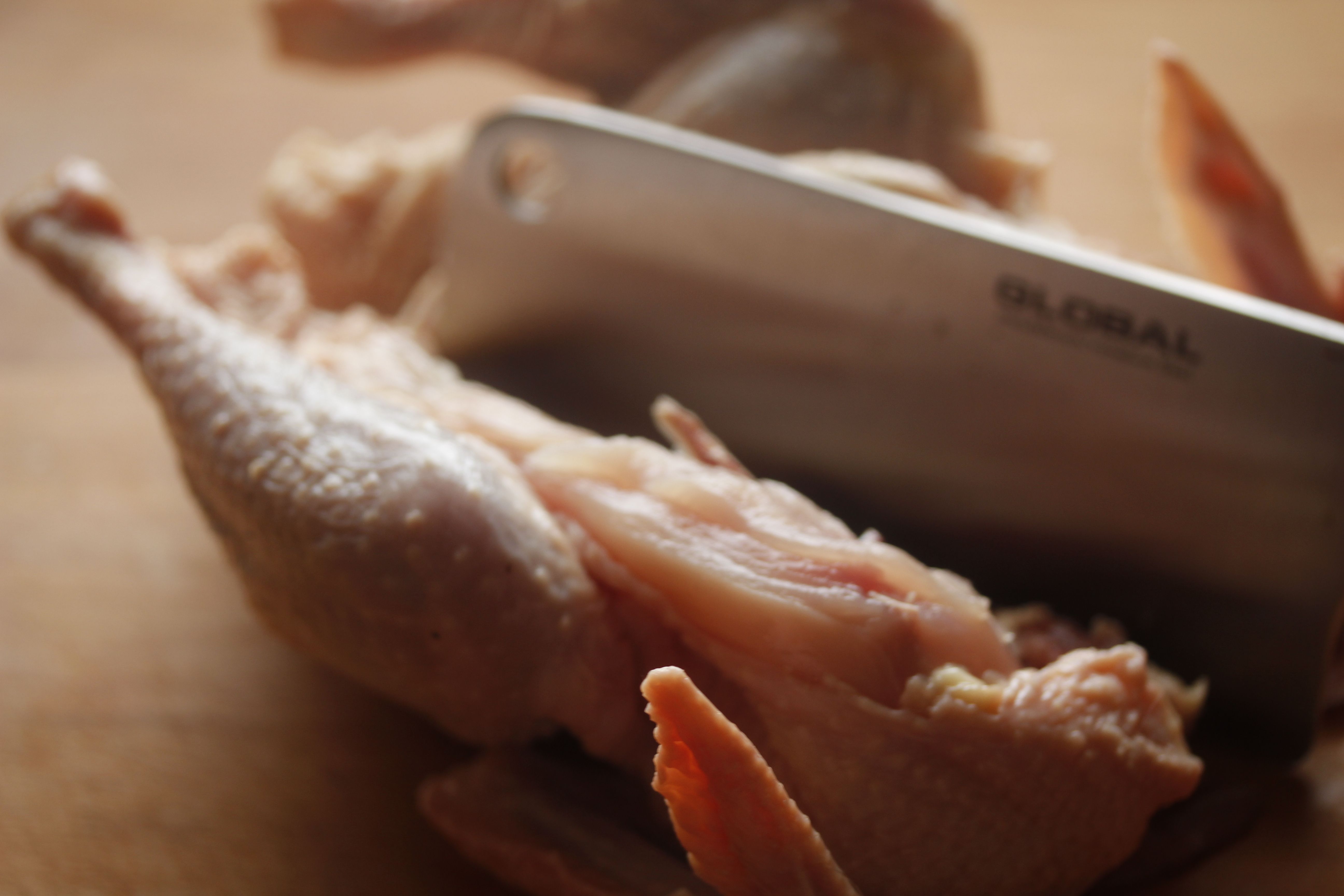 Ég byrjaði á að skera/höggva sundur bringubeinið og síðan hjó ég hryggbeinið frá til að hluta fuglinn í tvennt. Hryggbeinið má alveg fylgja öðrumhvorum helmingnum en ég hjó það reyndar alveg frá en eldaði það svo með til að fá úr því kraftinn. Svo hjó ég í sundur bringu og læri og var þá komin með fjóra bita (og hryggbeinið).