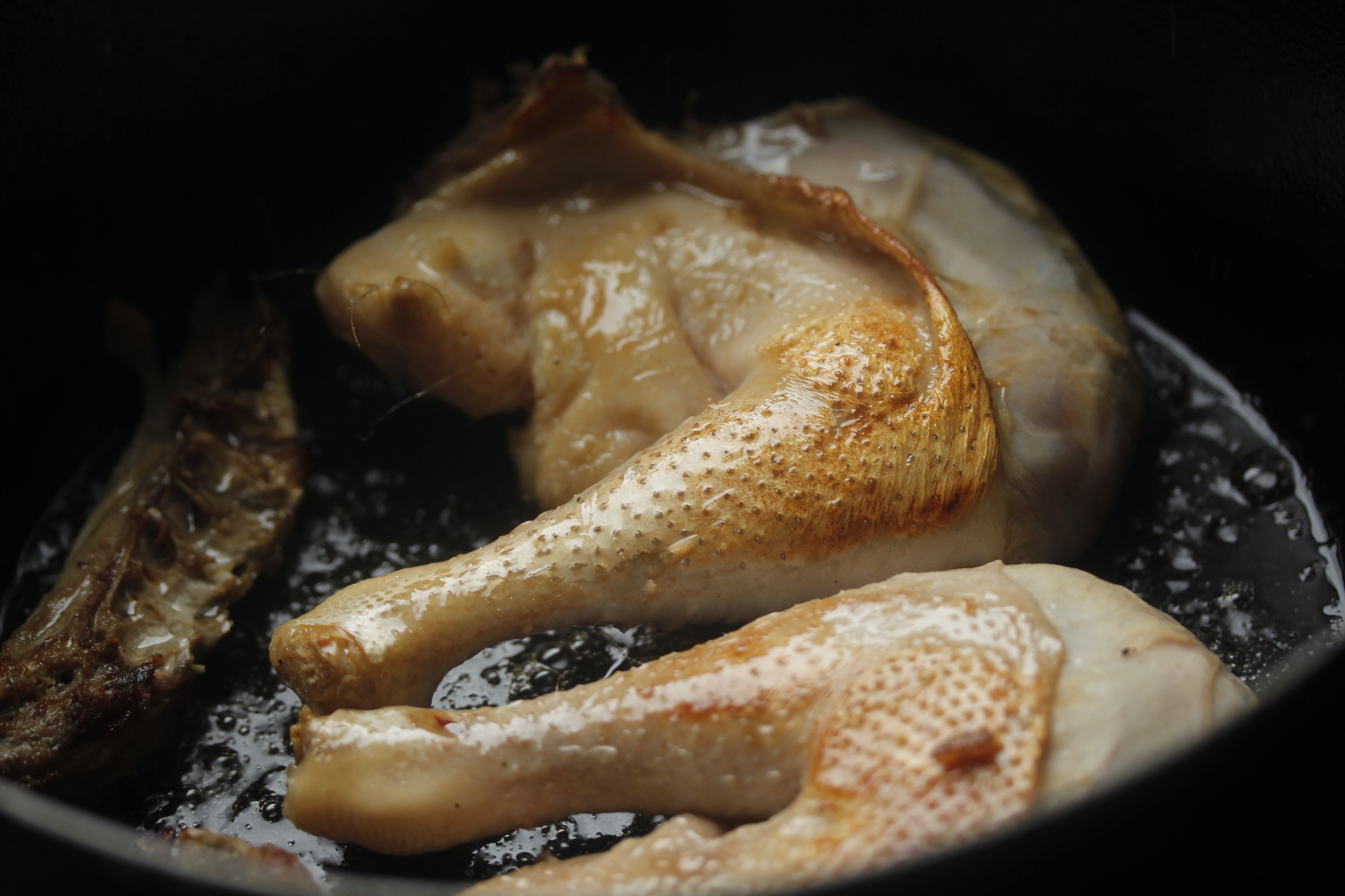 Eins og sjá má er byggingin dálítið önnur en á holdakjúklingi, bringan er hlutfalslega minni og fuglinn allur rýrari. Ég hef áður verið með uppskriftir þar sem ég byrja á að sjóða hænuna heila eða steikja hana í leirpotti en í þetta skipti ákvað ég að elda hana í bitum.