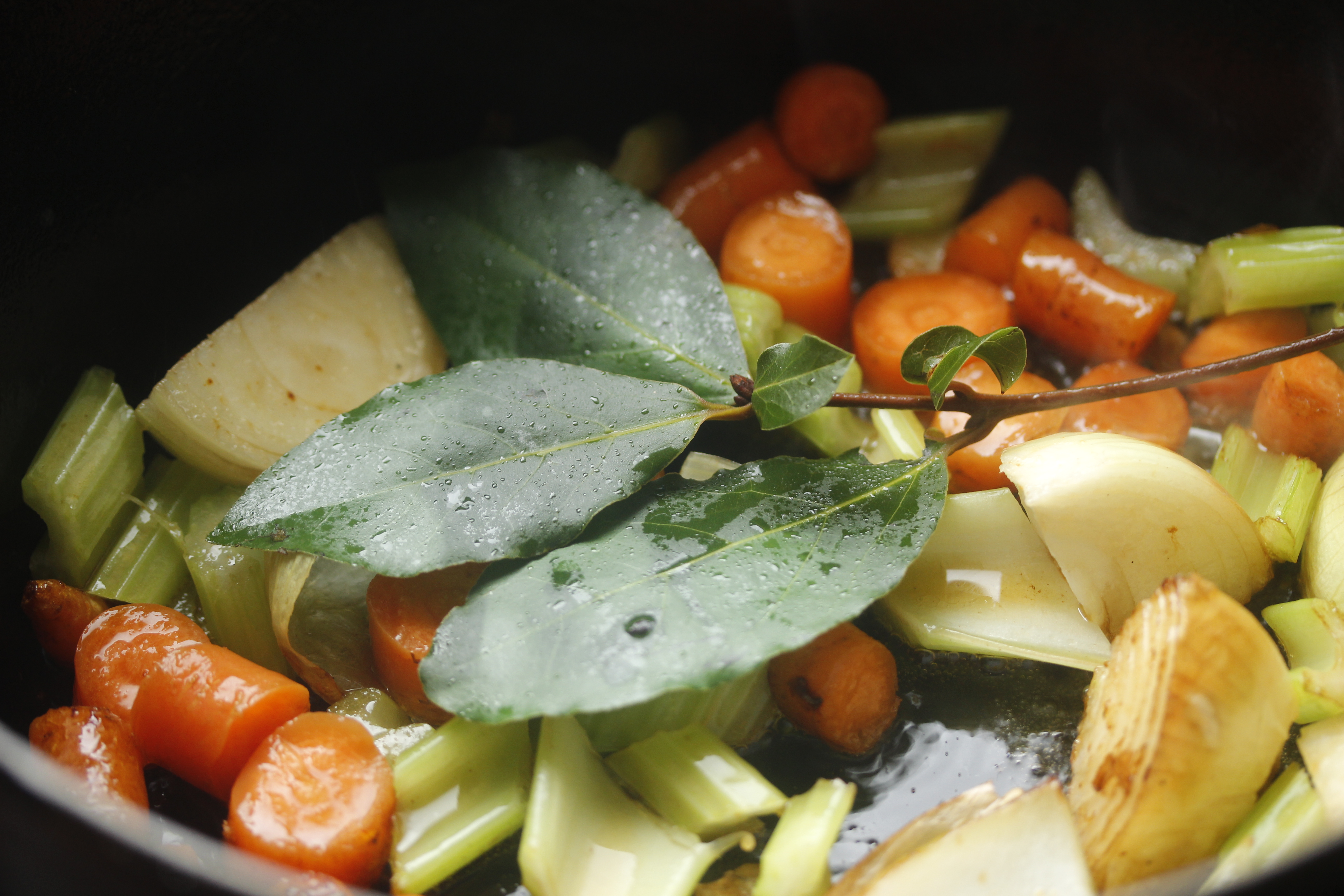 Svo setti ég hænsnabitana aðeins til hliðar á meðan ég steikti grænmeti sem ég var búin að skera niður: einn lauk, tvo sellerístöngla og tvær eða þrjár gulrætur. Ég notaði grænmeti sem var aðeins farið að láta á sjá og ég ætlaði bara að hafa í soðið en ekki nota sem hluta af réttinum svo ég var ekkert að flysja laukinn eða gulræturnar, en það má alveg gera það líka og hafa grænmetið með. Svo bætti ég við þremur lárviðarlaufum og kryddaði vel með pipar og salti.