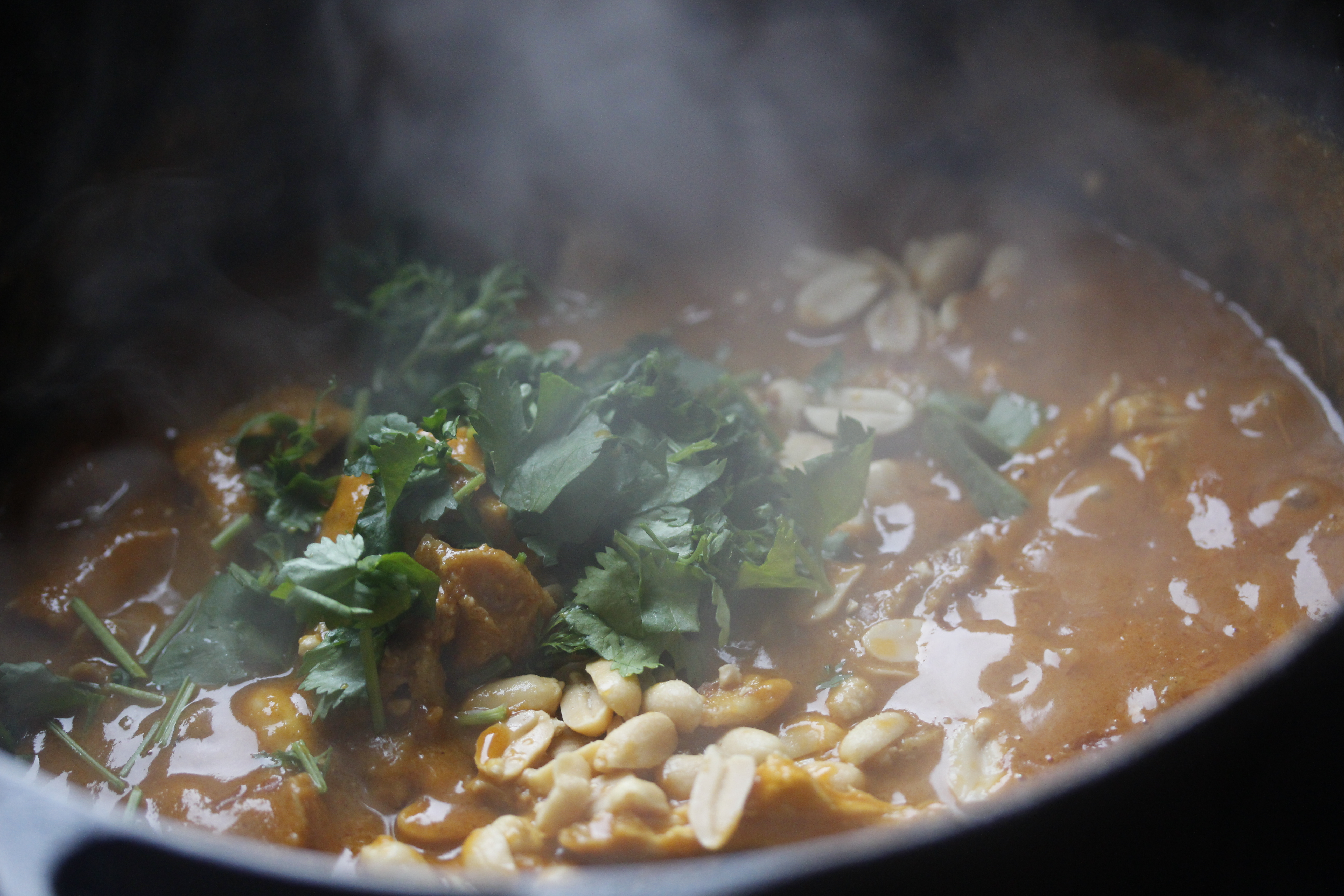 Setti kjötið svo út í sósuna ásamt 3-4 msk af salthnetum og lófafylli af söxuðu kóríanderlaufi.