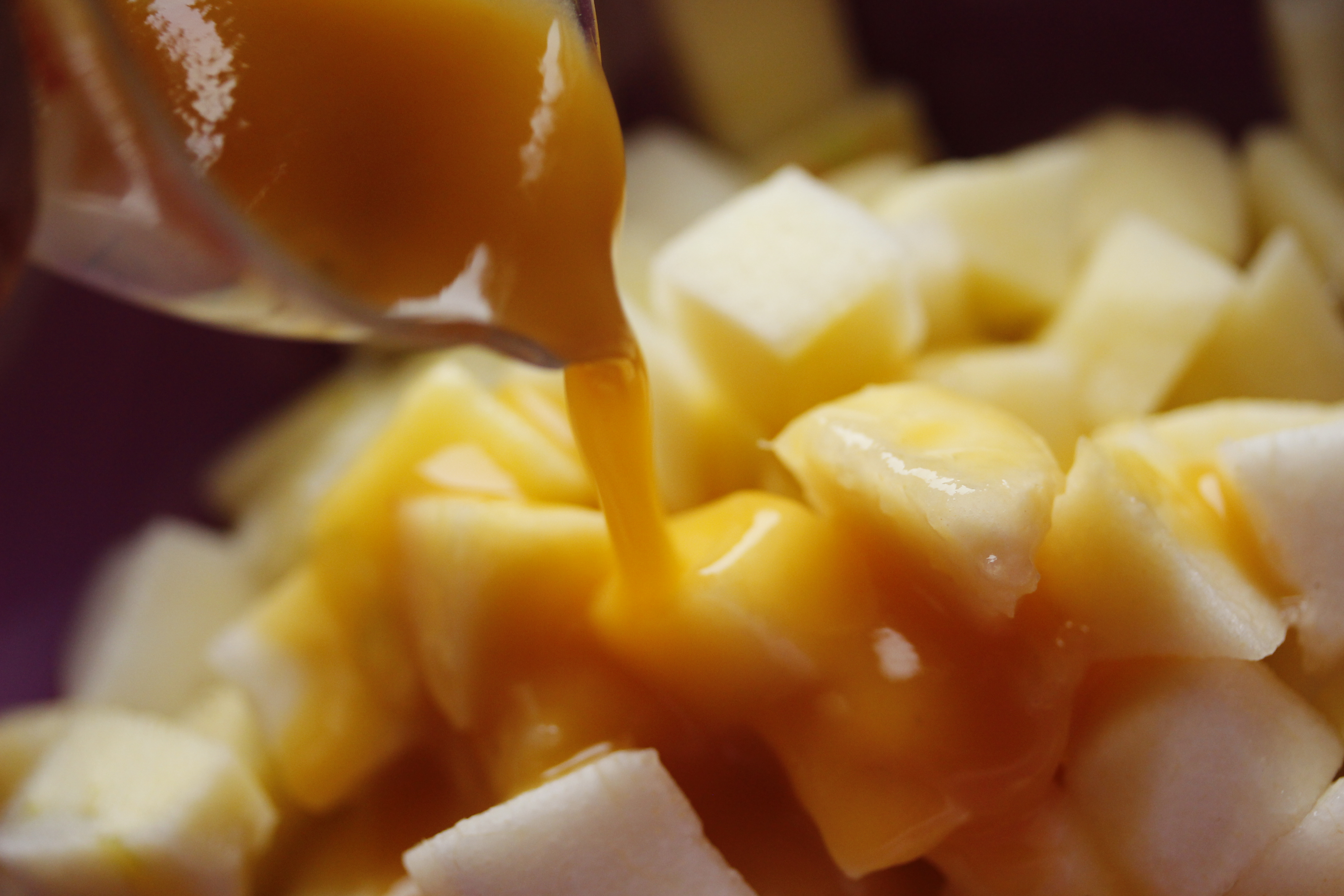 Svo tók ég 150 ml af ferskju- og mangómauki (smoothie, ég var með Froosh) og hrærði 1 msk af maizenamjölii saman við, hellti blöndunni yfir og hrærði vel.