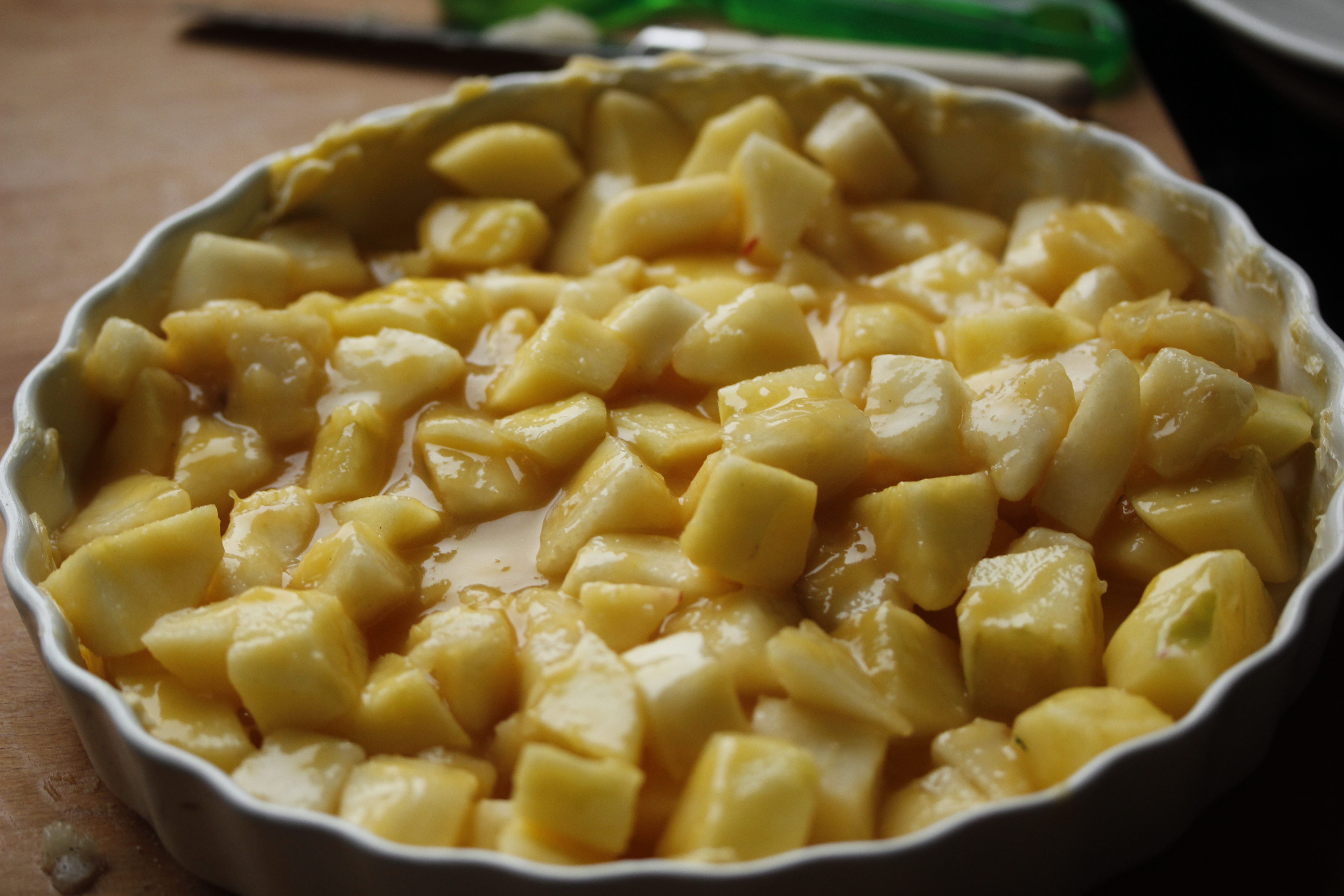 Innkaupapokinn sem ég hef verið að elda upp úr að undanförnu kom hér ekki við sögu en hefði þó getað gert það því að í honum voru bæði perur og epli, sem eru einmitt ávextirnir í bökunni. En þetta er eldri uppskrift, birtist fyrst í bökuþættinum sem ég var með í aprílblaði MAN. Í uppskriftinni sem var þar hafði ég 2 msk af hrásykri en tók fram að það mætti sleppa honum – mér finnst engin ástæða til þess, þótt ég sneiði hjá sykri sjálf, að senda eingöngu frá mér sykurlausar uppskriftir. En ég notaði hins vegar engan sykur þegar ég gerði bökuna sem er á myndunum og hún var alveg hreint ágæt, því sætan í fyllingunni dugir alveg – það fannst vinnufélögunum líka, því þeir fengu að gæða sér á henni daginn eftir.