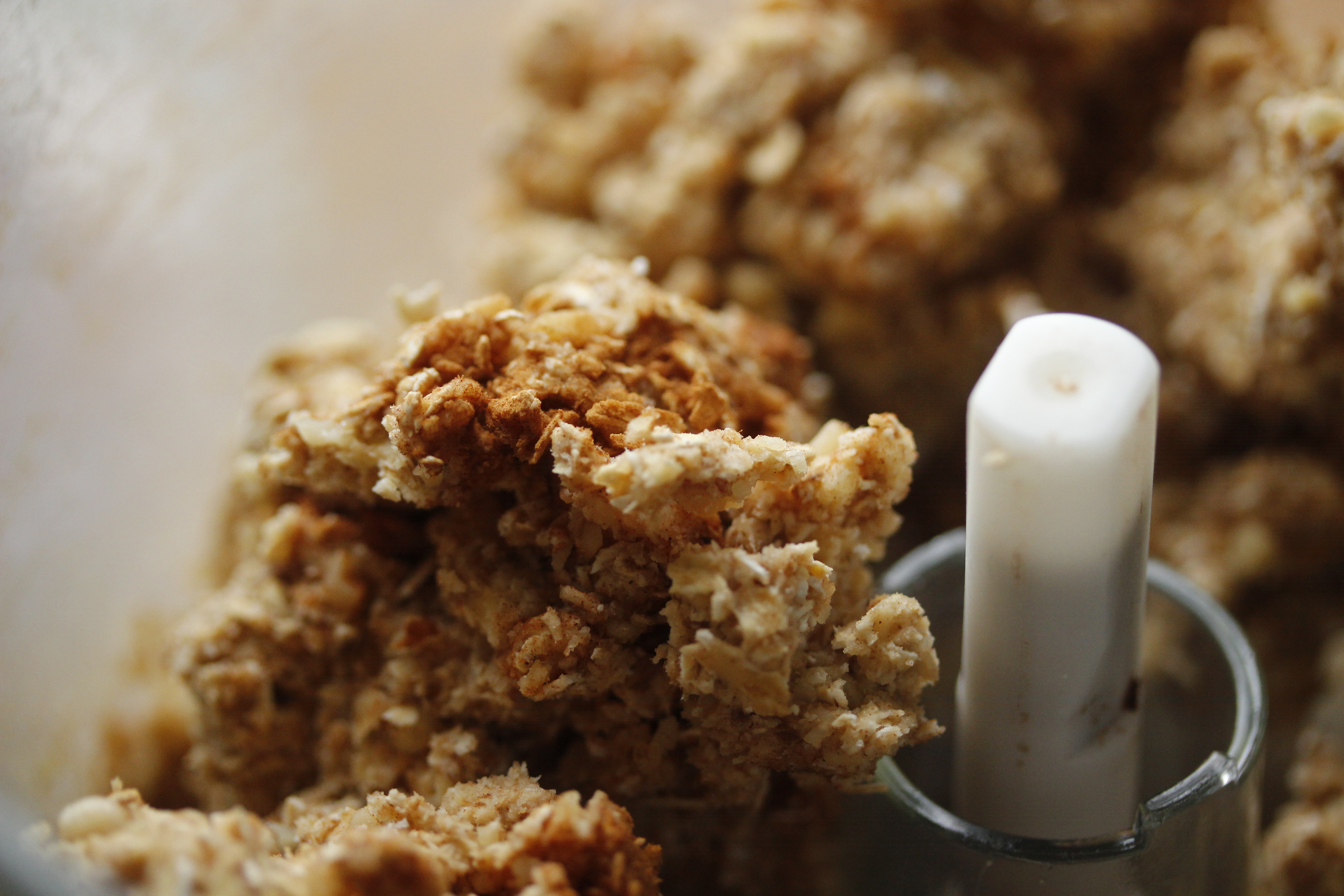 Þá var það mylsnan ofan á fyllinguna: Ég setti 100 g af hafragrjónum, 80 g af valhnetum,1 tsk af kanel og 1/4 tsk af salti (og sykur ef hann er notaður) í matvinnsluvél og lét ganga þar til hneturnar voru gróf malaðar og allt hafði blandast saman.
