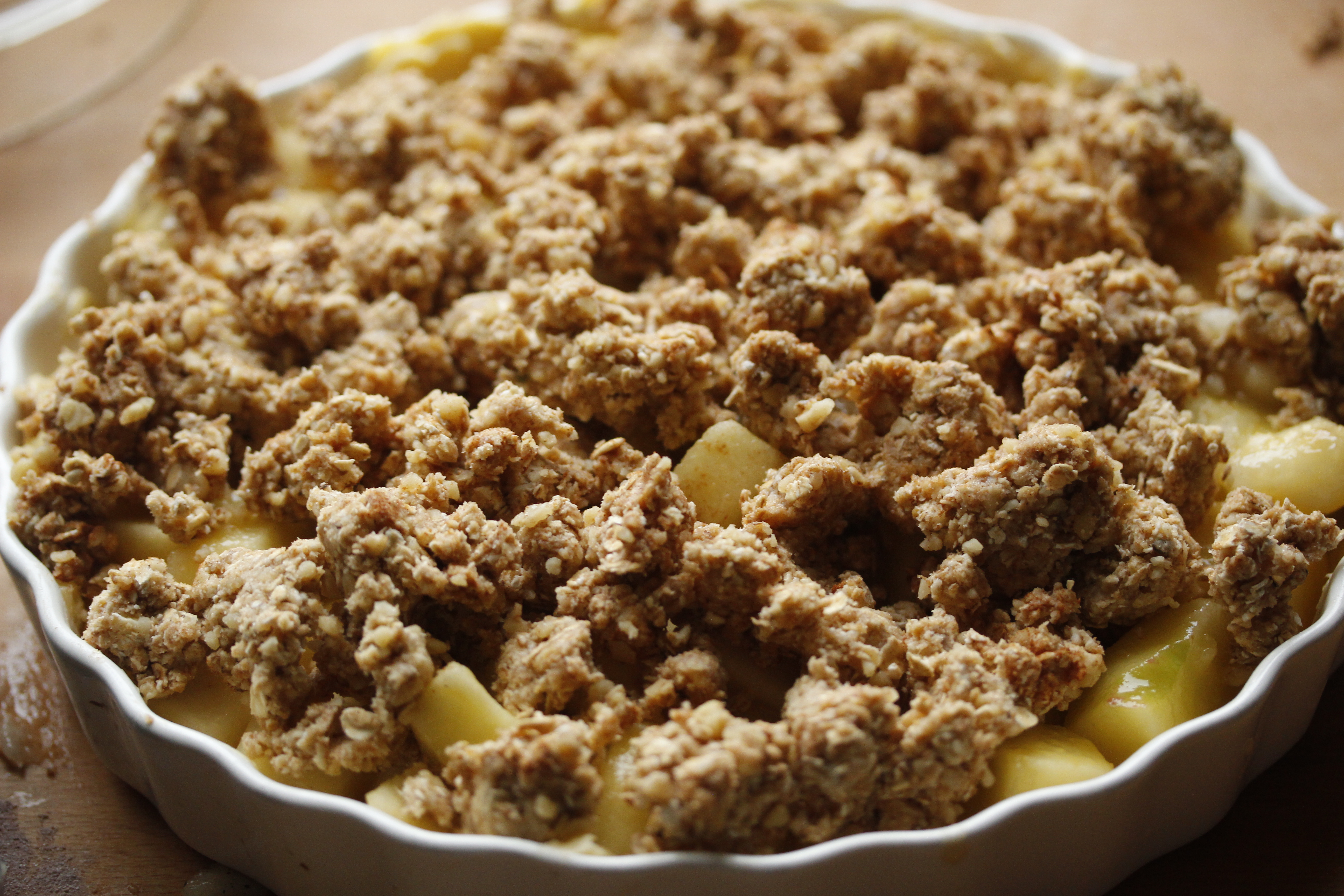 Ég setti bökuna svo á neðstu rim í ofninum og bakaðu hana í 25-30 mínútur, eða þar til mylsnan hafði tekið góðan lit og var stökk.