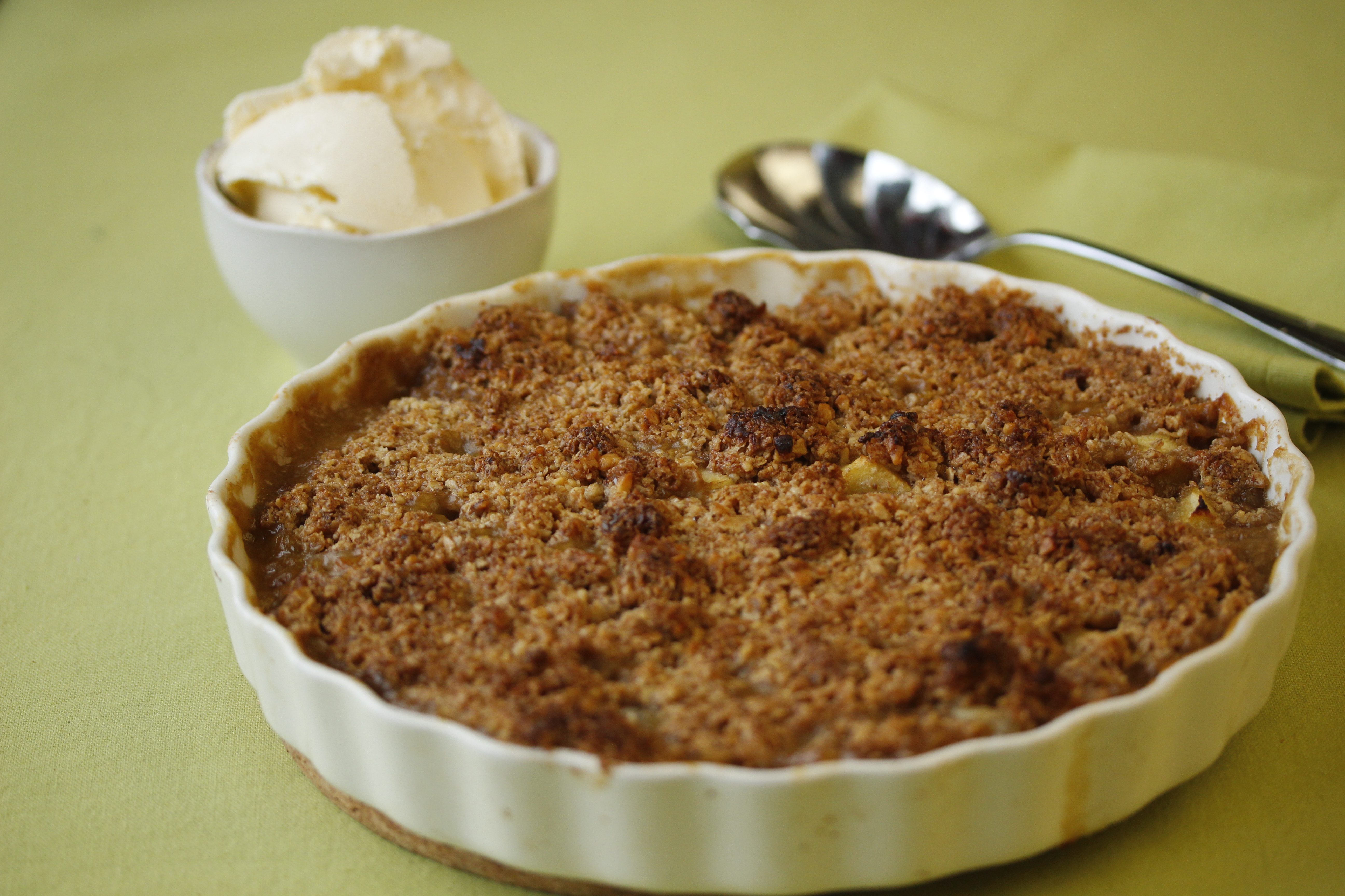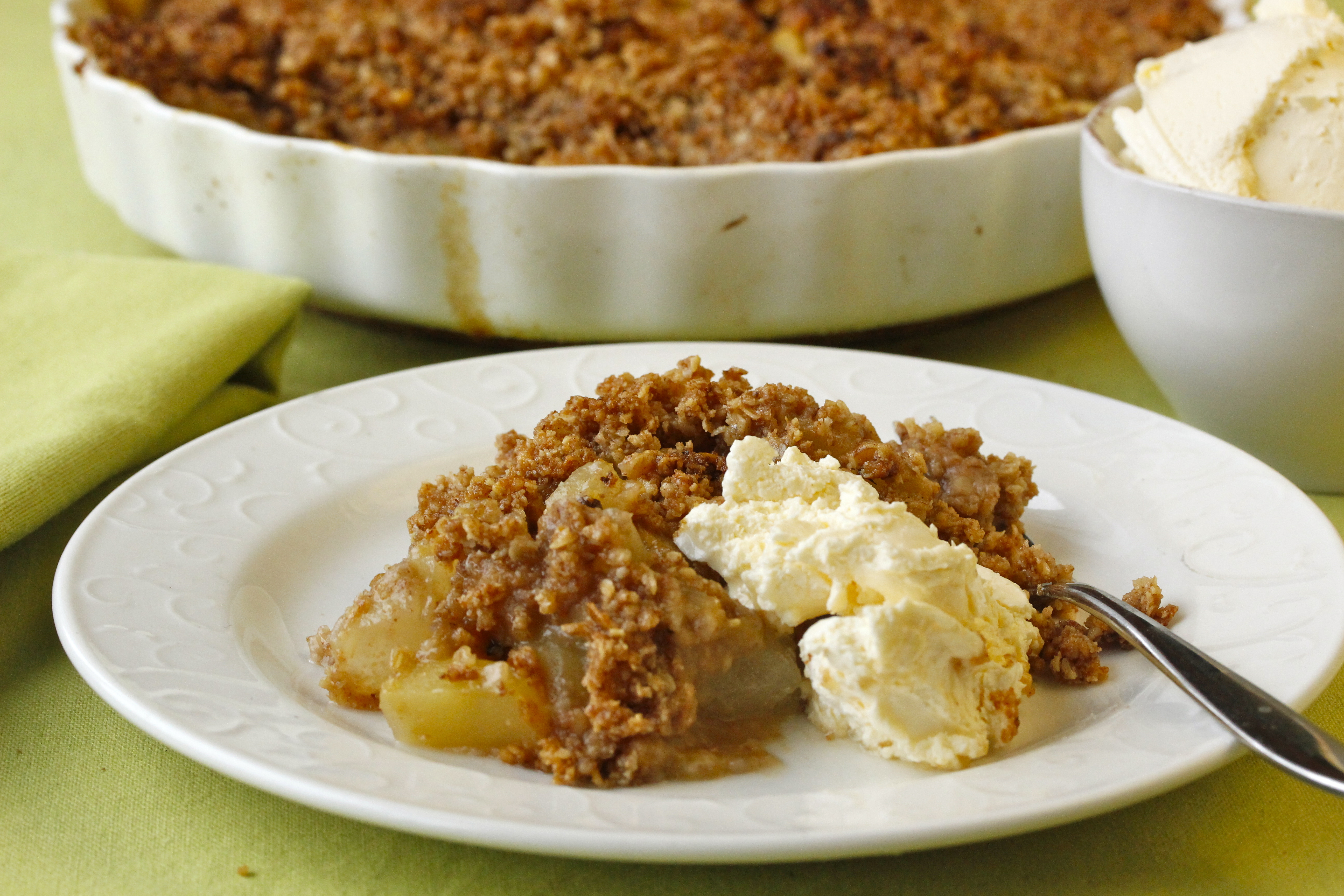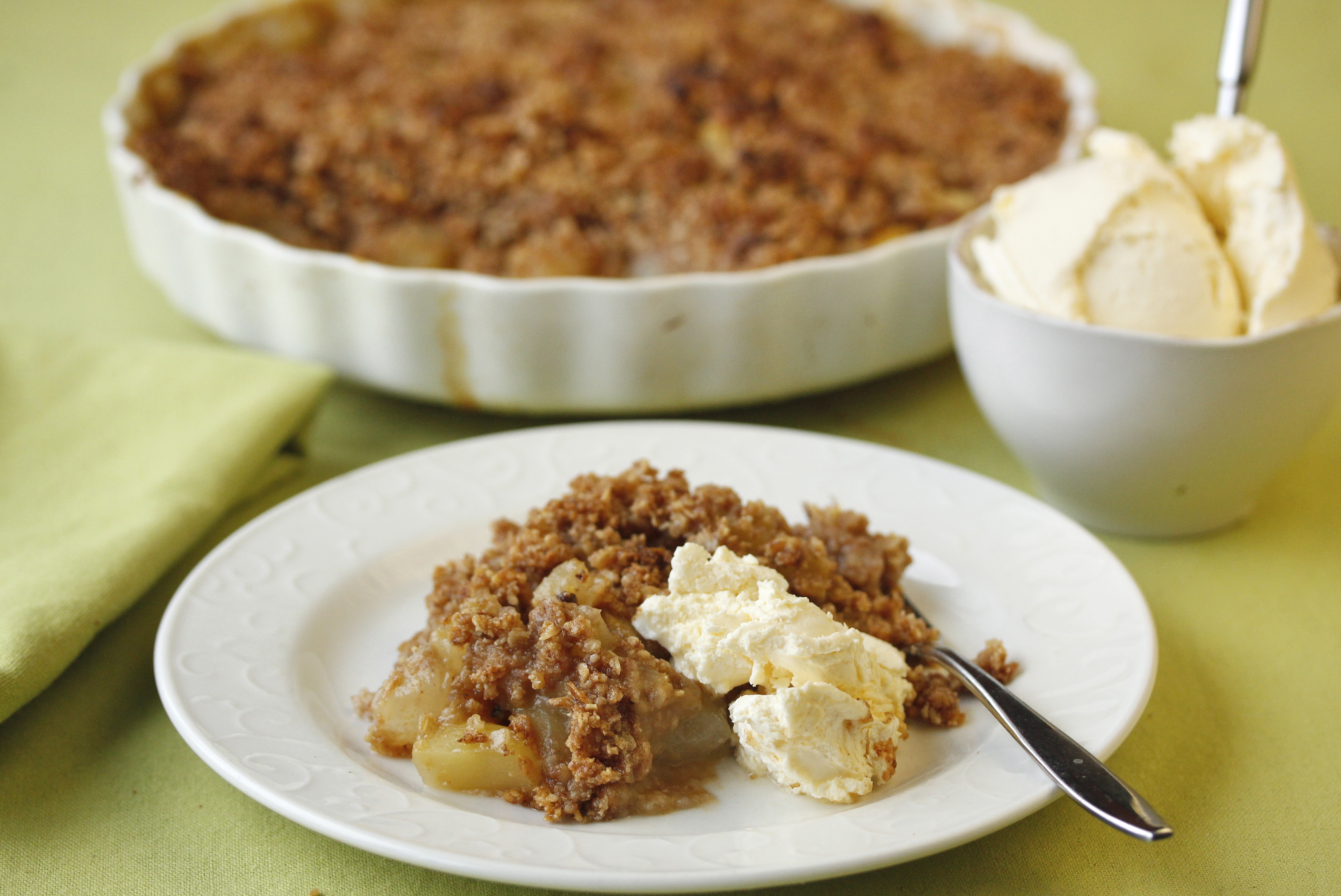 Þetta er svokölluð mylsnubaka eða crumble upp á útlensku. Mylsnubökur eru ekki bakaðar í deigskel, heldur er fyllingin – yfirleitt ávextir eða ber – sett í form og síðan er bökudeig mulið yfir og þetta svo bakað þar til mylsnan er stökk og ávextirnir meyrir. Ég notaði hér epli og perur en það má nota aðra ávexti. Fyllingin sjálf er án viðbætts sykurs og mylsnuþekjan er hveitilaus og er semsagt sykurlaus líka – en það má blanda saman við hana dálitlum hrásykri (2 msk eða svo). Eða bara hvítum sykri þess vegna.