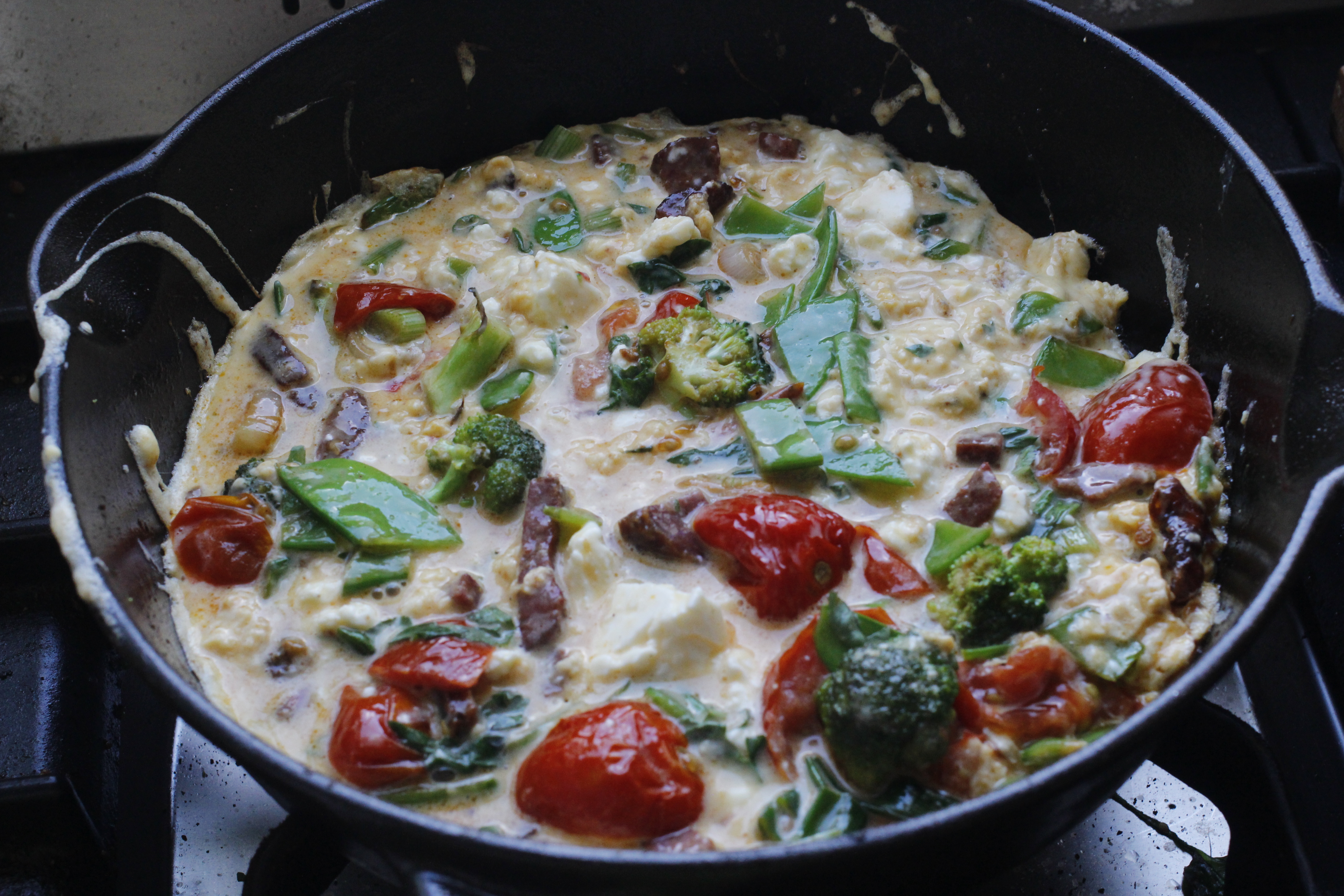 Kvöldmaturinn minn síðasta fimmtudag var ommeletta með chorizopylsu, sykurbaunum, tómötum, fetaosti, spergilkáli og basilíku. Pylsan, sykurbaunirnar, tómatarnir og fetaosturinn voru úr innkaupapokanum, eggin og spergilkálið átti ég til.