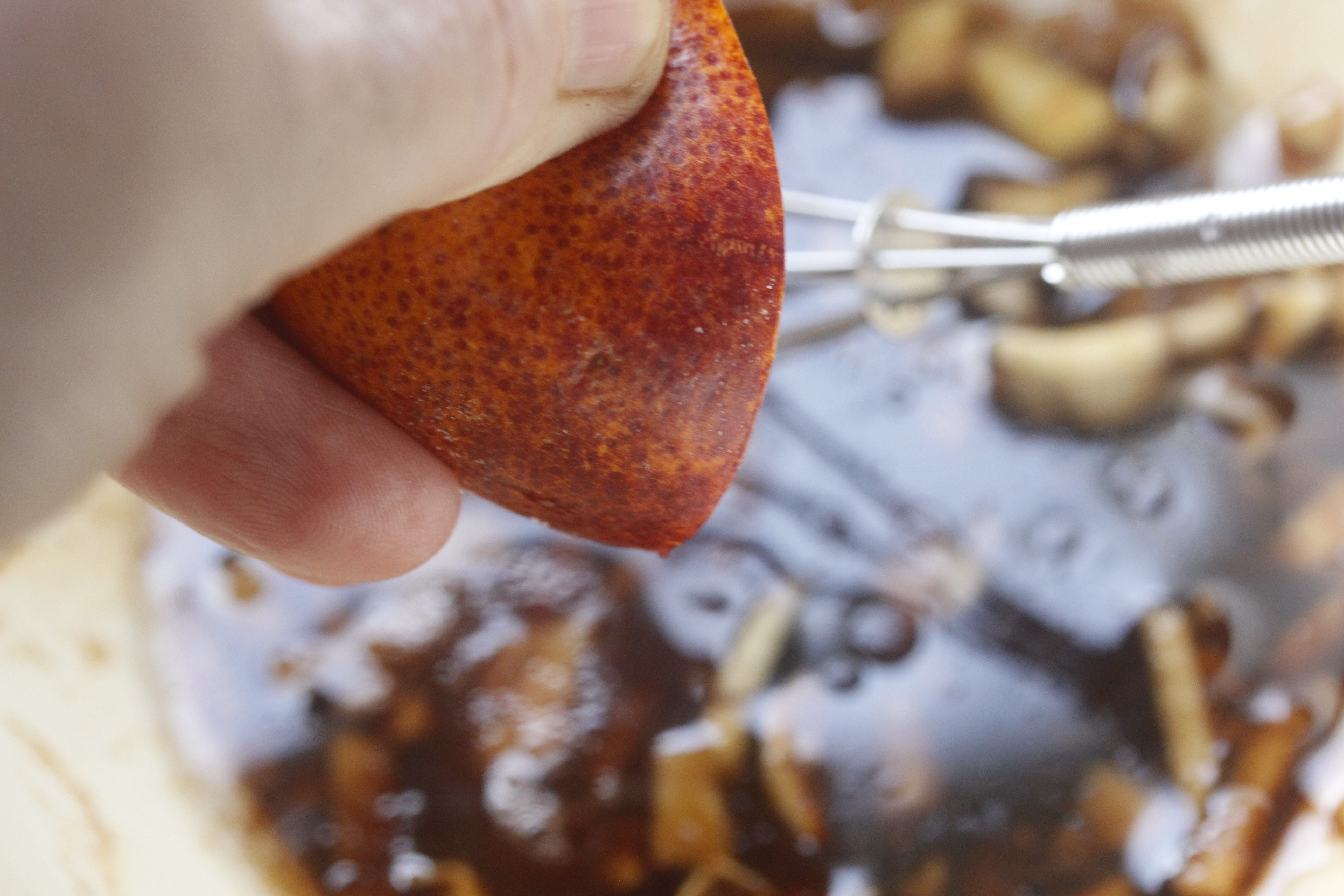 Svo útbjó ég maríneringuna: 3 msk olía, 1 msk balsamedik, 1 tsk Frank’s Hot Chilisauce (eða einhver önnur chilisósa, meira eða minna eftir smekk), 2 hvítlauksgeirar, saxaðir, 2-3 cm biti af engifer, saxaður, pipar og salt. Hrærði þetta allt saman í skál og svo kreisti ég safa úr einni blóðappelsínu út í. Ég ætlaði bara að nota hálfa en það var svo lítill safi í þessu (ef notuð er venjuleg appelsína ætti fjórðungur að duga eða jafnvel minna.)