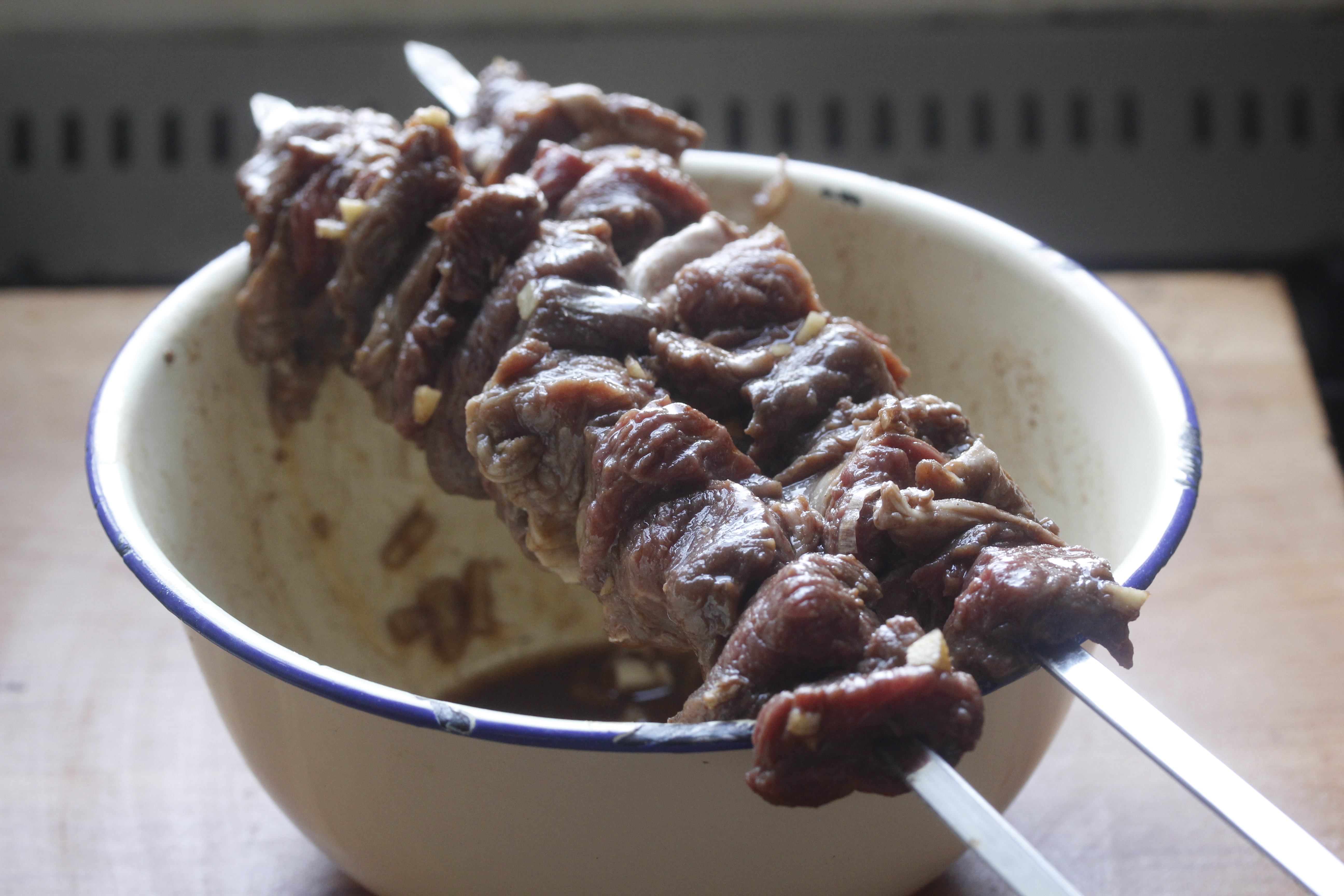 Ég hitaði svo grillið (hafði það lokað) og þræddi kjötbitana upp á tvö spjót. Ef notaðir eru tréteinar þarf að leggja þá í bletyi í hálftíma fyrir notkun svo þeir brenni síður. Ég þrætti kjötið þétt upp á spjótin og hafði ekkert með þeim.