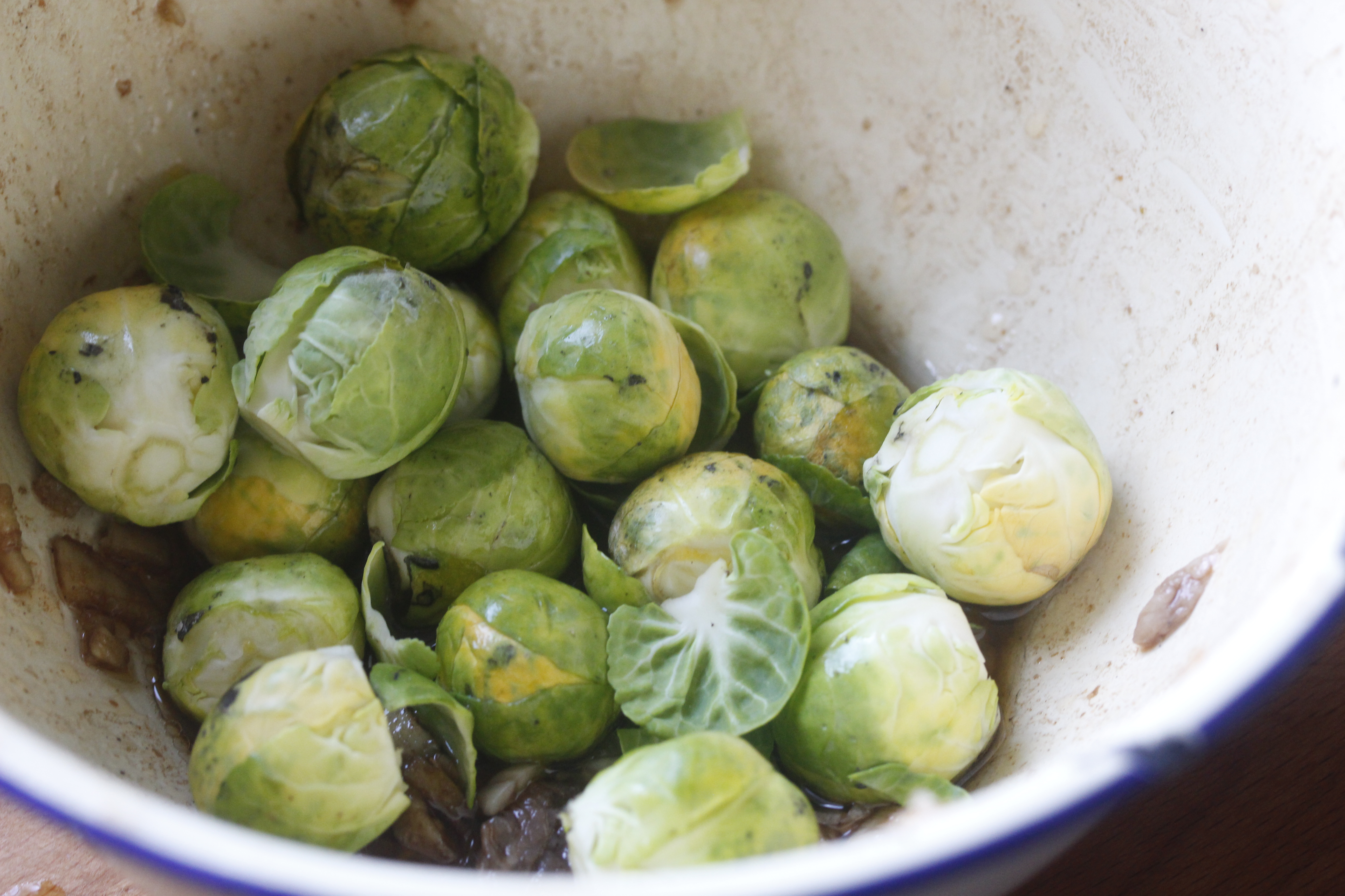 Kjðtið var tilbúið og ég tók það af grillinu og athugaði rósakálið – jú, það var rétt orðið meyrt, svo að ég tók það af líka, fór með kjöt og kál inn í eldhús, breiddi álpappír lauslega yfir og lét standa í 2-3 mínútur. Á meðan sauð ég lófafylli af sykurbaunum í 2 mínútur í saltvatni og maukaði saman 4 msk af ólífuolíu, 1 hvítlauksgeira, lófafylli af steinselju og pipar og salt, það var sósan.