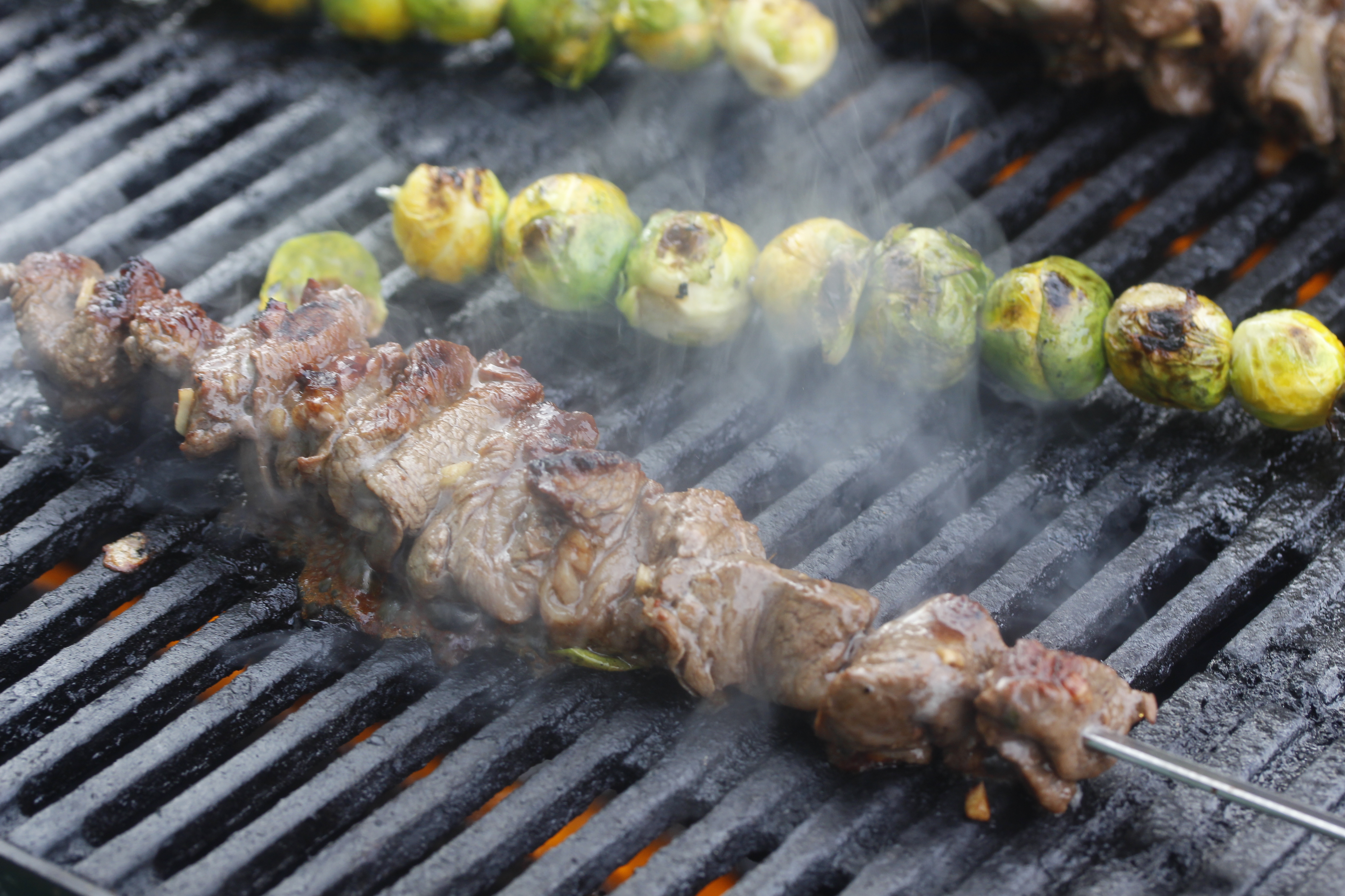 Þegar grillið var orðið vel heitt fór ég út með pinnana. Slökkti á miðjubrennaranum (þetta er lítið Webergrill) og setti rósakálið þar yfir en grillaði kjötið beint yfir nokkuð góðum eldi. Ég grillaði þetta í líklega svona 7 mínútur alls og sneri einu sinni, en tíminn fer náttúrlega eftir því hvað kjötinu er þétt raðað og hvað maður vill hafa það mikið steikt. Ég hafði grillið lokað allan tímann.