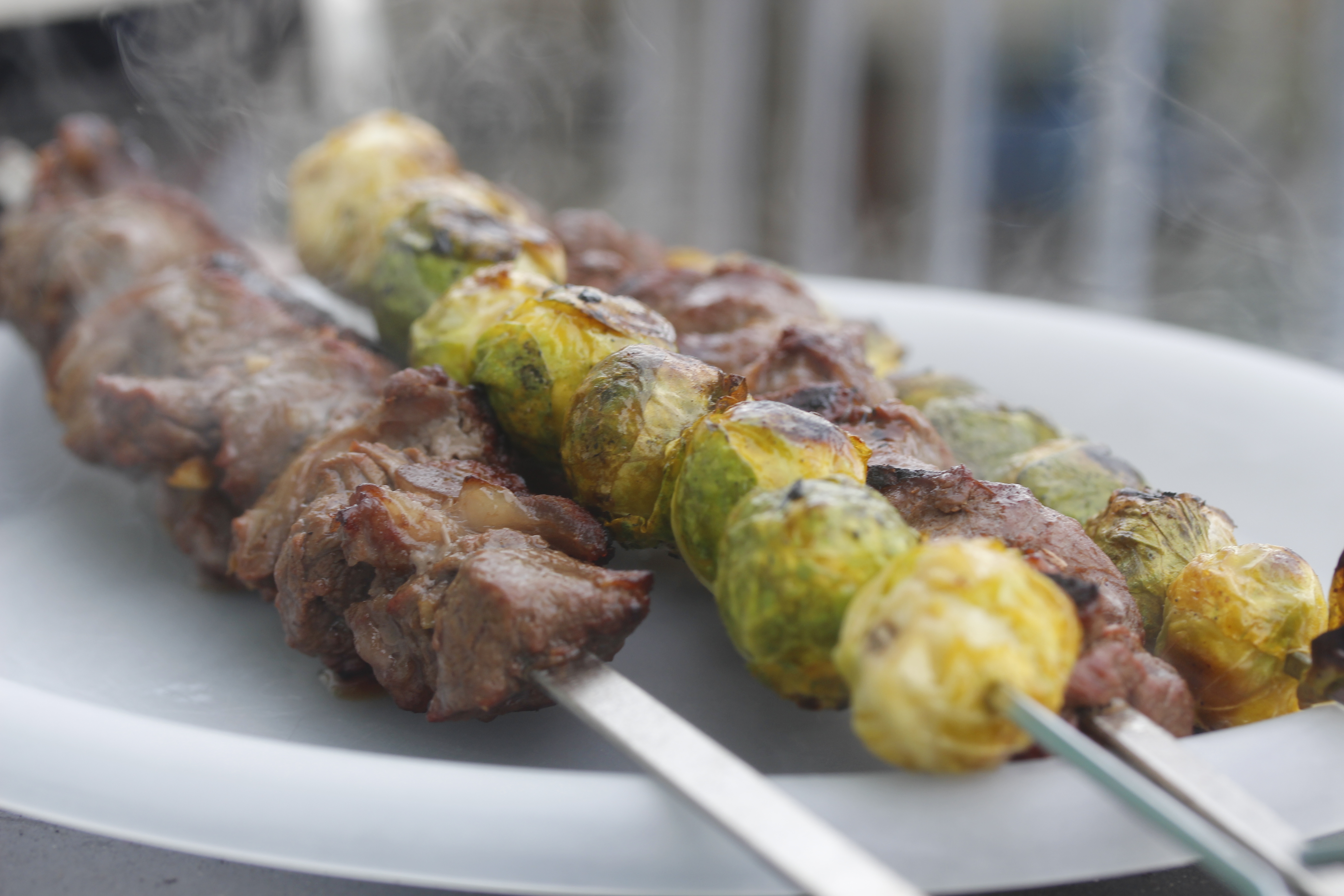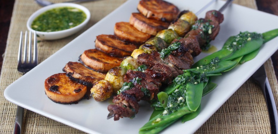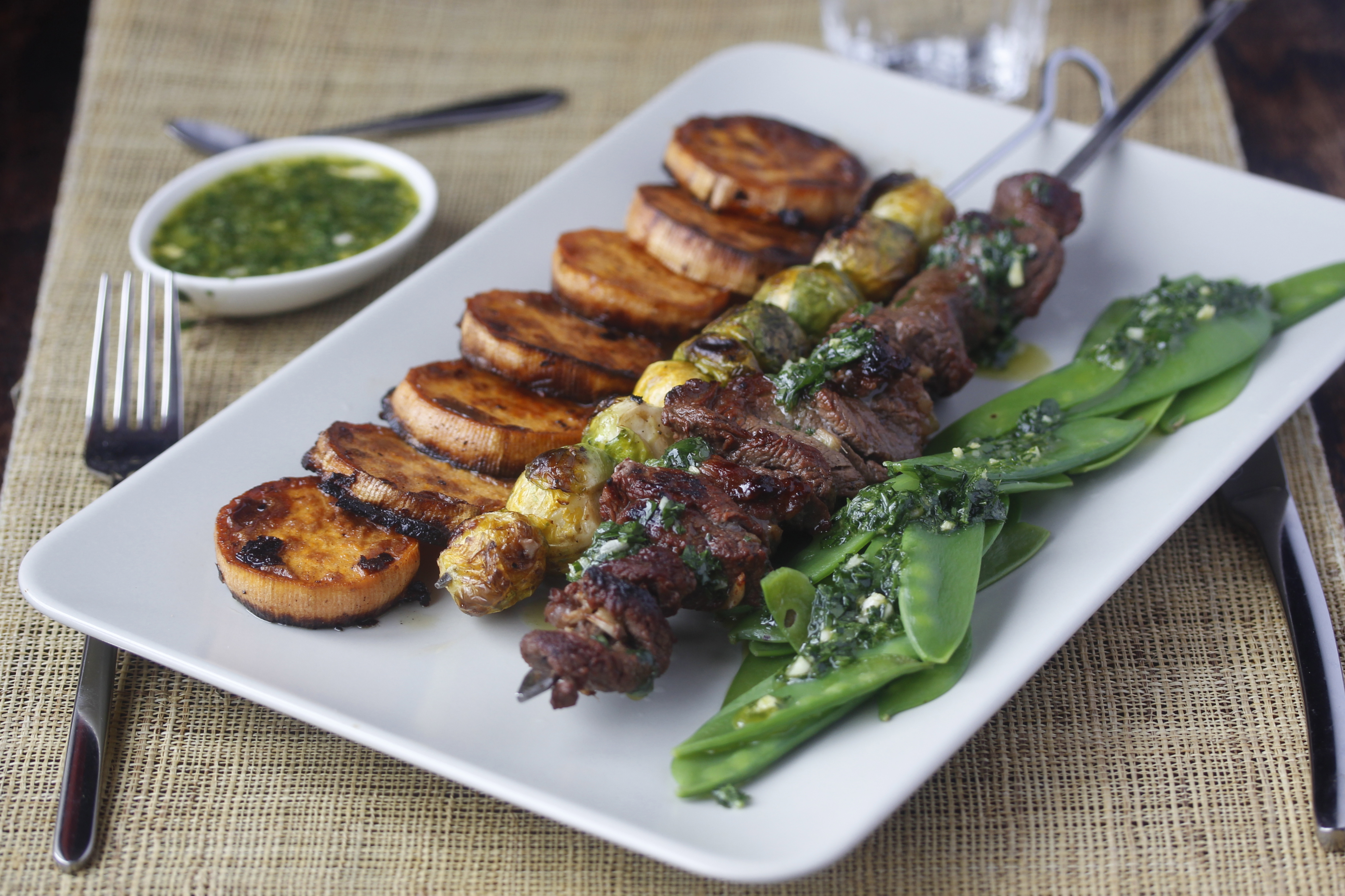 Grillað nautaspjót með rósakáli, sætukartöflum og sykurbaunum