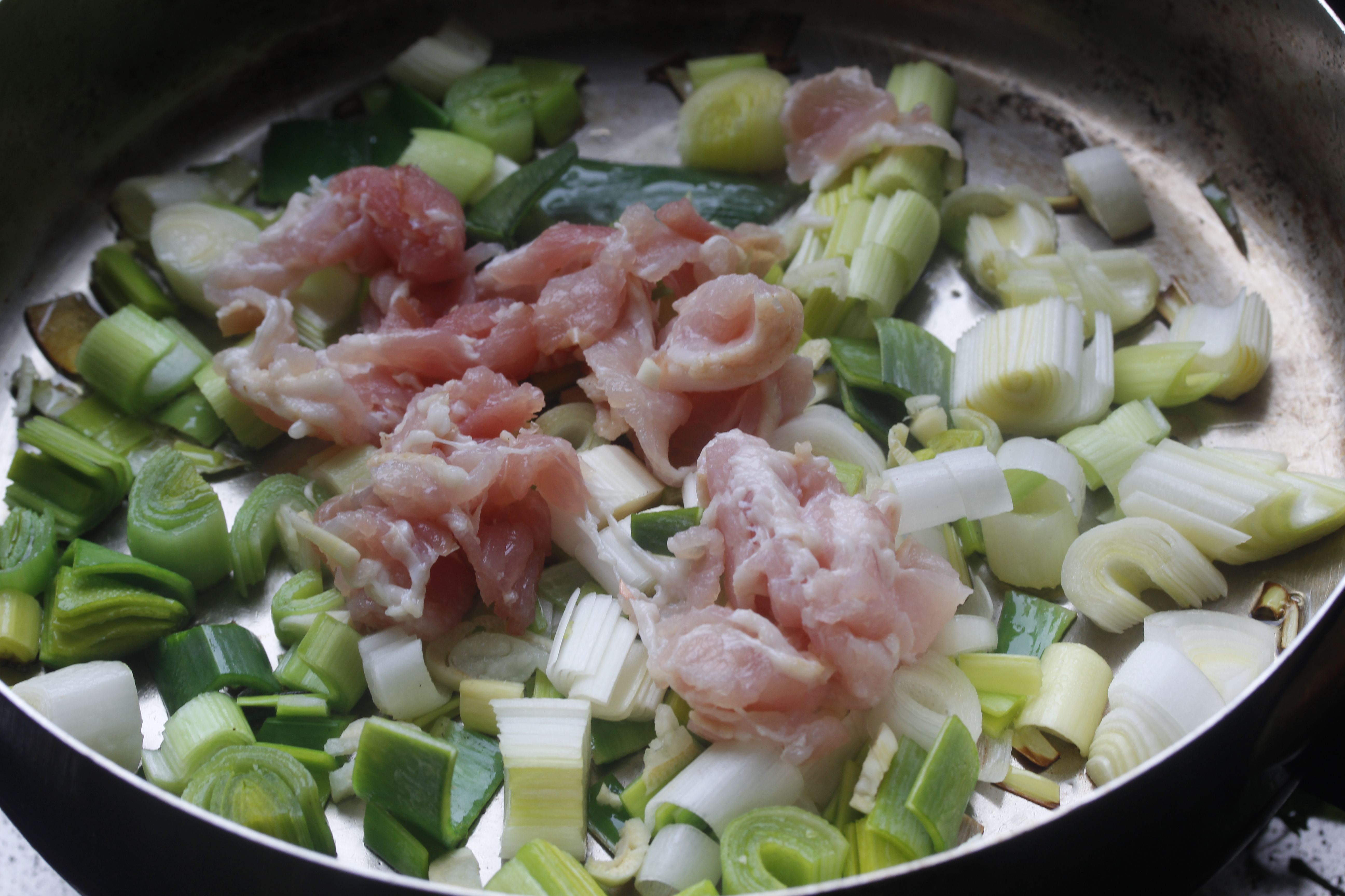 Ég snyrti blaðlaukinn og saxaði hann, saxaði hvítlaukinn smátt og skar beikonið í litla bita. Hitaði 1 1/2 msk af ólífuolíunni á þykkbotna pönnu og lét svo blaðlauk, hvítlauk og beikon krauma við meðalhita í nokkrar mínútur, þar til laukurinn var farinn að mýkjast. Hrærði öðru hverju.