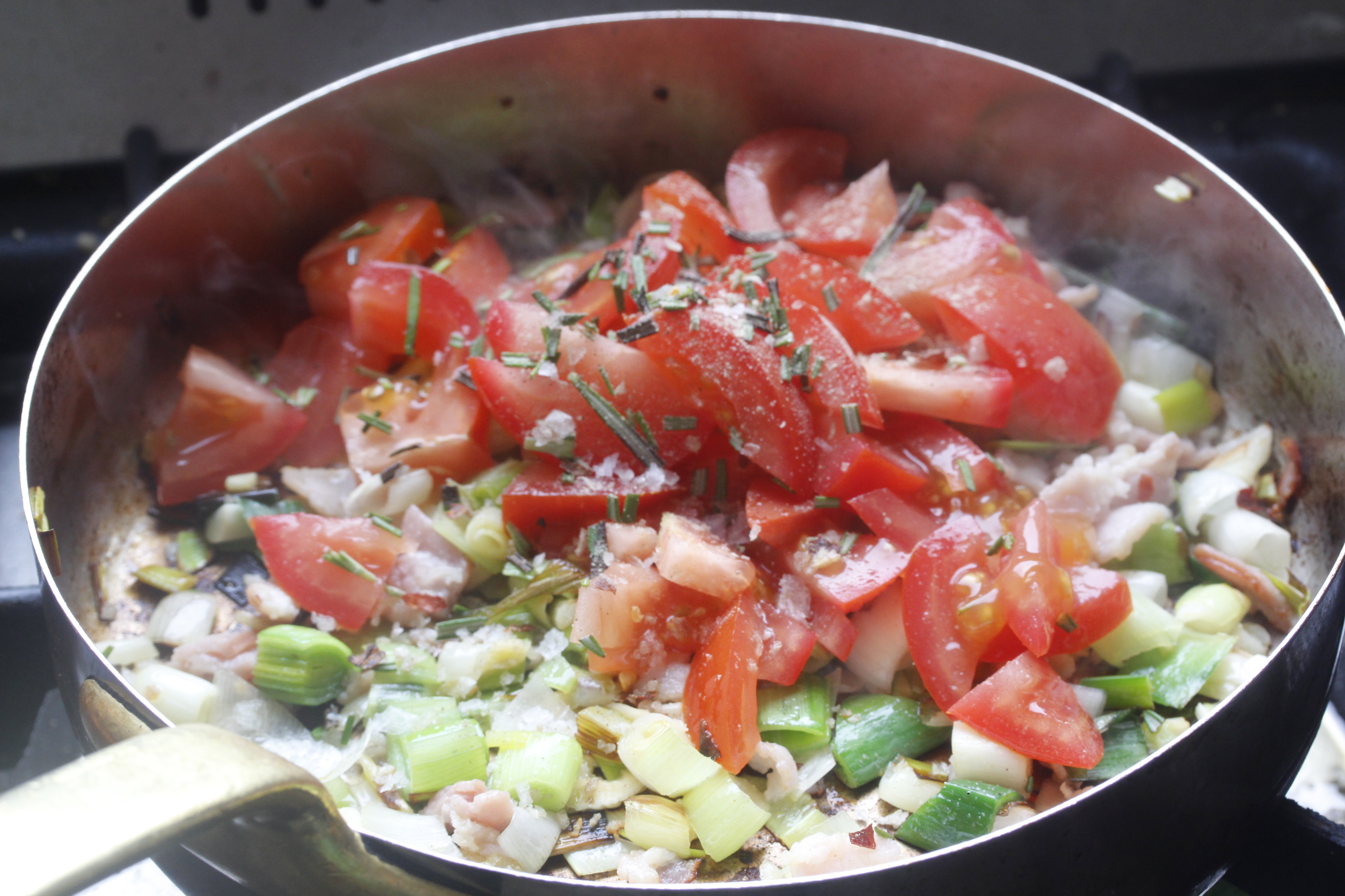 Ég skar svo tómatana í bita, saxaði rósmarínið smátt og setti hvorttveggja á pönnuna ásamt chiliflögum, pipar og salti. Hrærði og lét krauma í 1-2 mínútur.