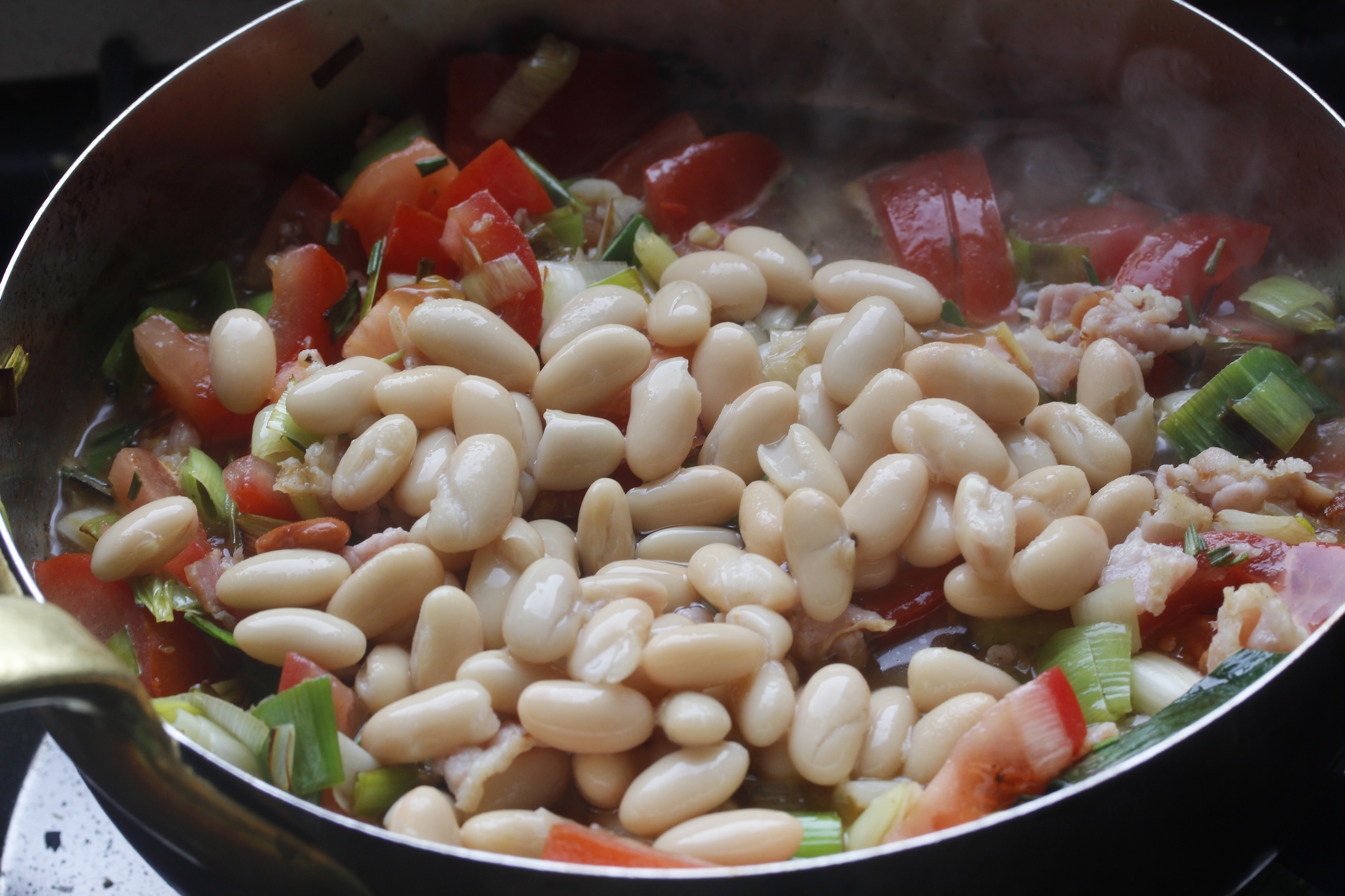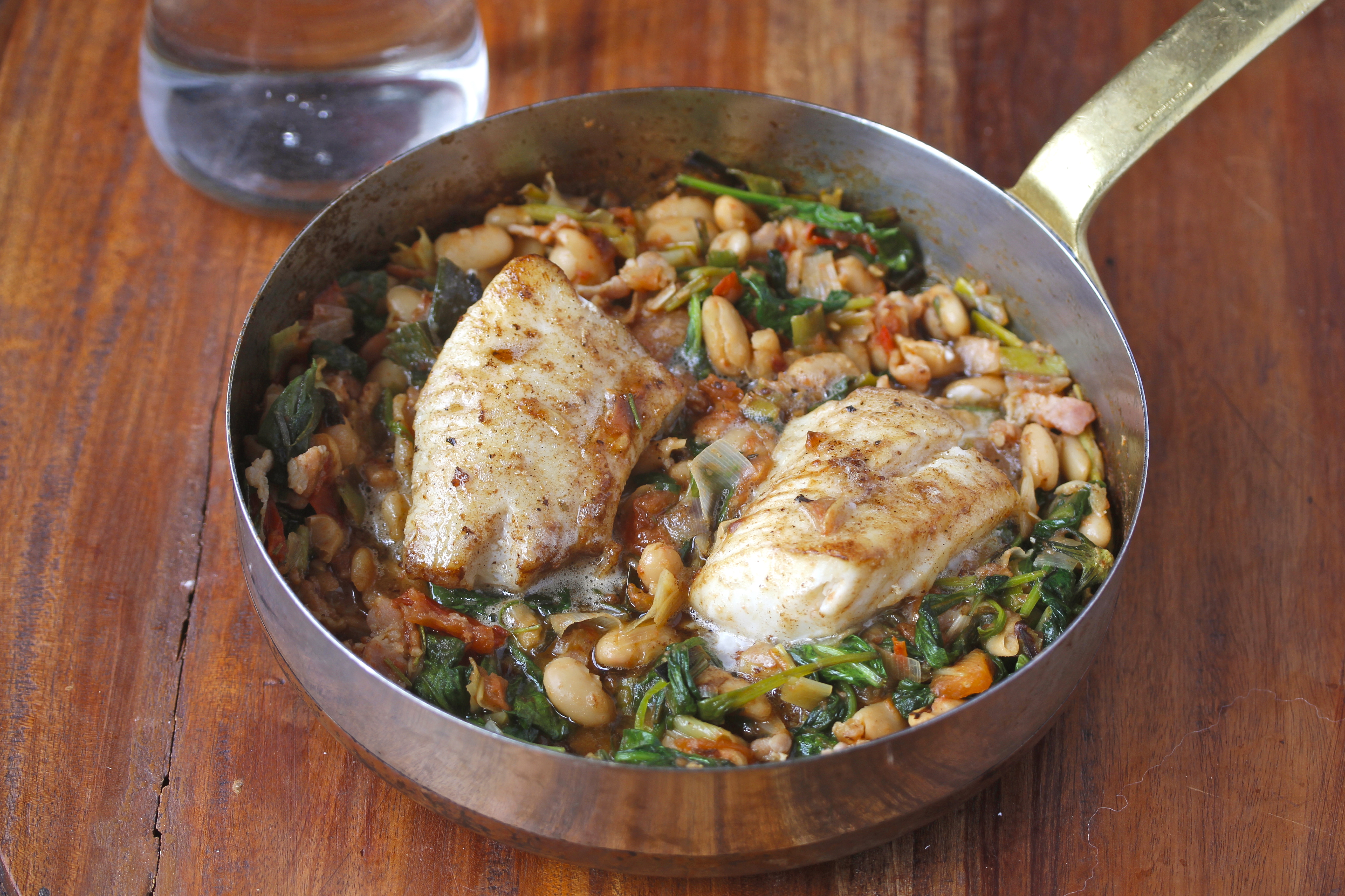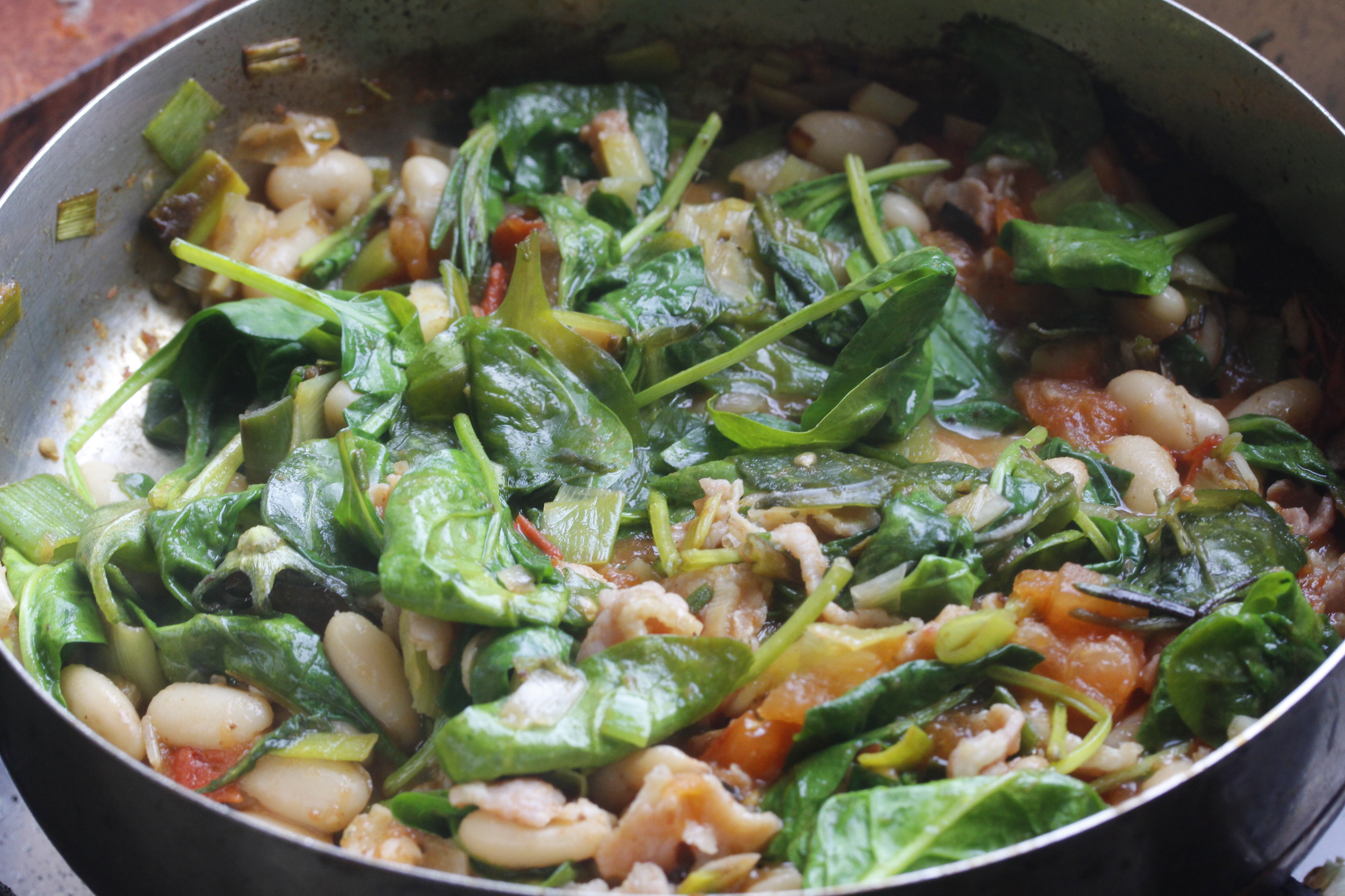 Ég átti bita af hlýra, sem er mikill uppáhaldsfiskur hjá mér þessa dagana en það má nota ýmsar fisktegundir – steinbít, löngu, þorsk til dæmis. Jafnvel ýsu en ég er nú ekki mikið fyrir ýsu yfirleitt. Bitinn var svona 240 grömm, sem passar fínt fyrir mig með afgangi í nesti í vinnuna – en ef verið er að elda fyrir tvo mætti nota stærra stykki. Svo tók ég þrjár beikonsneiðar, einn lítinn blaðlauk (reyndar úr innkaupapokanum um daginn), væna lúkufylli af spínati, tvo bústna og vel þroskaða tómata, hálfa dós af cannellinibaunum (mættu vera aðrar baunir), eina rósmaríngrein (má nota aðrar kryddjurtir eða sleppa), einn vænan hvítlauksgeira, 2 msk af ólífuolíu, 2 tsk af smjöri, pipar, salt og smáklípu af chiliflögum.