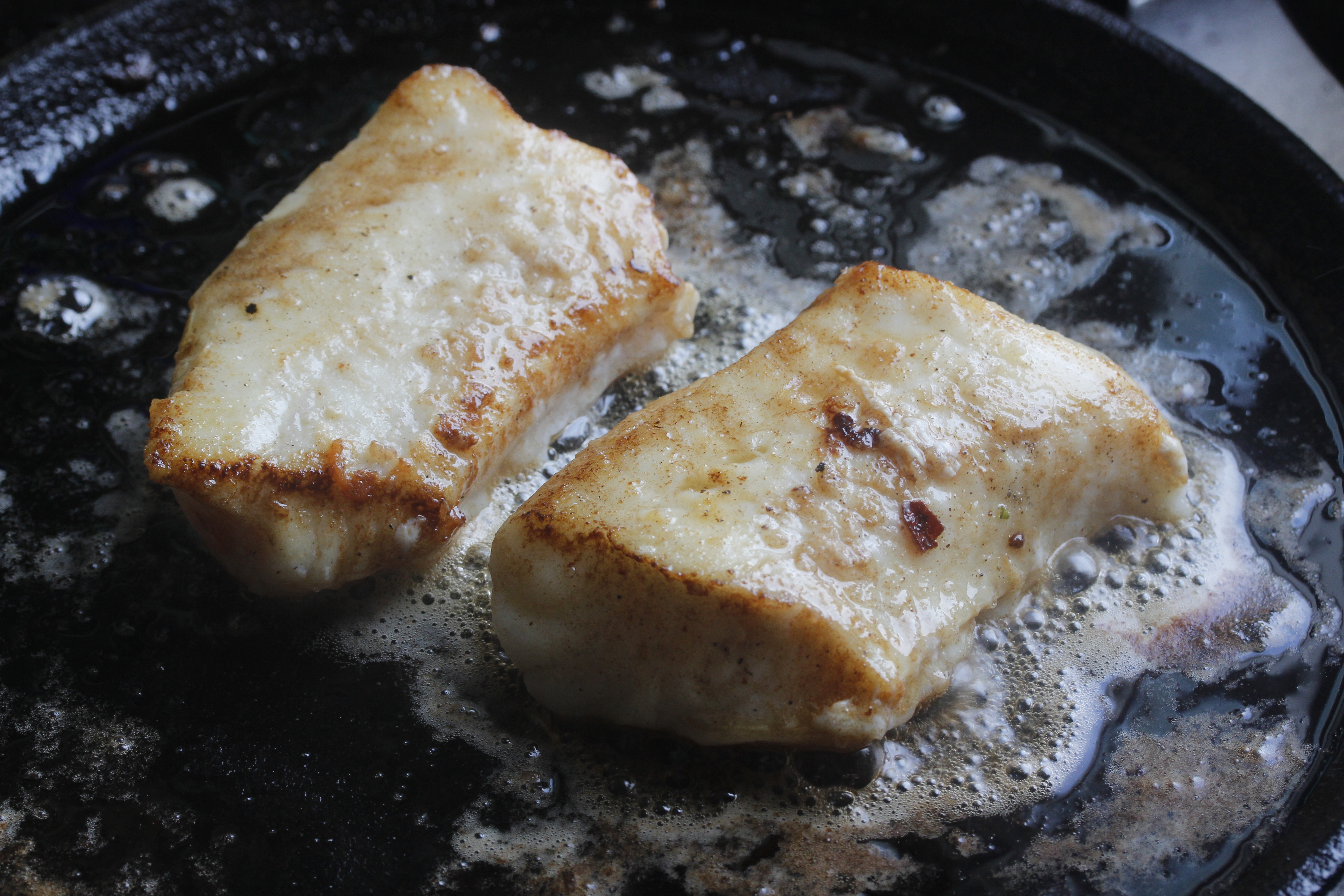 Á meðan grænmetið mallaði steikti ég fiskinn. Ég hitaði 1/2 msk af ólífuolíu og smjörið á pönnu, kryddaði fiskinn með pipar og salti og steikti hann í 2 1/2 – 3 mínútur á hvorri hlið (eftir þykkt) við ríflega meðalhita.