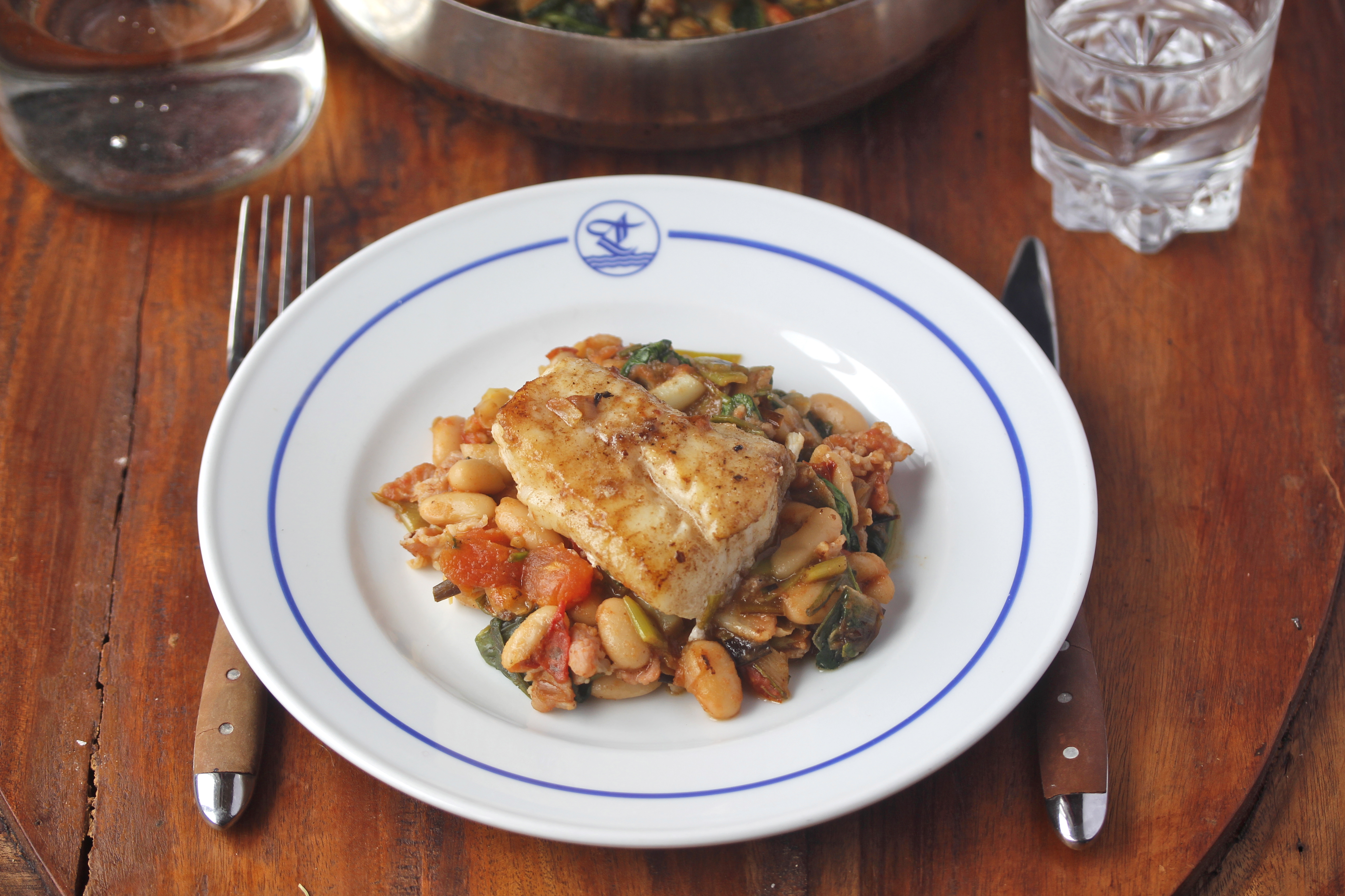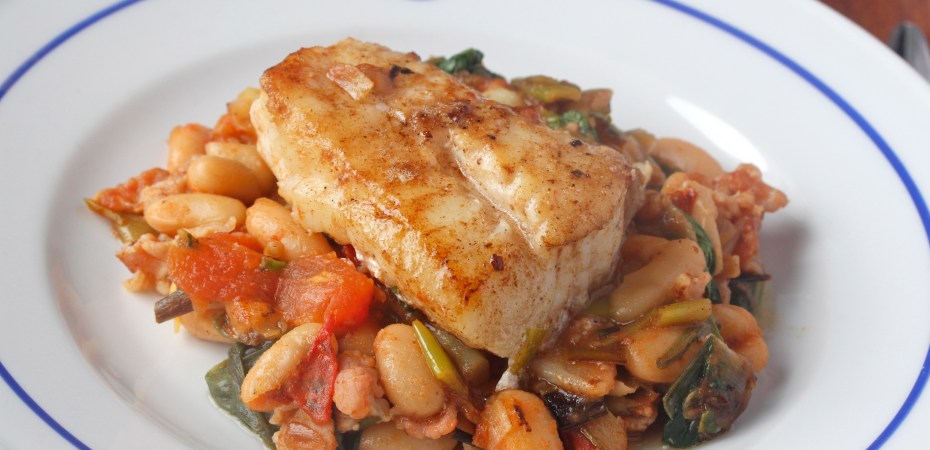 Steikur fiskur með tómötum, beikoni og baunum