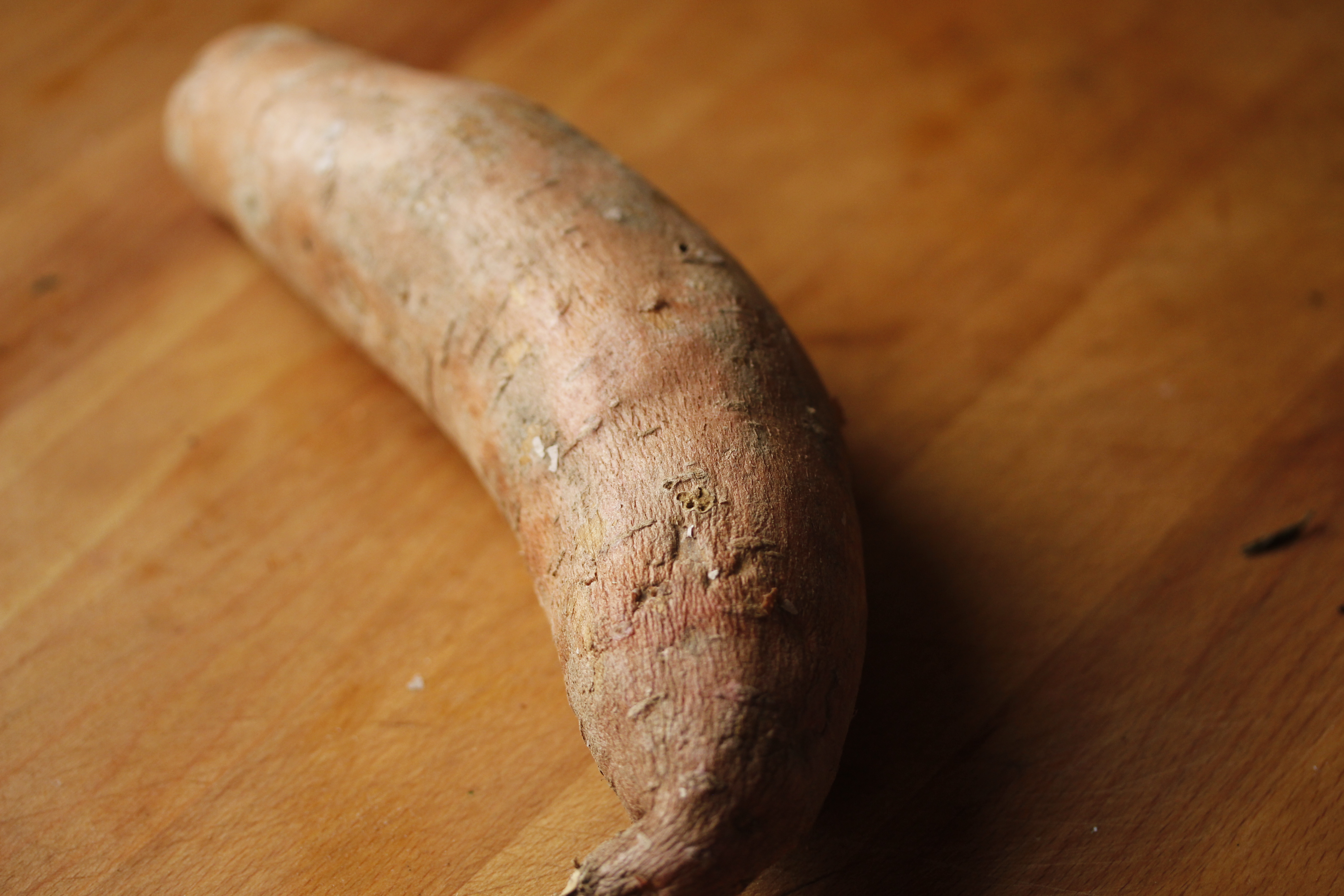 Þetta er sætkartöfluréttur og kartaflan þarf að vera frekar mjó svo að sneiðarnar verði ekki of stórar. Ég var með langa og mjóa kartöflu sem var um 500 g en það mætti nota tvær minni; aðalatriðið er að þær séu ekki of sverar. Ég þvoði og þerraið kartöfluna en flysjaði hana ekki áður en ég bakaði hana. Þa má auðvitað alveg gera það en hýðið verður stökkt og gott, nema það sé þeim mun þykkara. En ég skar hana í sneiðar, svona 8 mm-1 cm þykkar; fékk svona 18 sneiðar úr kartöflunni (notaði ekki bláendana).