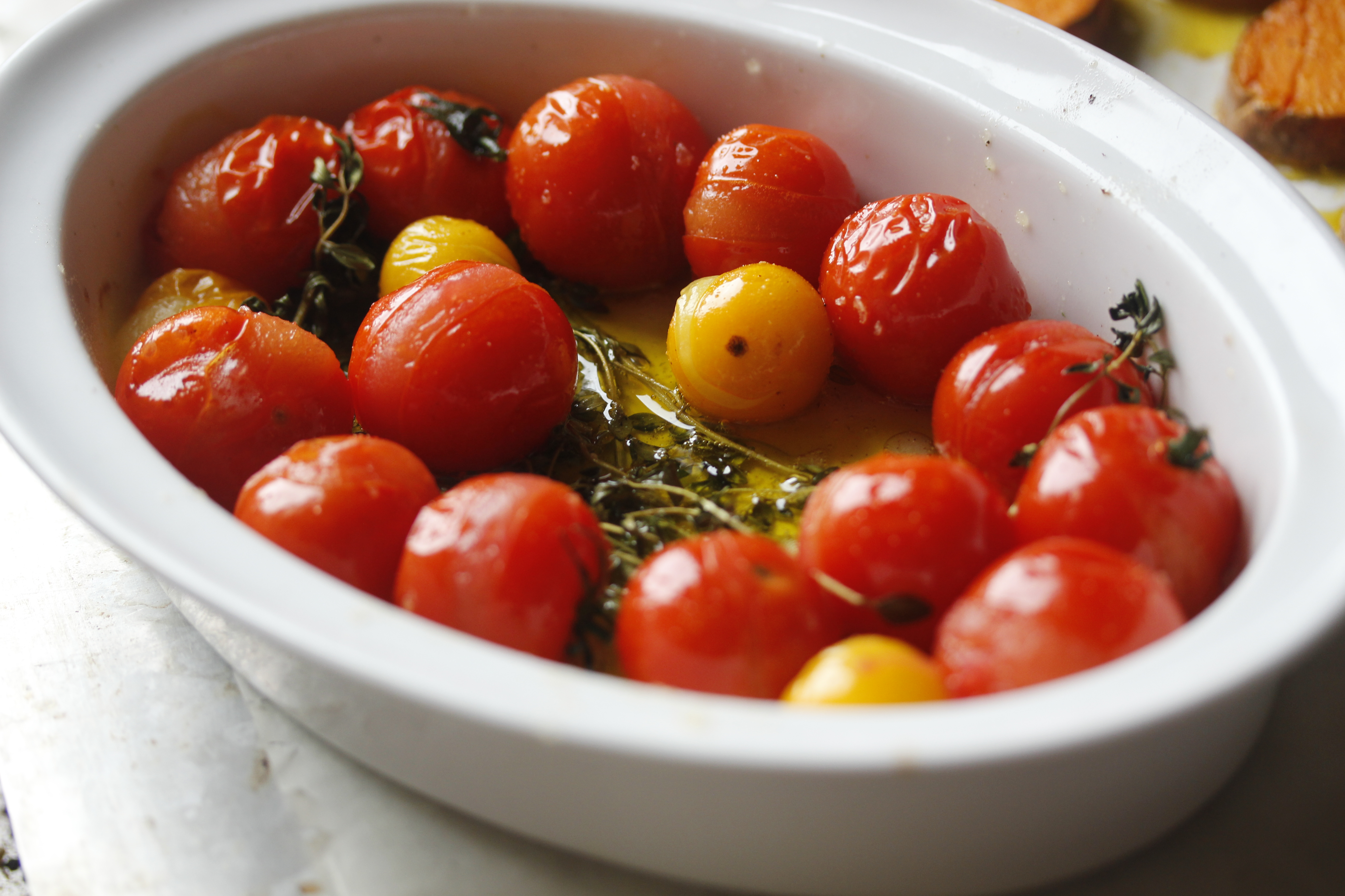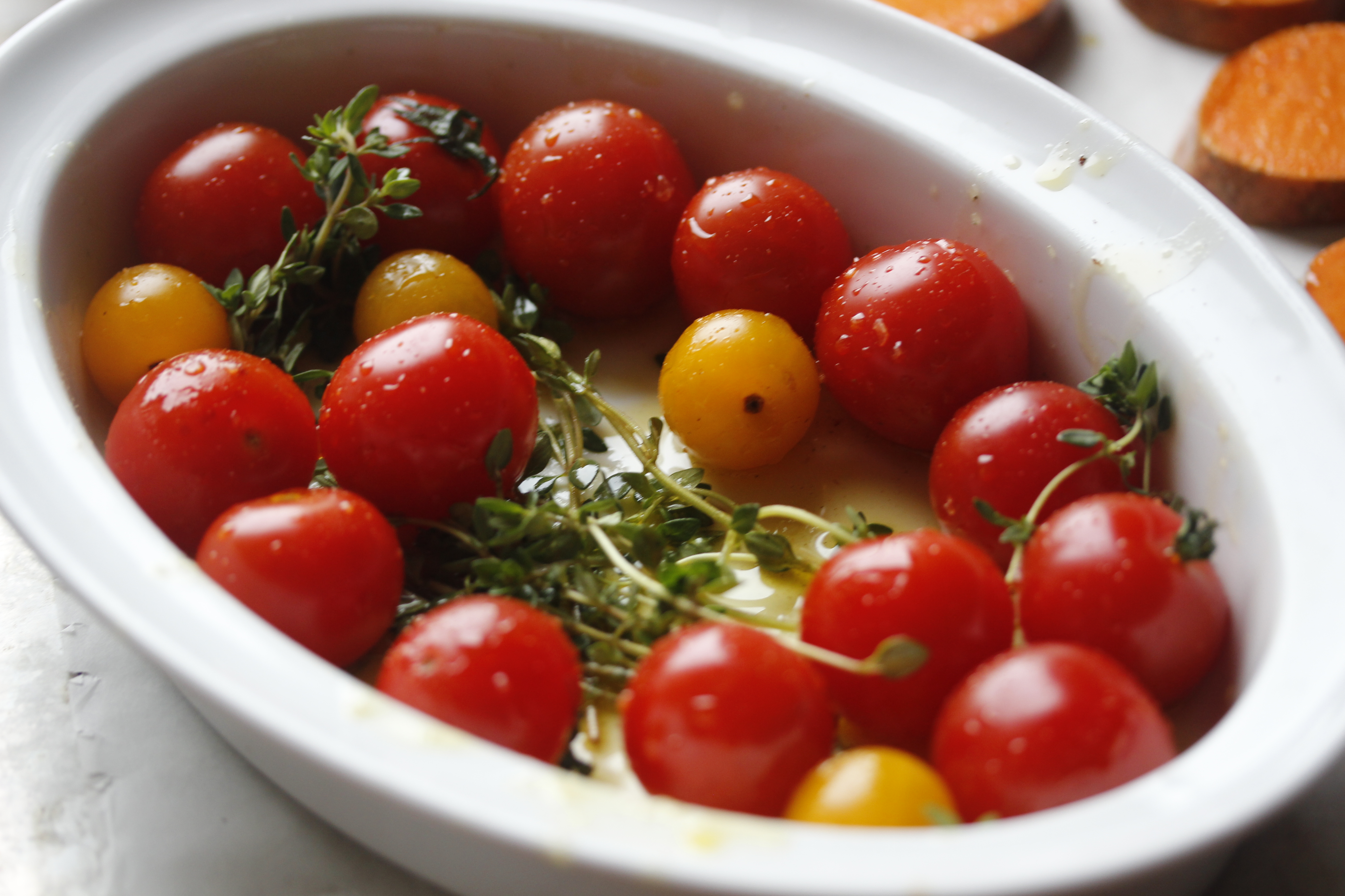 Svo tók ég svona 250 g af kirsiberjatómötum. Það vildi svo til að ég átti fáeina gula kirsiberjatómata sem ég notaði með þeim rauðu, það kemur skemmtilega út. Ég velti tómötunum upp úr olíunni sem eftir var í skálinni, hellti þeim svo í lítið, eldfast mót og bætti við nokkrum timjangreinum (eða dálitlu þurrkuðu timjani). Setti mótið bara á plötuna með kartöflunum, það rúmaðist alveg, en það mætti líka setja það á grind yfir plötunni.