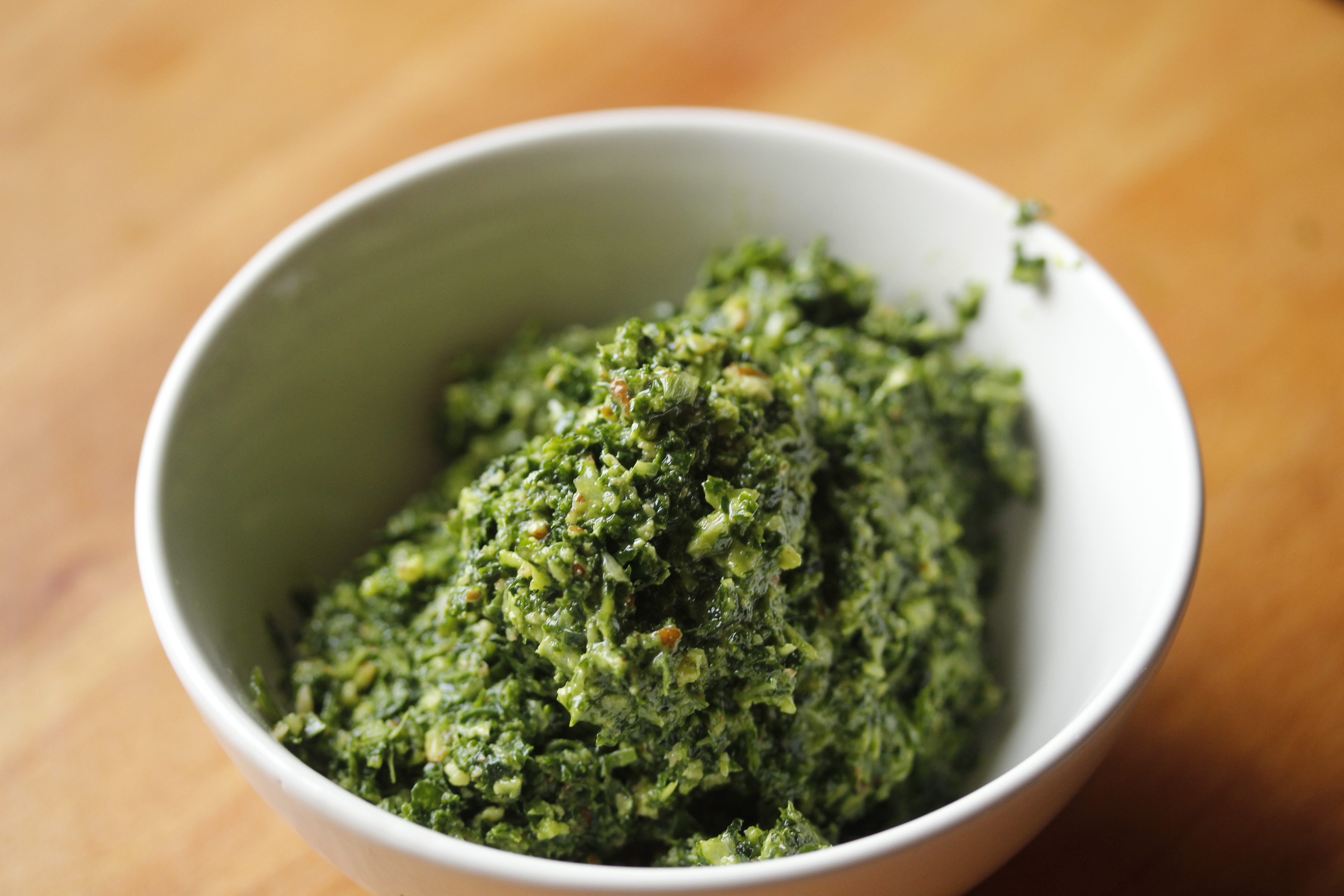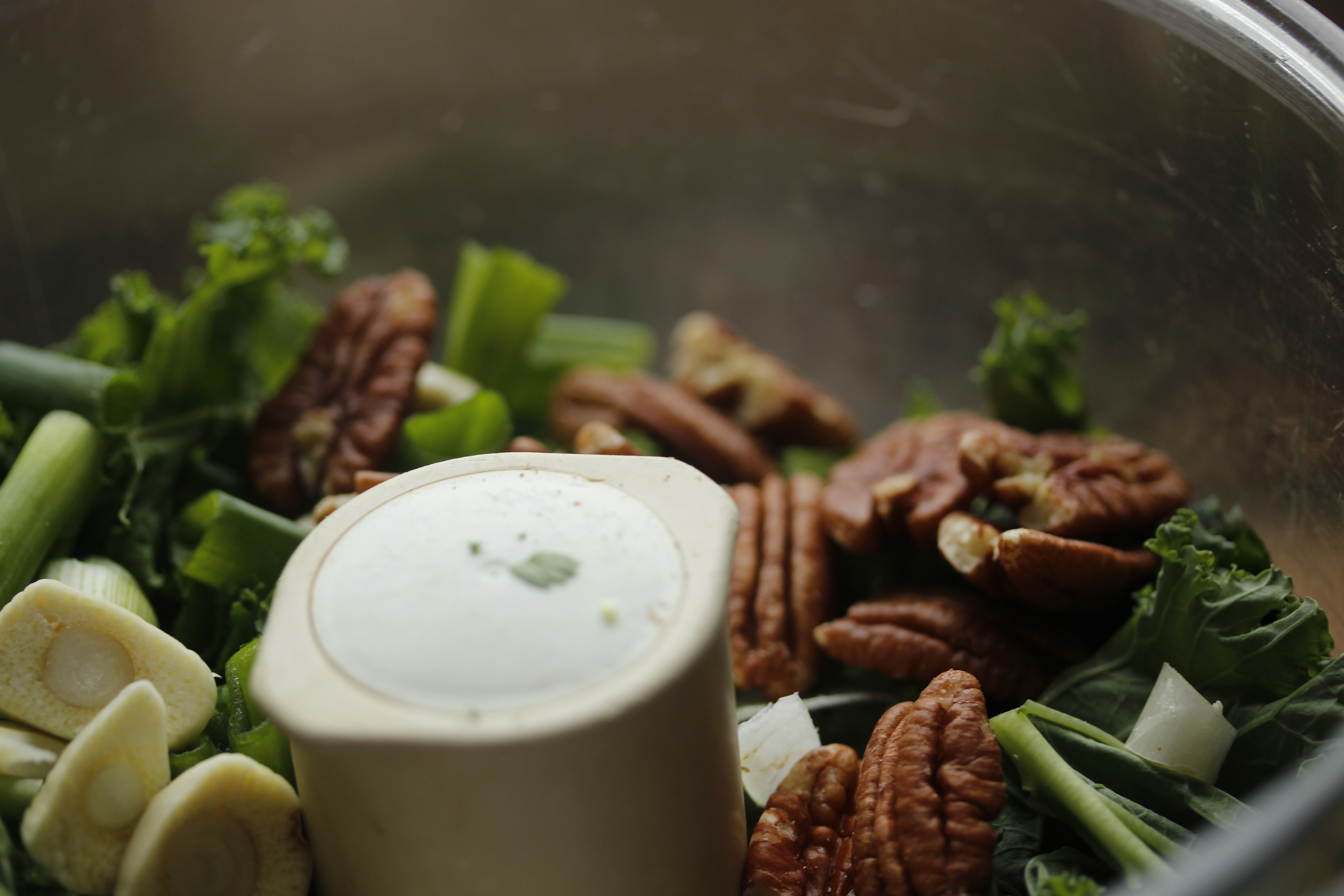 Á meðan grænmetið bakaðist bjó ég til grænkáls-steinseljumauk til að hafa með því. Ég tók 75 g af grænkáli og skar stönglana úr blöðunum, grófsaxaiu þau og setti þau í matvinnsluvél ásamt hellu knippi af flatblaðssteinselju, einum vorlauk, tveimur hvítlauksgeirum, 25 g af pekanhnetum (mega vera valhnetur), safa úr 1/2 sítrónu, pipar og salti.