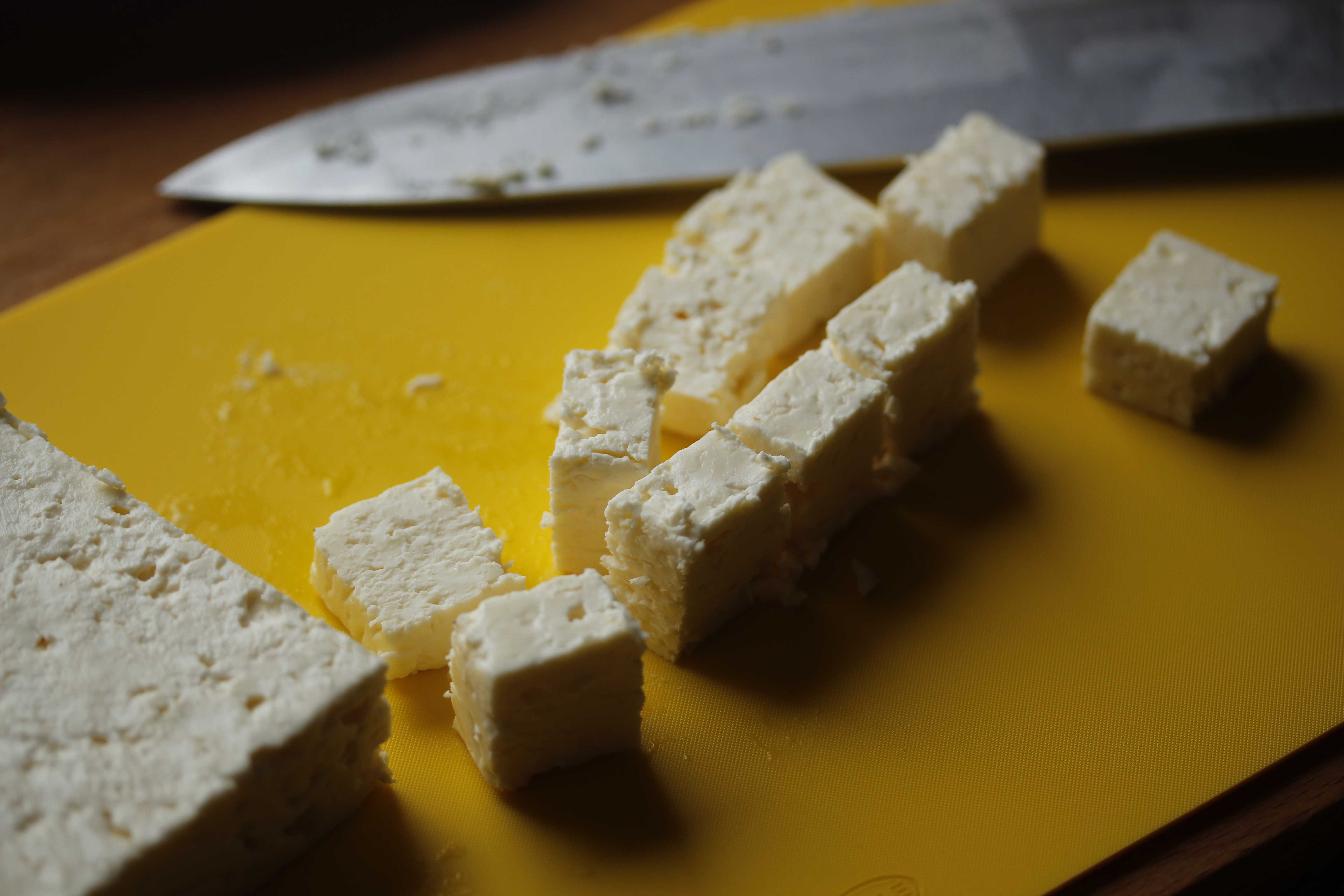 Ég tók svo fetaostskubb og skar hluta af honum (ekki allan, kannski svona 100 g) í teninga, jafnmarga kartöfusneiðunum.