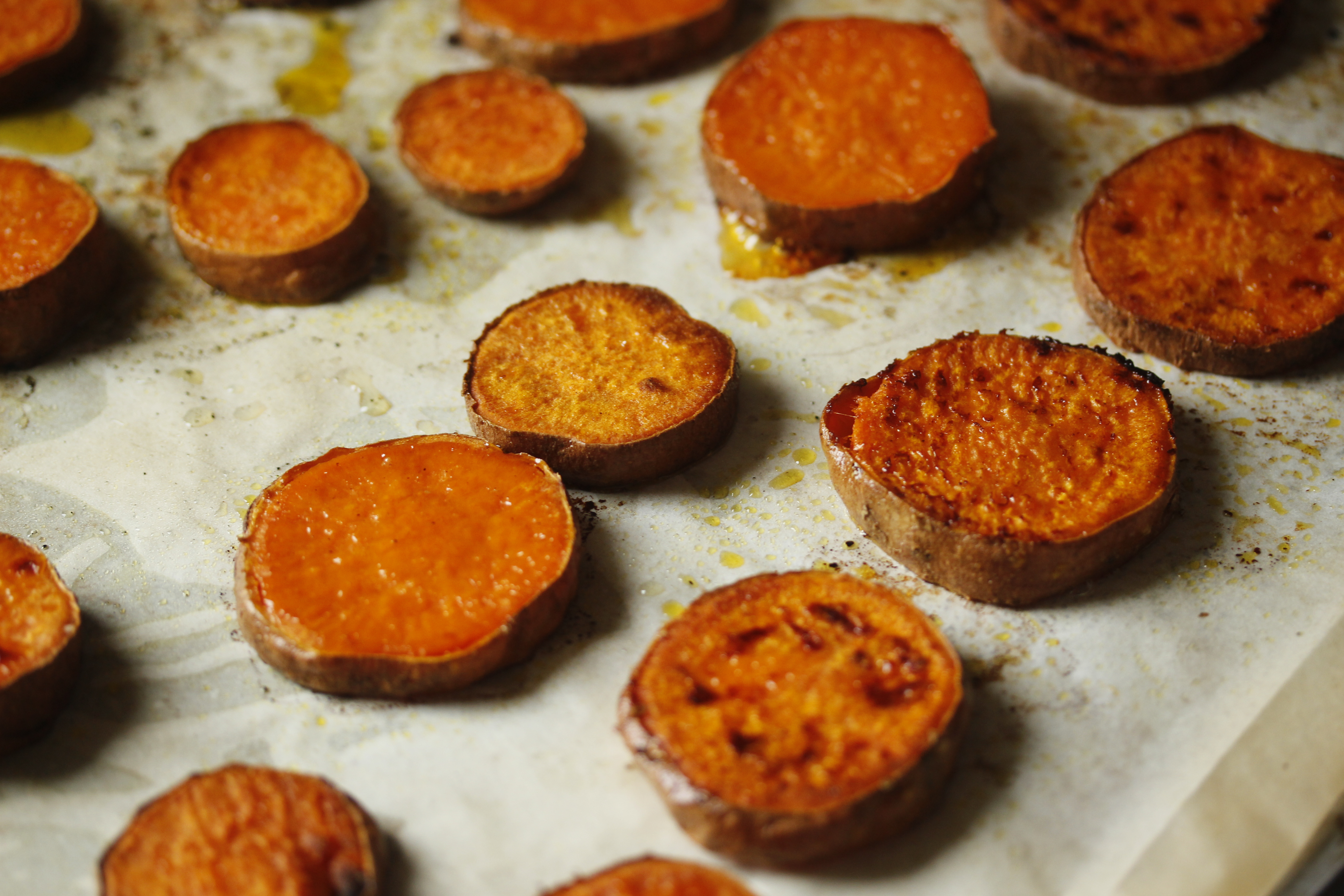 Svo setti ég 3 msk af ólífu í skál ásamt pipar og salti og velti sætkartöflusneiðunum upp úr henni. Raðaði þeim síðan á pappírsklædda bökunarplötu.