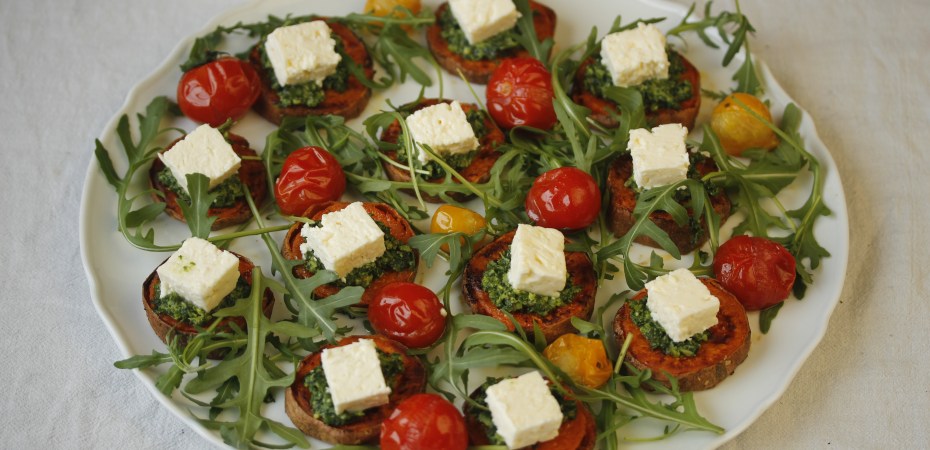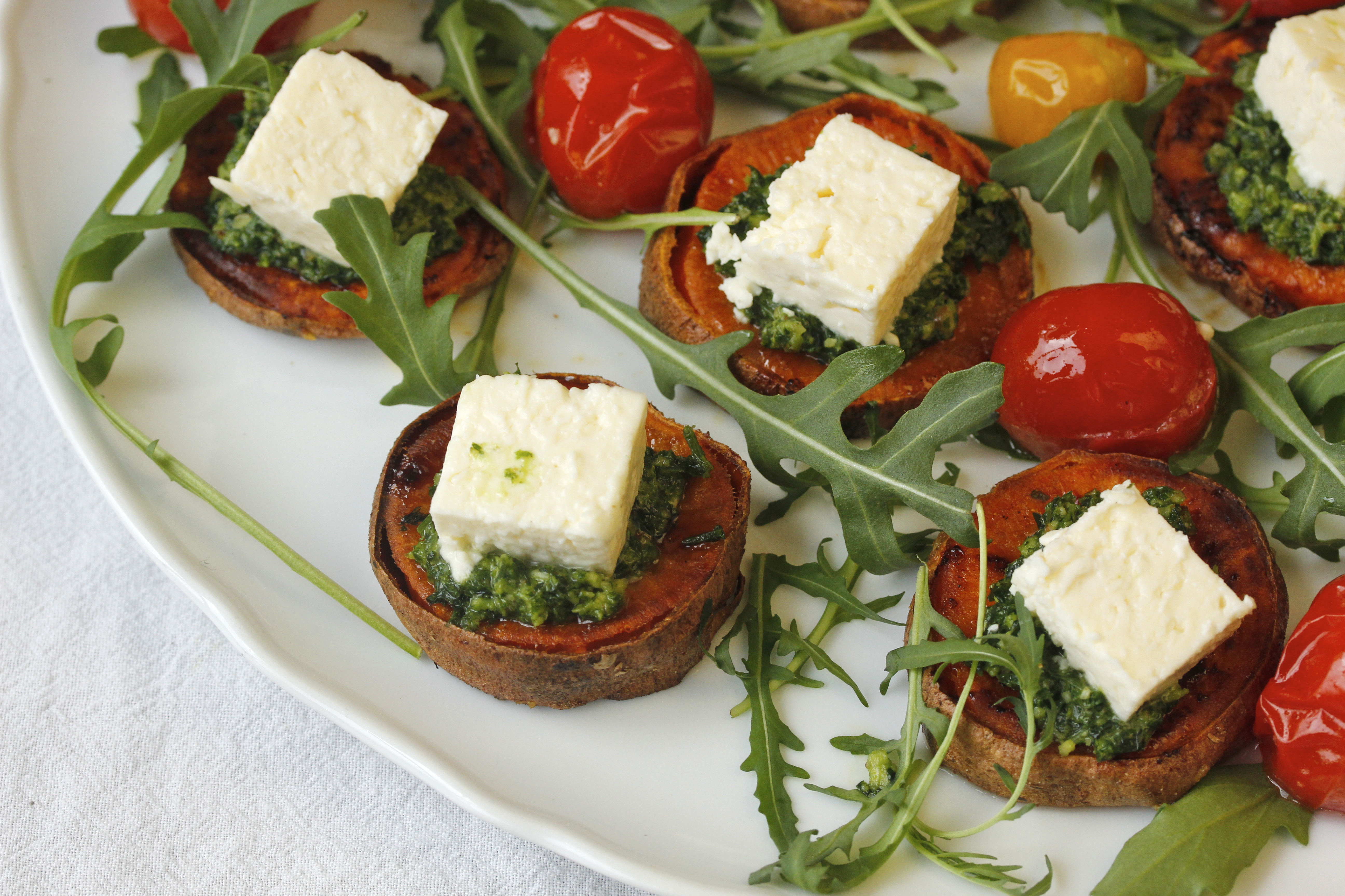 Þegar sætkartöflusneiðarnar voru tilbúnar lét ég þær kólna ögn. Raðaði þeim svo á fat og dreifði klettasalati og tómötum yfir og á milli. Settu teskeið af grænkálsmaukinu á hverja kartöflusneið og dálítinn fetaostsbita þar ofan á.