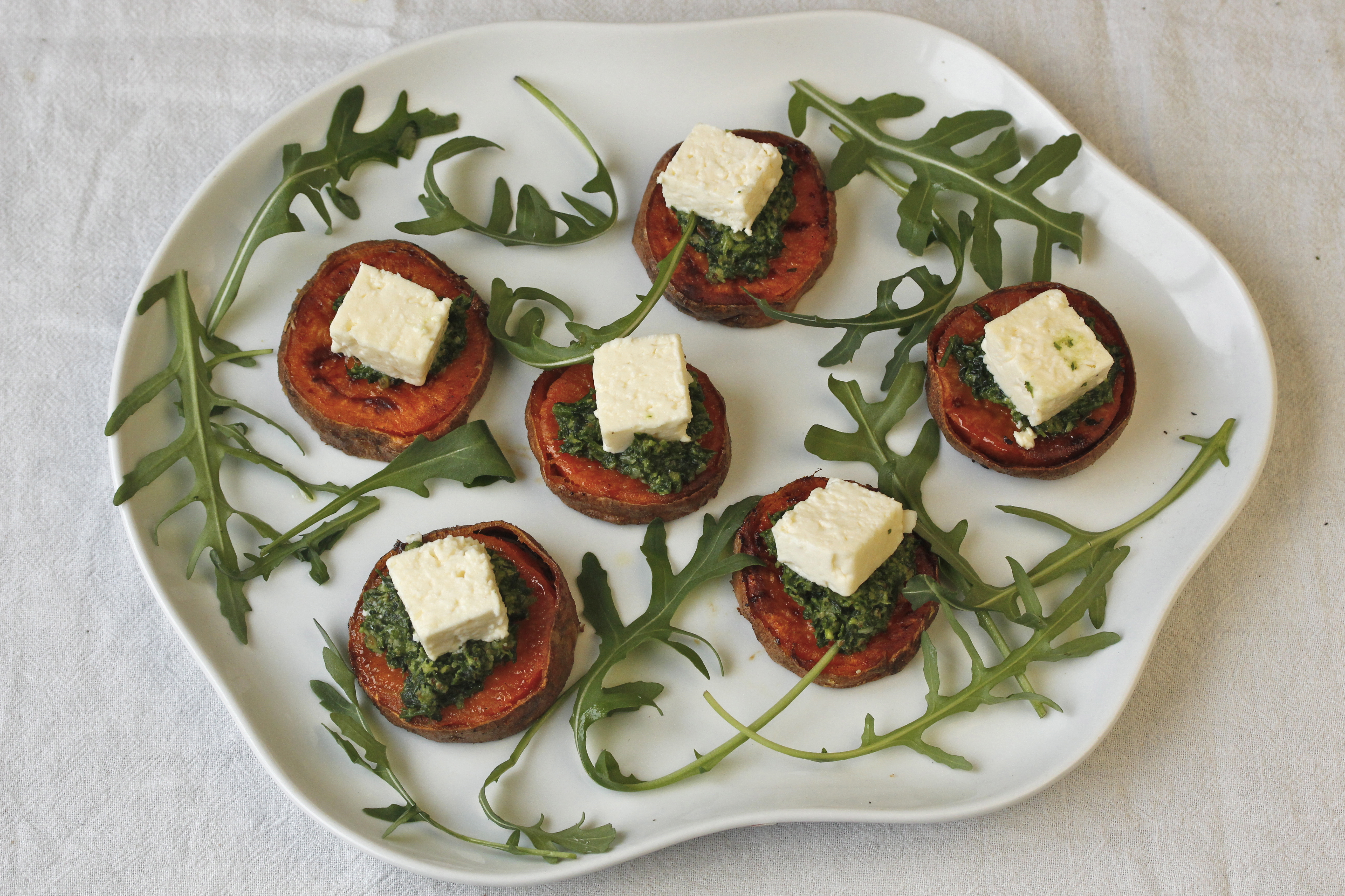 Sætkartöflusneiðar með grænkálsmauki, fetaosti og tómötum