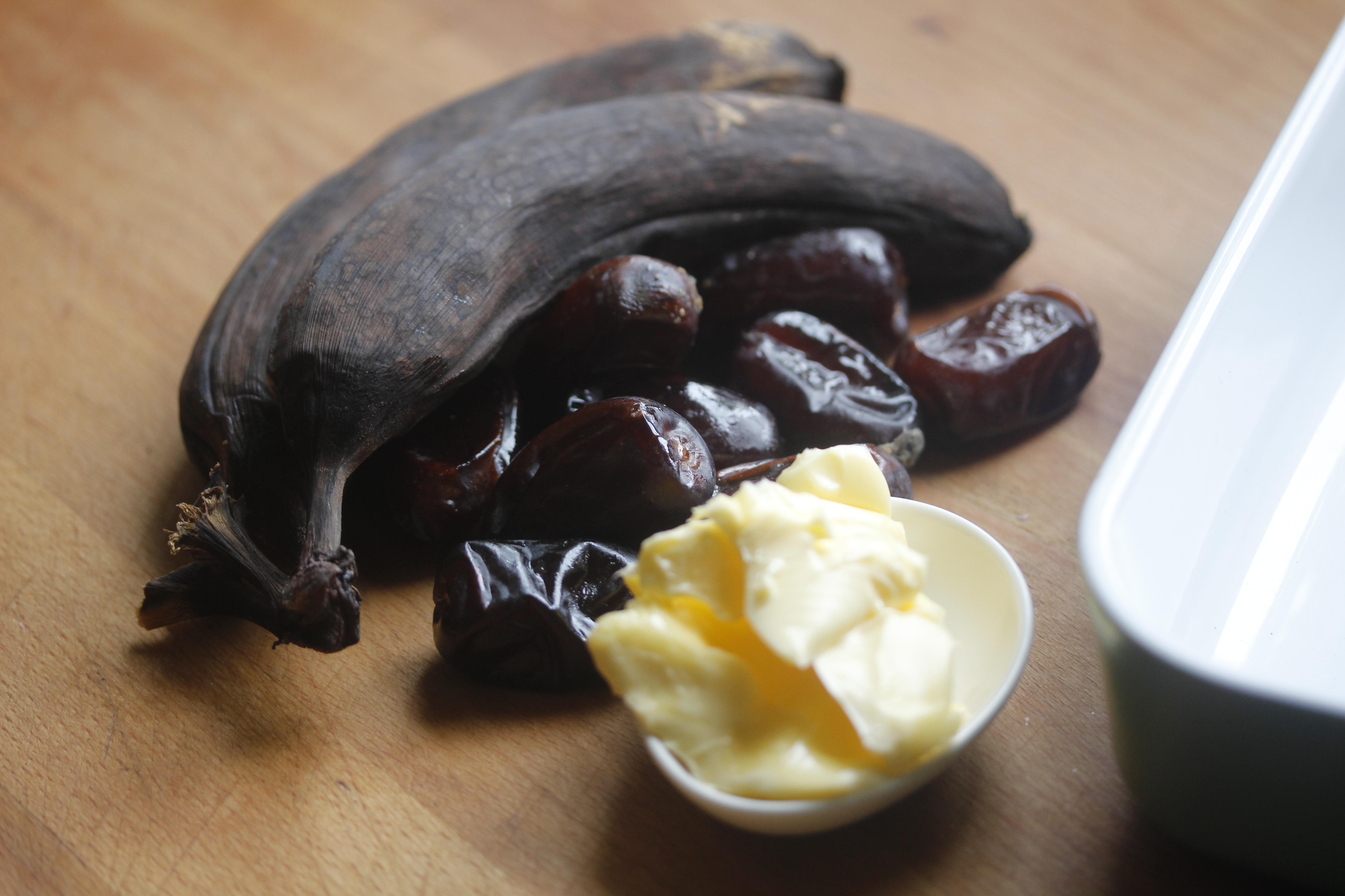 Ég kveikti á ofninum og hitaði hann í 180°C. Svo tók ég til þrjá banana (fremur litla reyndar) – og það vildi svo heppilega til að ég átti einmitt mjööööög vel þroskaða banana, svona eru þeir bestir í bakstur (sveimér ef ég finn ekki hreinlega ilminn af þeim bara með því að skrifa þetta – og tók líka til átta döðlur og 40 g af smjöri.