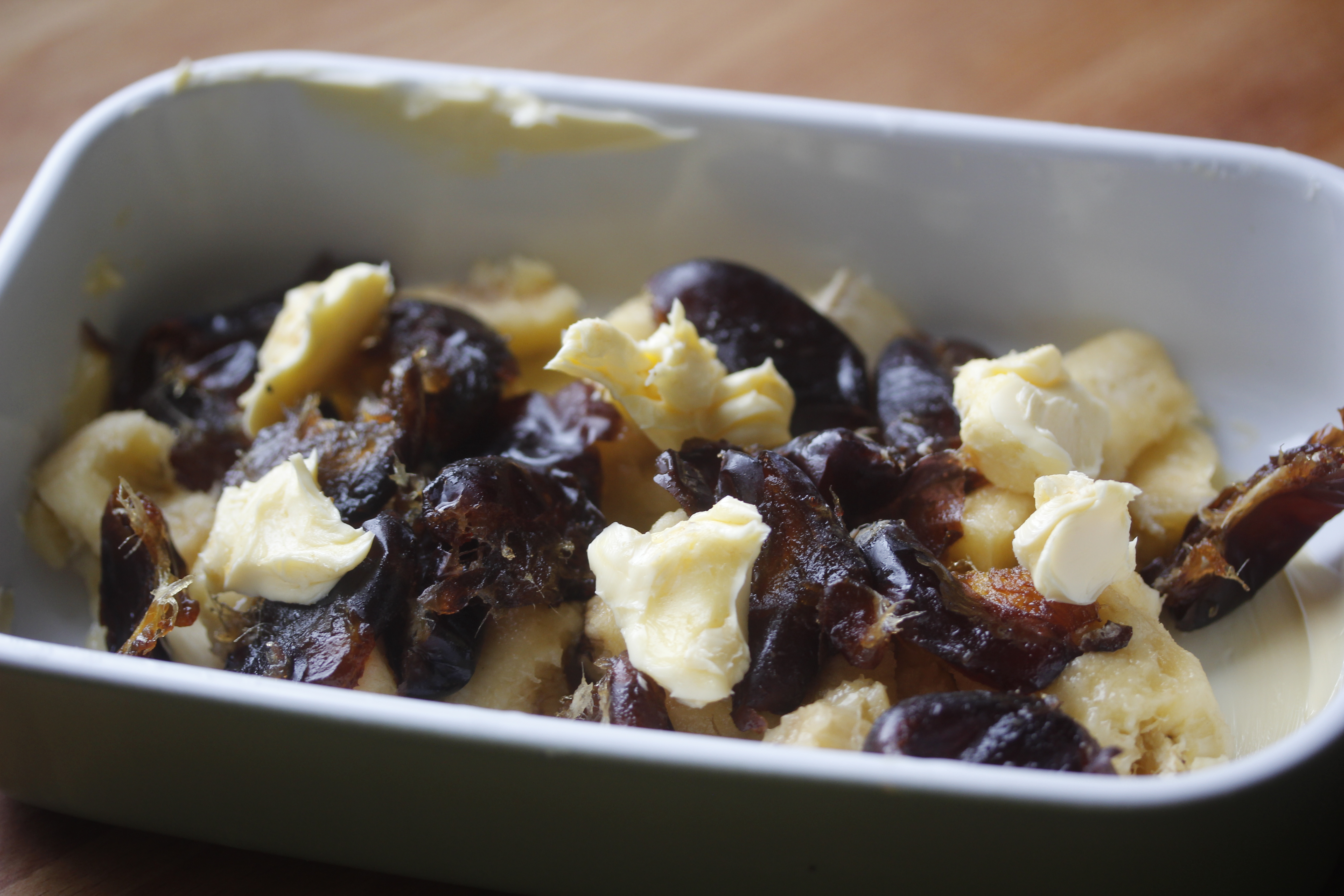 Ég smurði lítið, eldfast mót með dálitlu af smjörinu. Flysjaði bananana og reif þá í bita og steinhreinsaði döðlurnar og reif þær niður líka. Setti þetta í formið og dreifði smjörklípum yfir. Svo setti ég formið í ofninn og bakaði þetta í svona hálftíma.