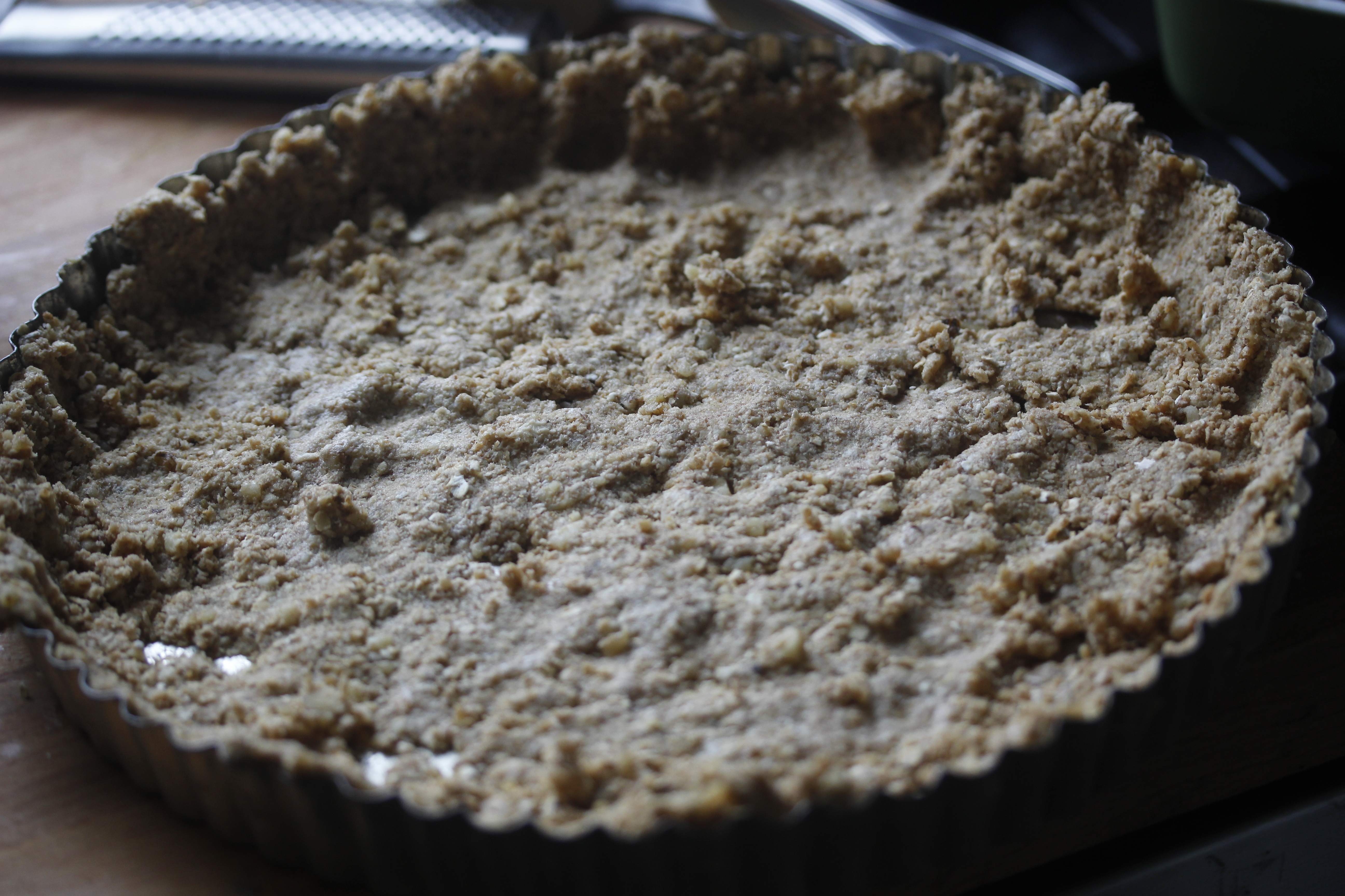 Ég tók fjórðunginn af mylsnunni (eða rúmlega það) frá en setti hitt í lausbotna bökuform og þrýsti mylsnunni með fingrunum upp með hliðunum og niður á botninn. Það gerir ekkert til þótt einhvers staðar séu smágöt.