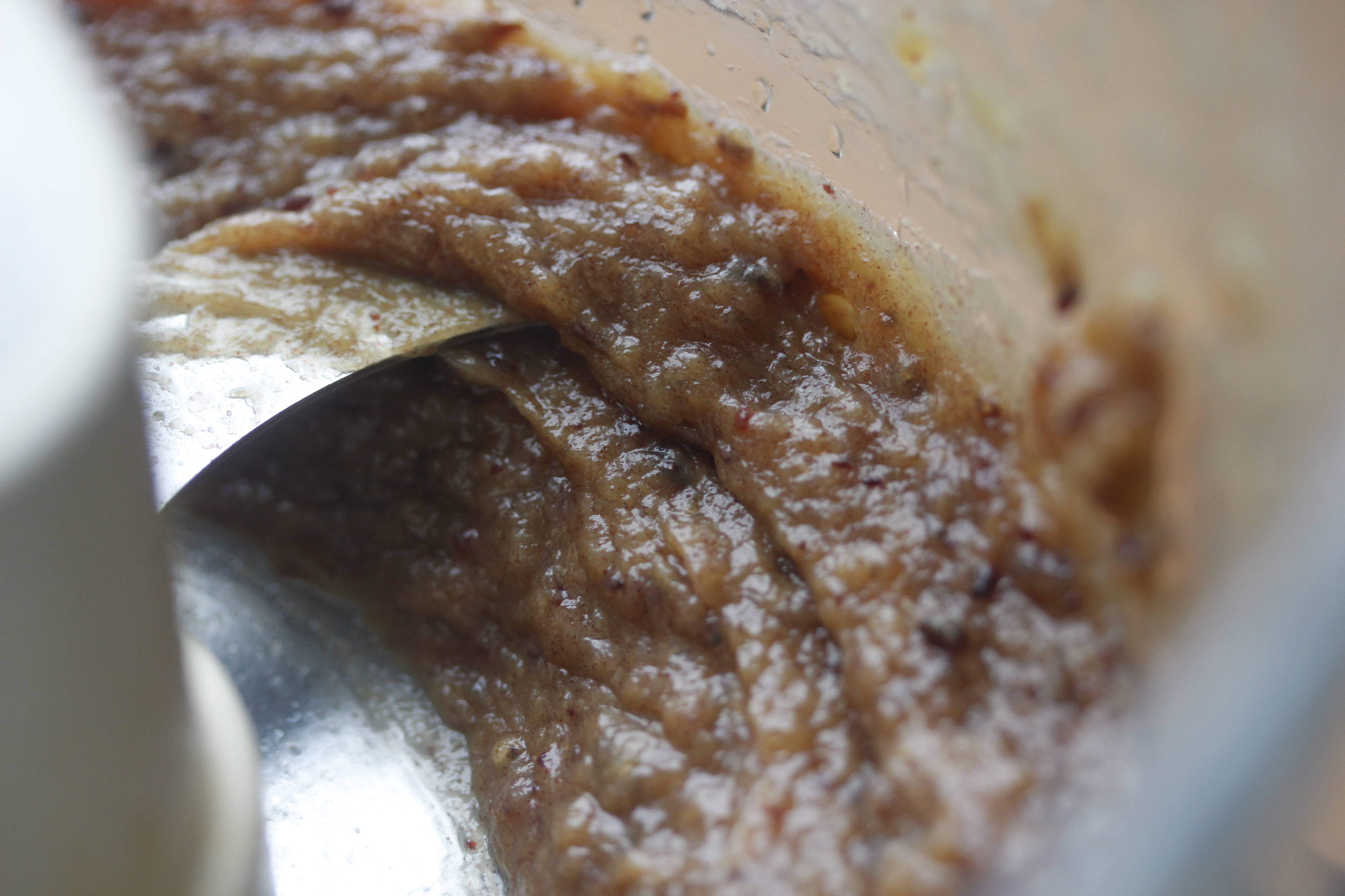 Ég tók bananadöðlublönduna úr ofninum og lét kólna í nokkrar mínútur. Hellti svo öllu úr forminu í matvinnsluvélina og maukaði vel.