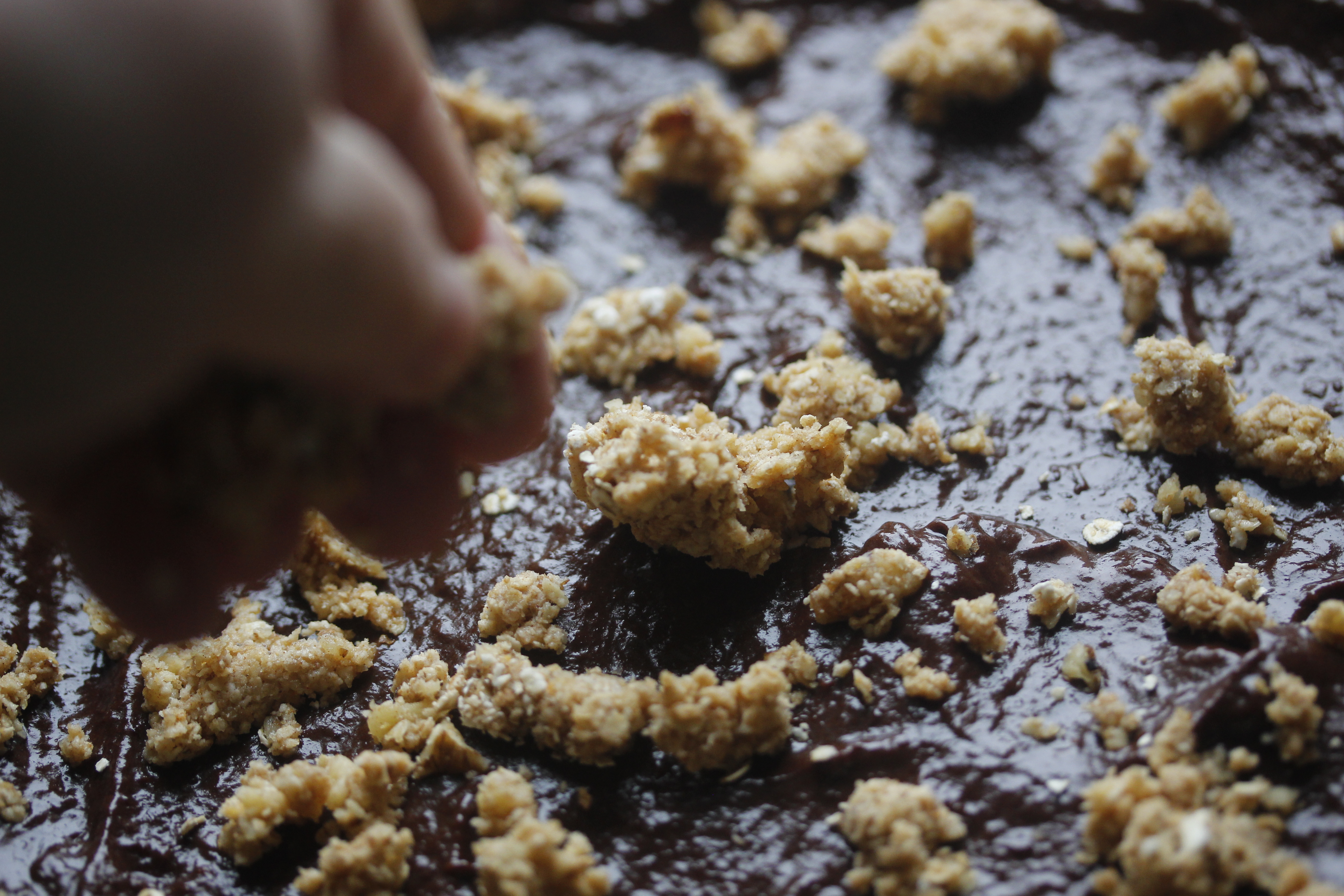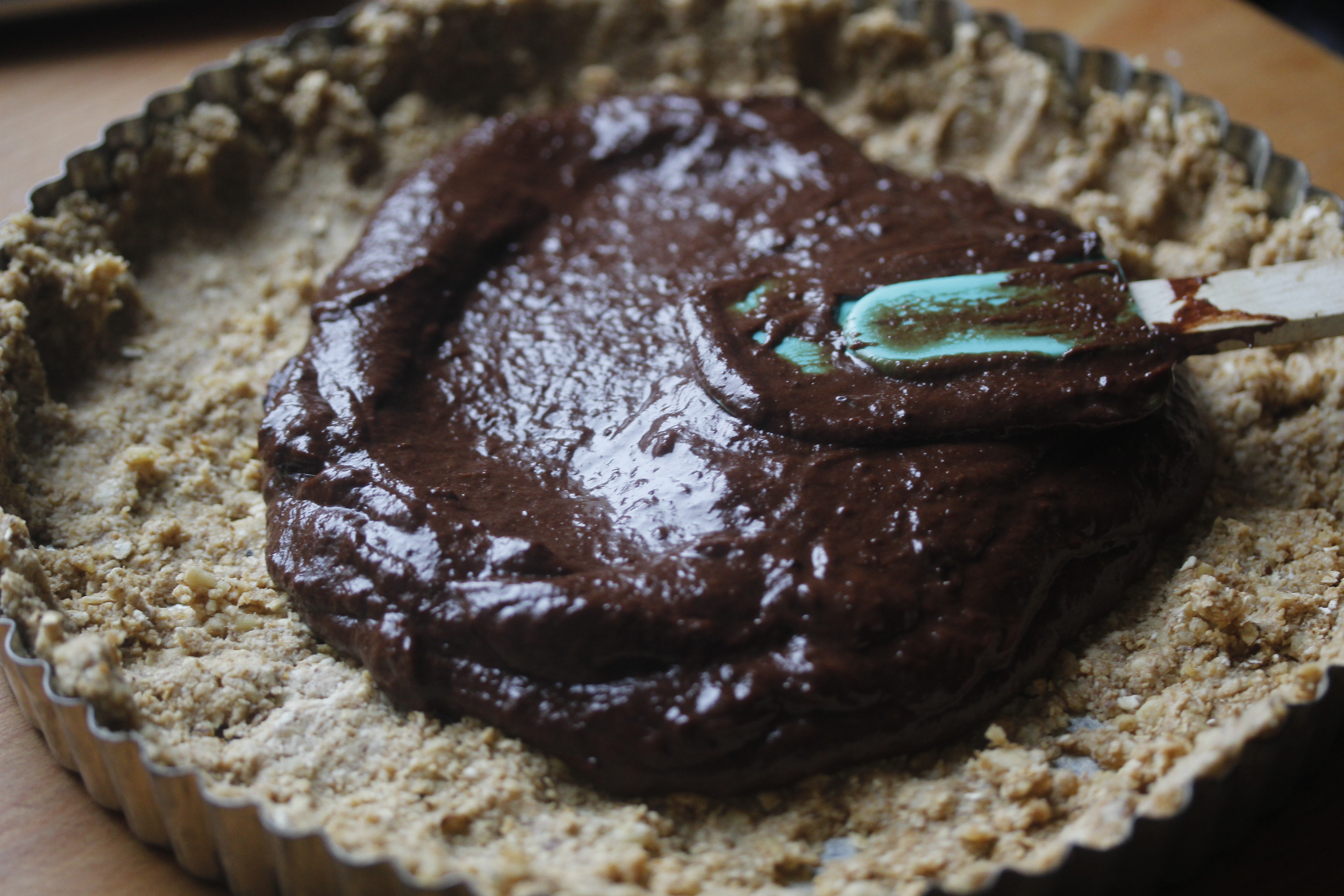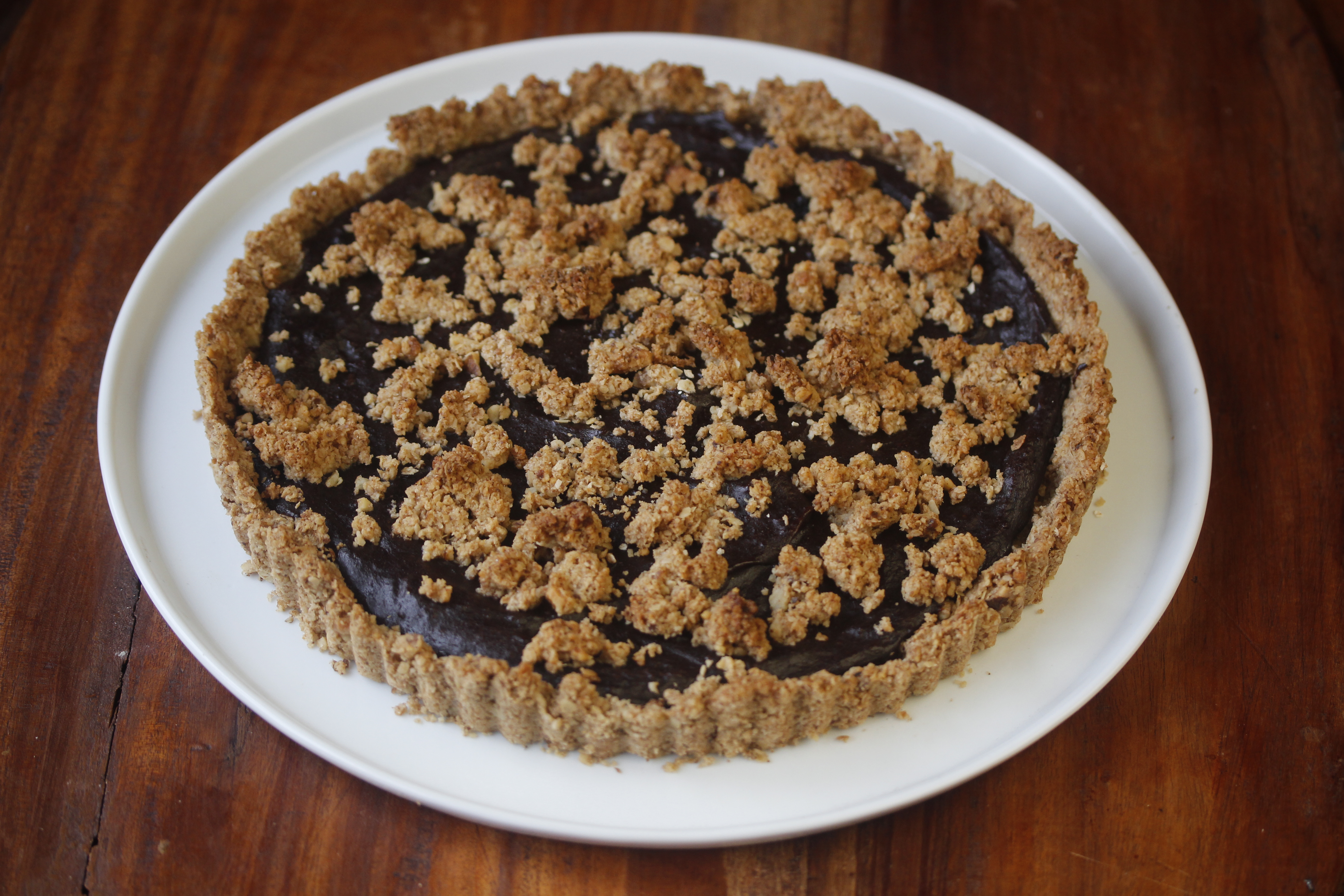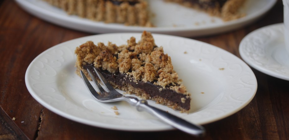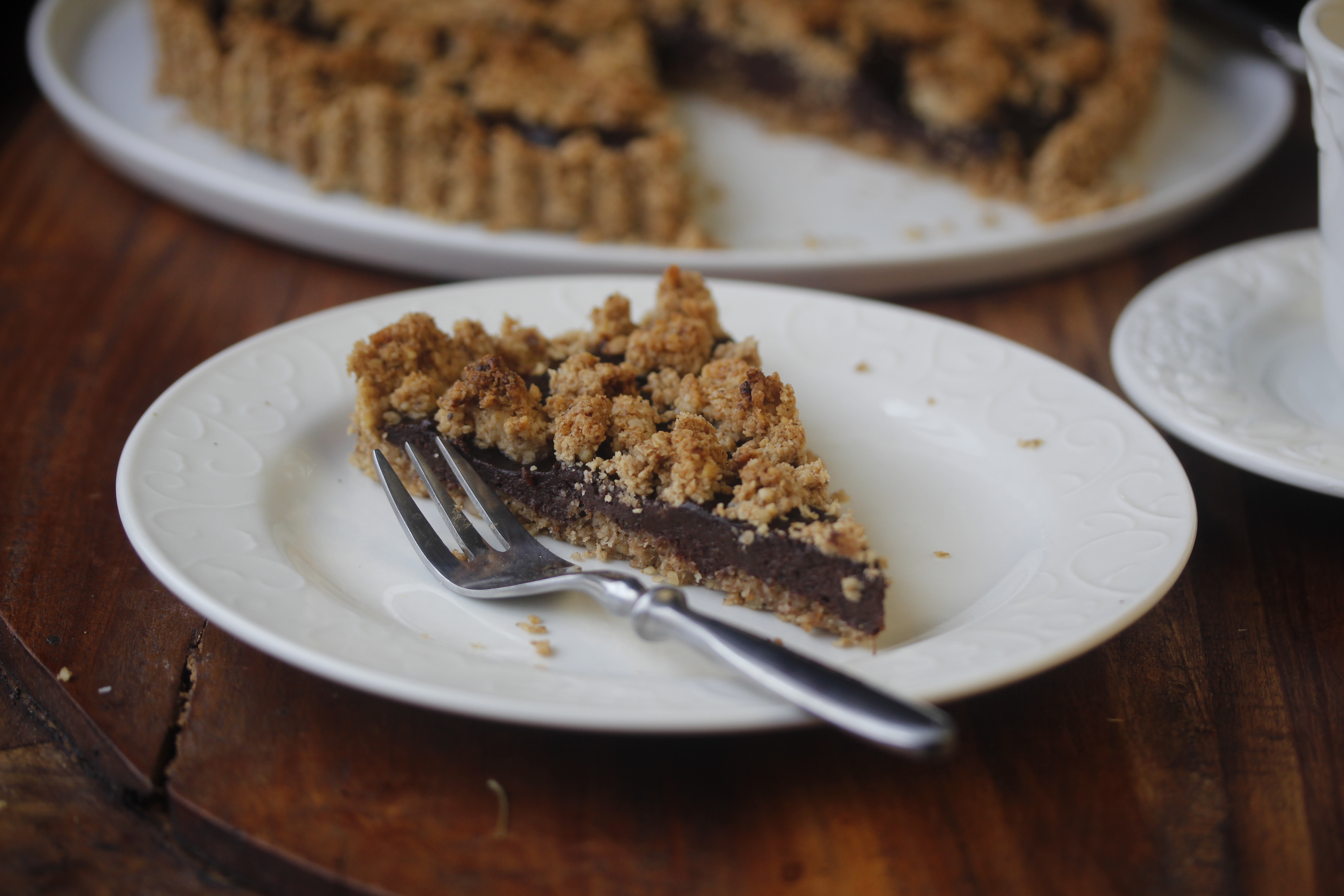 Og að lokum muldi ég mylsnuna sem ég hafði tekið frá yfir súkkulaðiblönduna með fingurgómunum. Setti svo bökuna í ofninn og bakaði hana á næstneðstu rim í 20-25 mínútur, eða þar til jaðarinn á kökunni og mylsnan eru fallega gullinbrún og fyllingin farin að stífna.