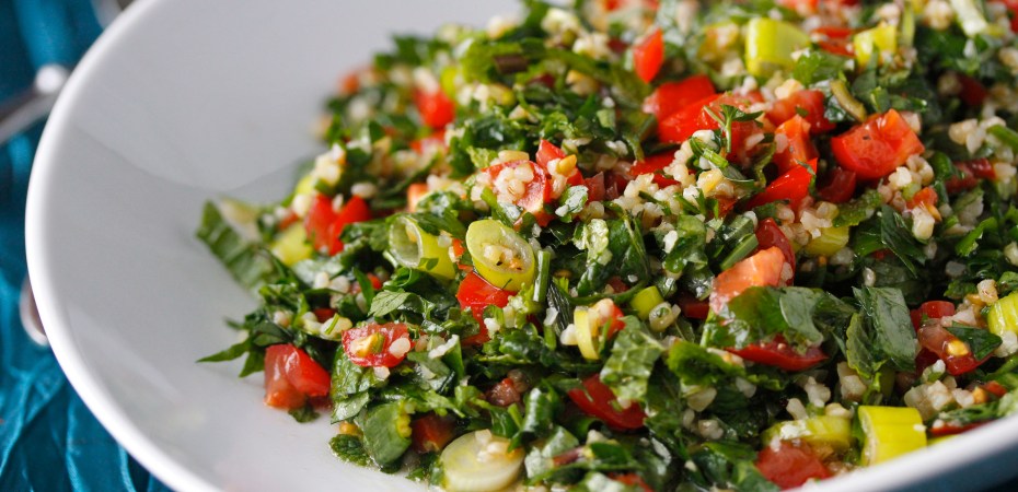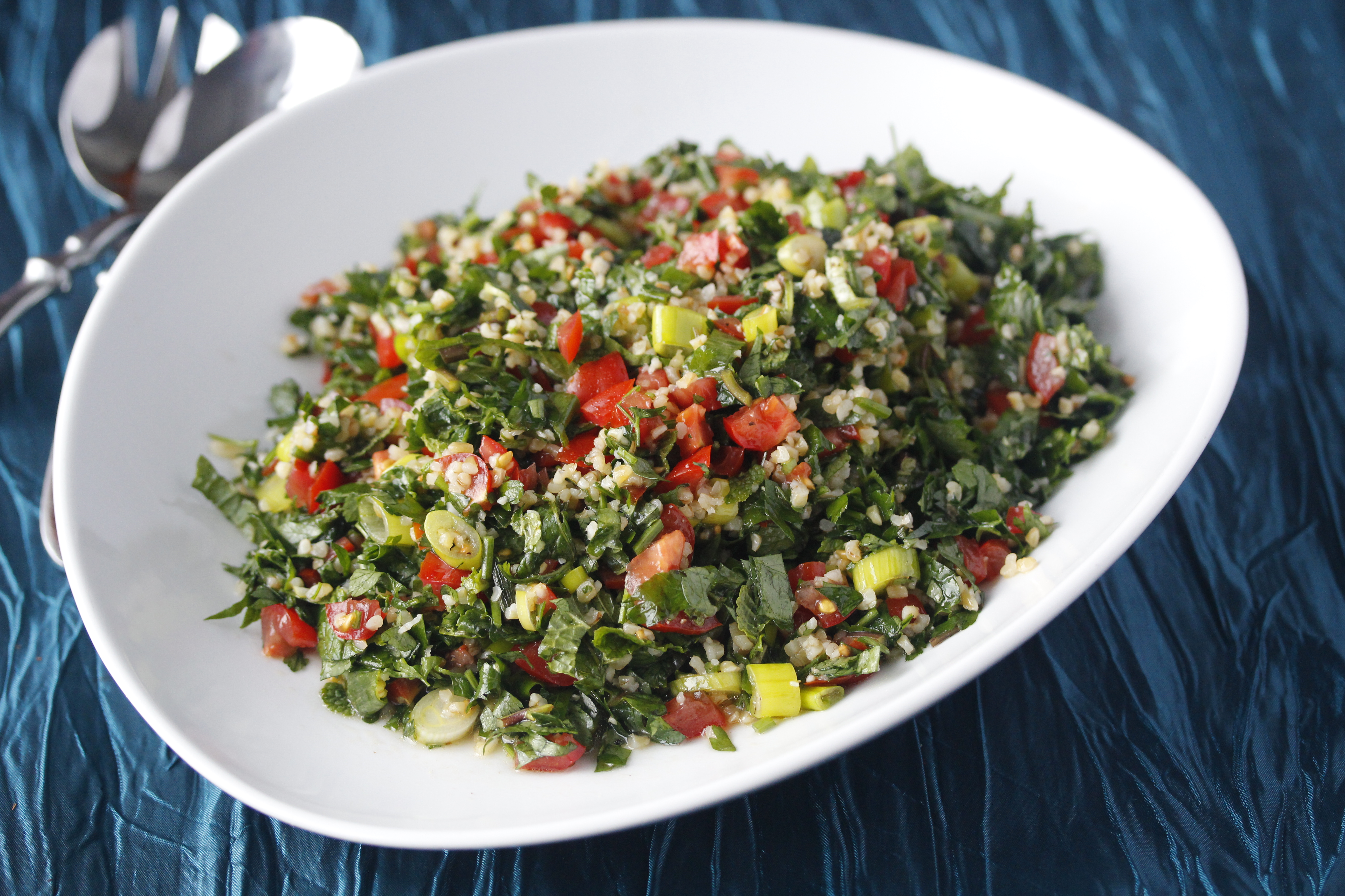 Tabbouleh er alþekkt kryddjurtasalat, sérlega frísklegt og gott, sem getur ýmist verið hluti af meze eða meðlæti með aðalréttum. Það er hægt að nota matvinnsluvél til að saxa kryddjurtirnar en þá er hætt við að salatið verði of maukkennt svo að vissara er að nota púlshnappinn á vélinni.