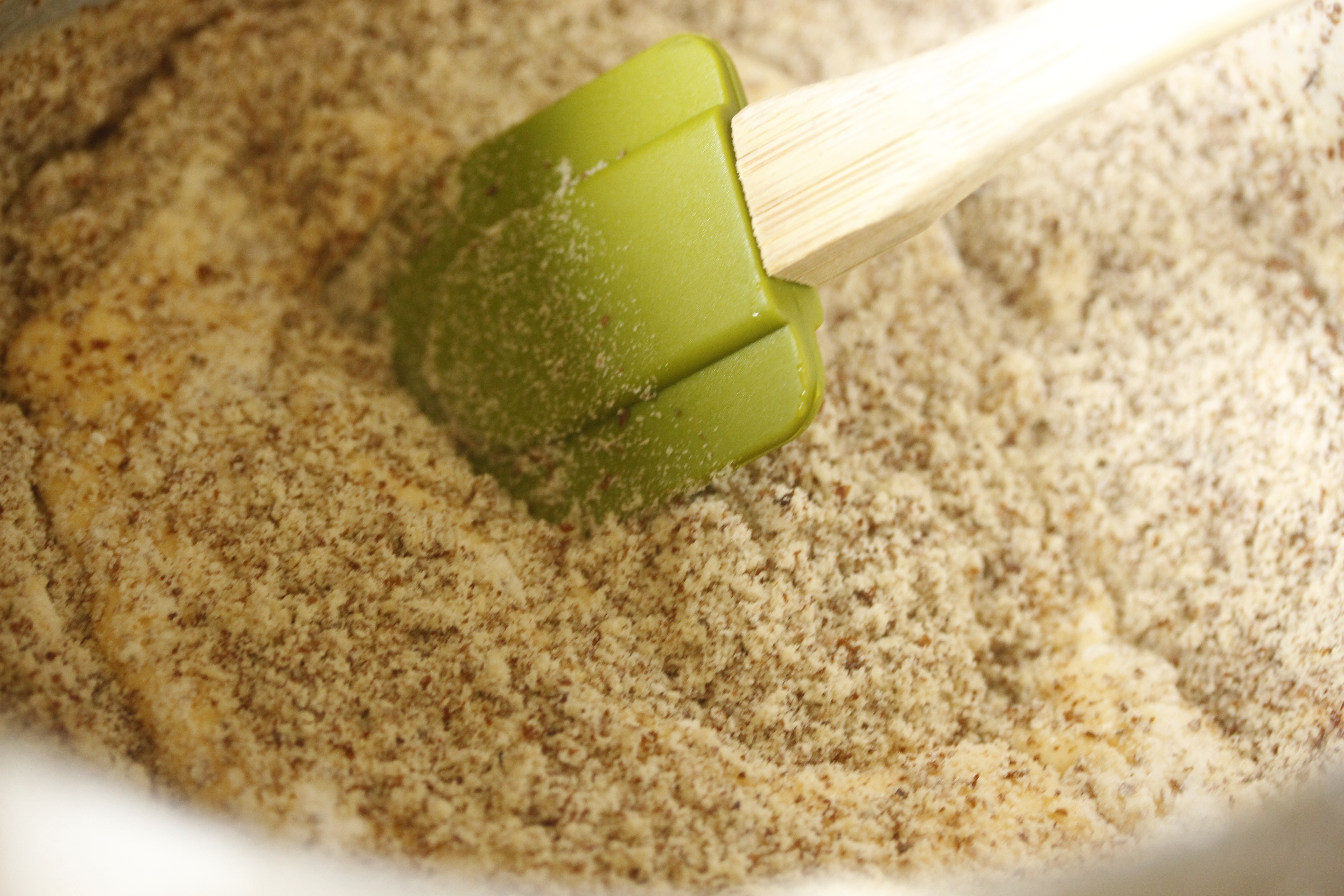 Svo blandaði ég 85 g af möndlumjöli, 25 g af kartöflumjöli og 1 tsk af lyftidufti vel saman í skál, setti út í eggjahræruna og blandaði gætilega saman við með sleikju.