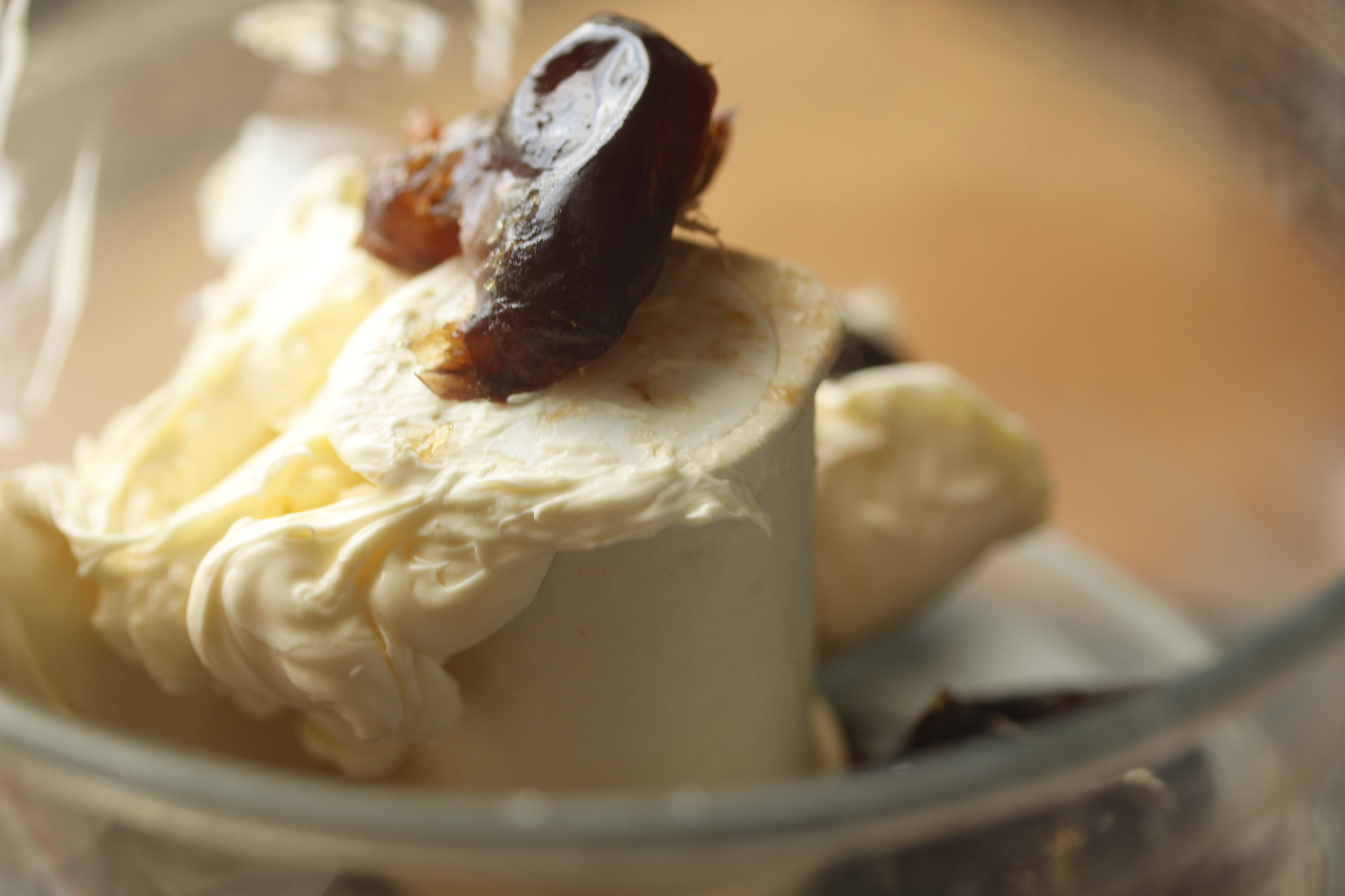 Á meðan gerði ég kremið. Ég setti 250 g af mascarponeosti (1 dós) í matvinnsluvélina, ásamt sjö steinhreinsuðum döðlum og einni teskeið af vanilluessens og lét vélina ganga þar til kremið var slétt og mjúkt.