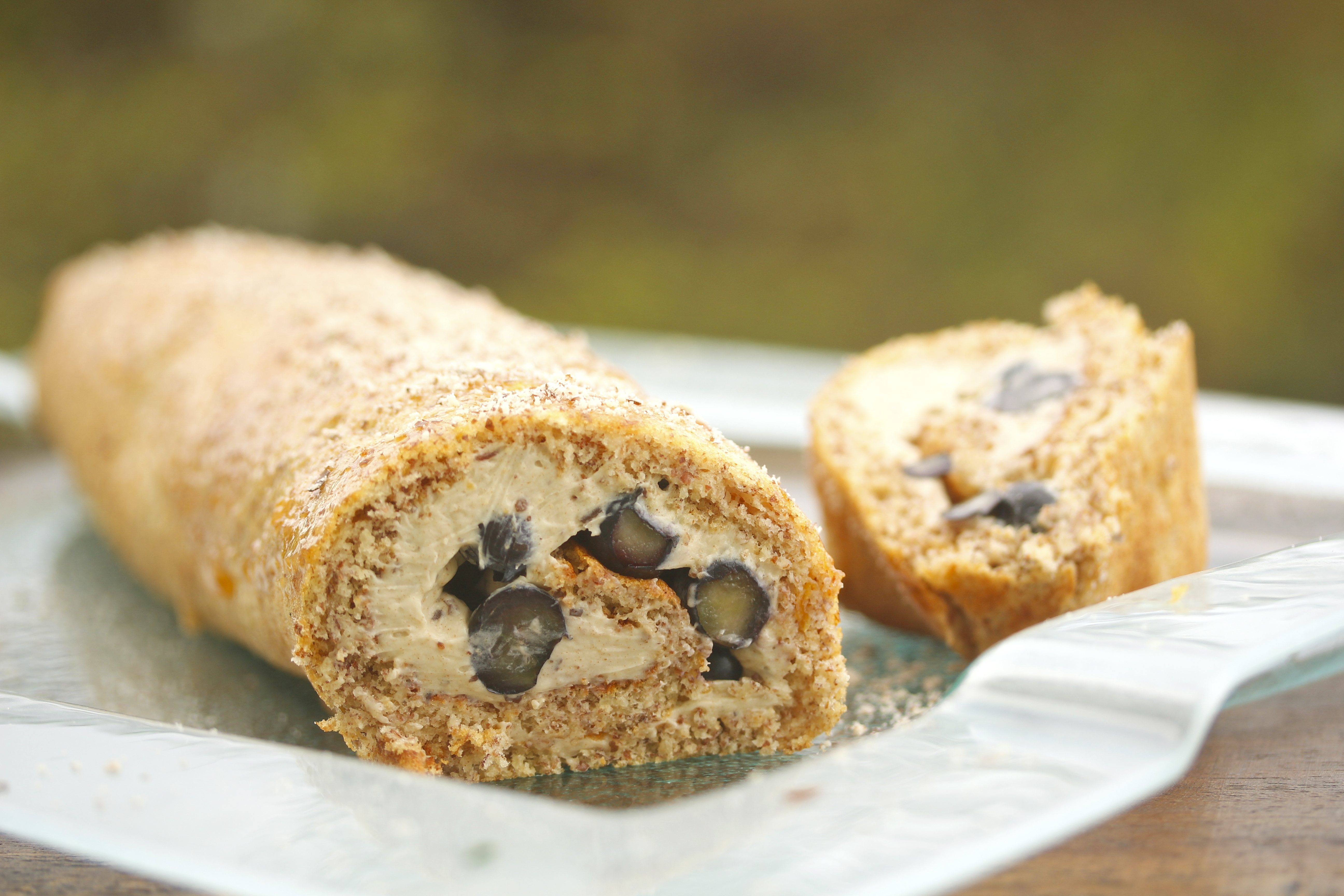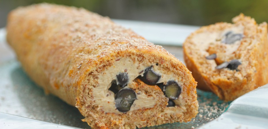 Möndlurúlluterta með mascarponeosti og bláberjum
