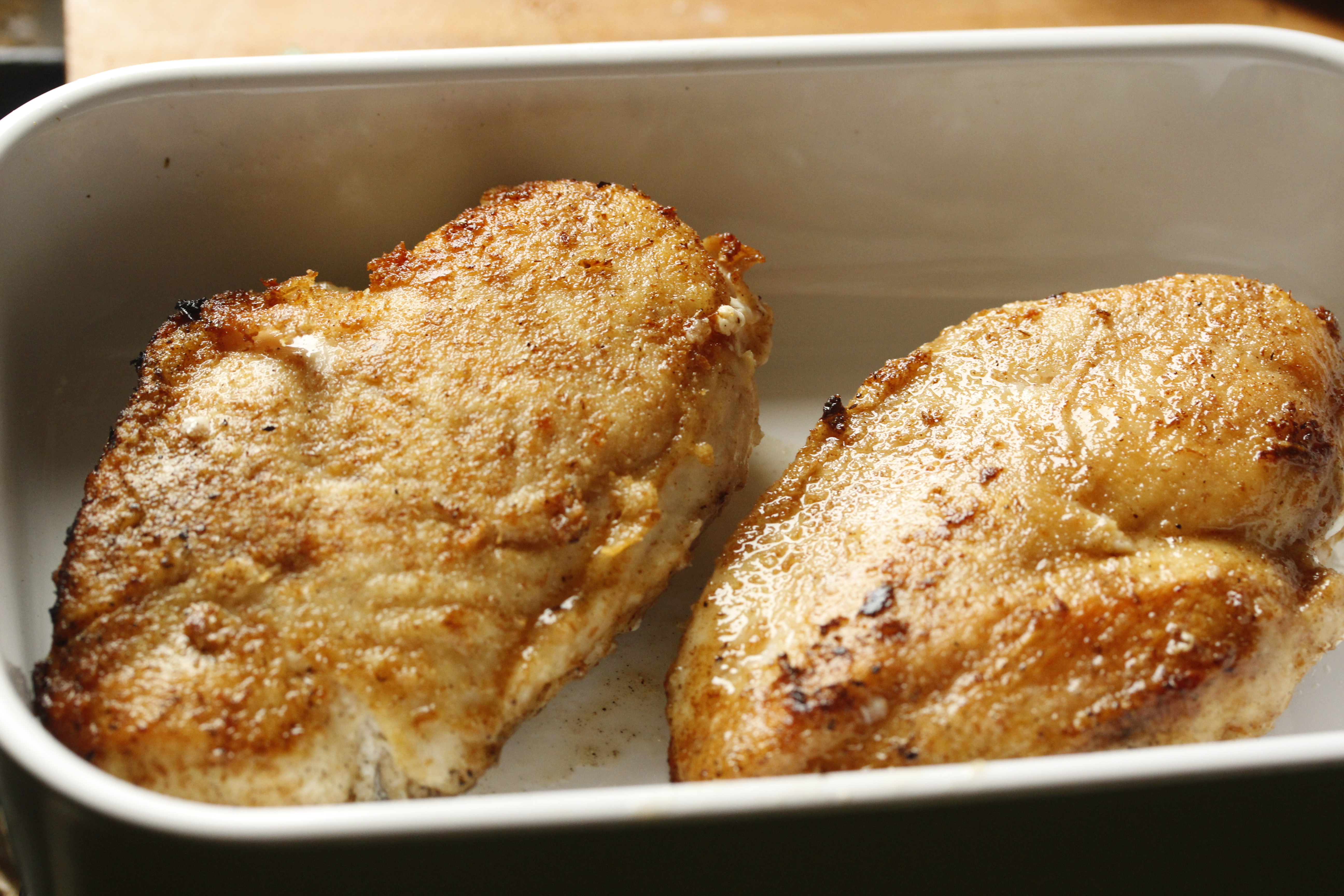 Þegar bringurnar voru orðnar fallega brúnar setti ég þær í eldfast mót (gott að hita það áður) og bakaði þær í ofninum í um 15 mínútur.