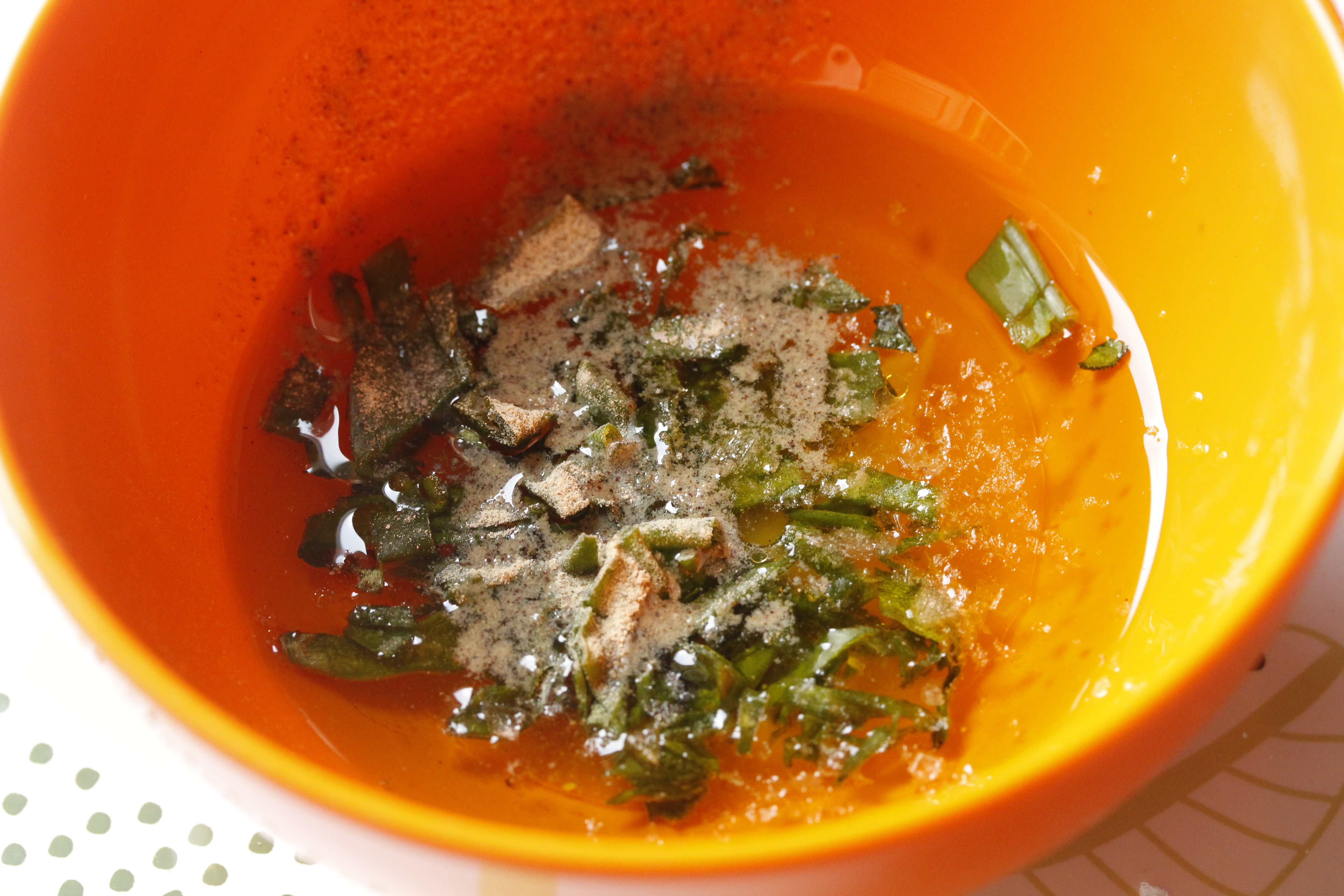 Ég setti 3 msk af ólífuolíu, safa úr 1/2 sítrónu, 1 tsk af dijonsinnepii og smátt söxuðu grænu blöðin af 1 vorlauk í skál ásamt ögn af pipar og salti og hrærði vel saman.