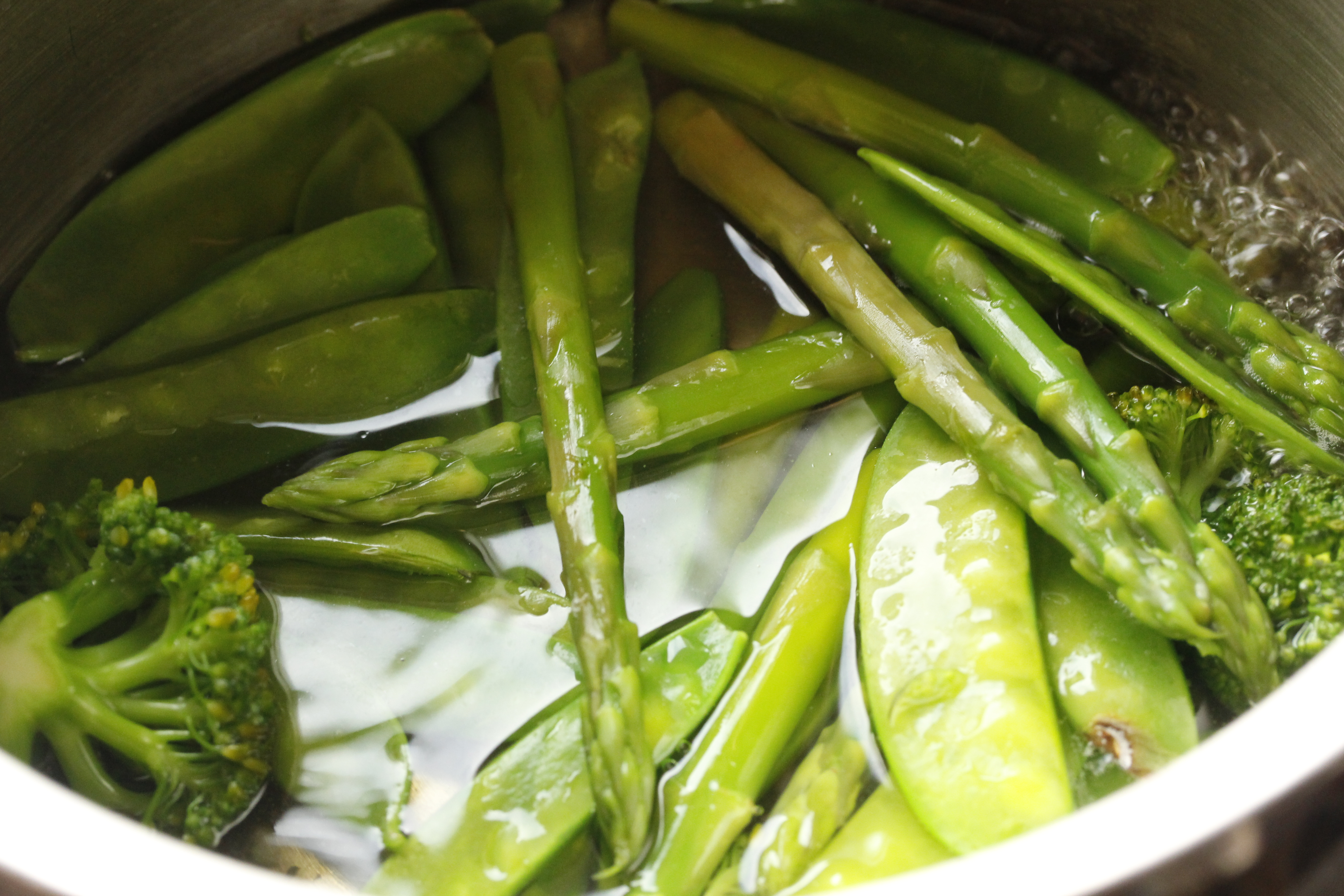 Svo hitaði ég dálítið saltvatn í potti, setti 200 g af dvergspergli og 200 g af spergilkáli, skornu í litla kvisti, út í og lét sjóða í 3 mínútur.
