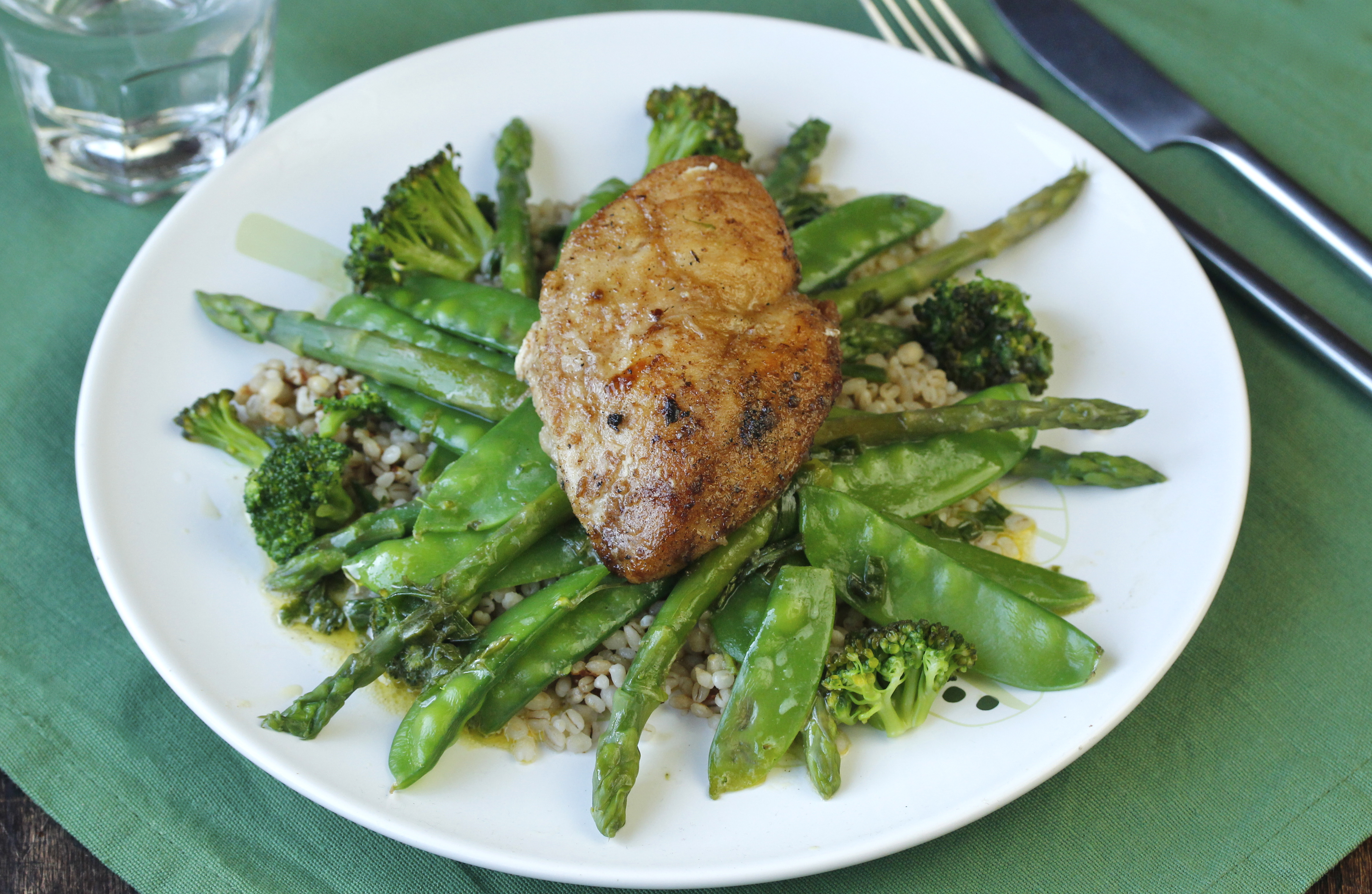 Kjúklingabringur með perlubyggi og vorgrænmeti