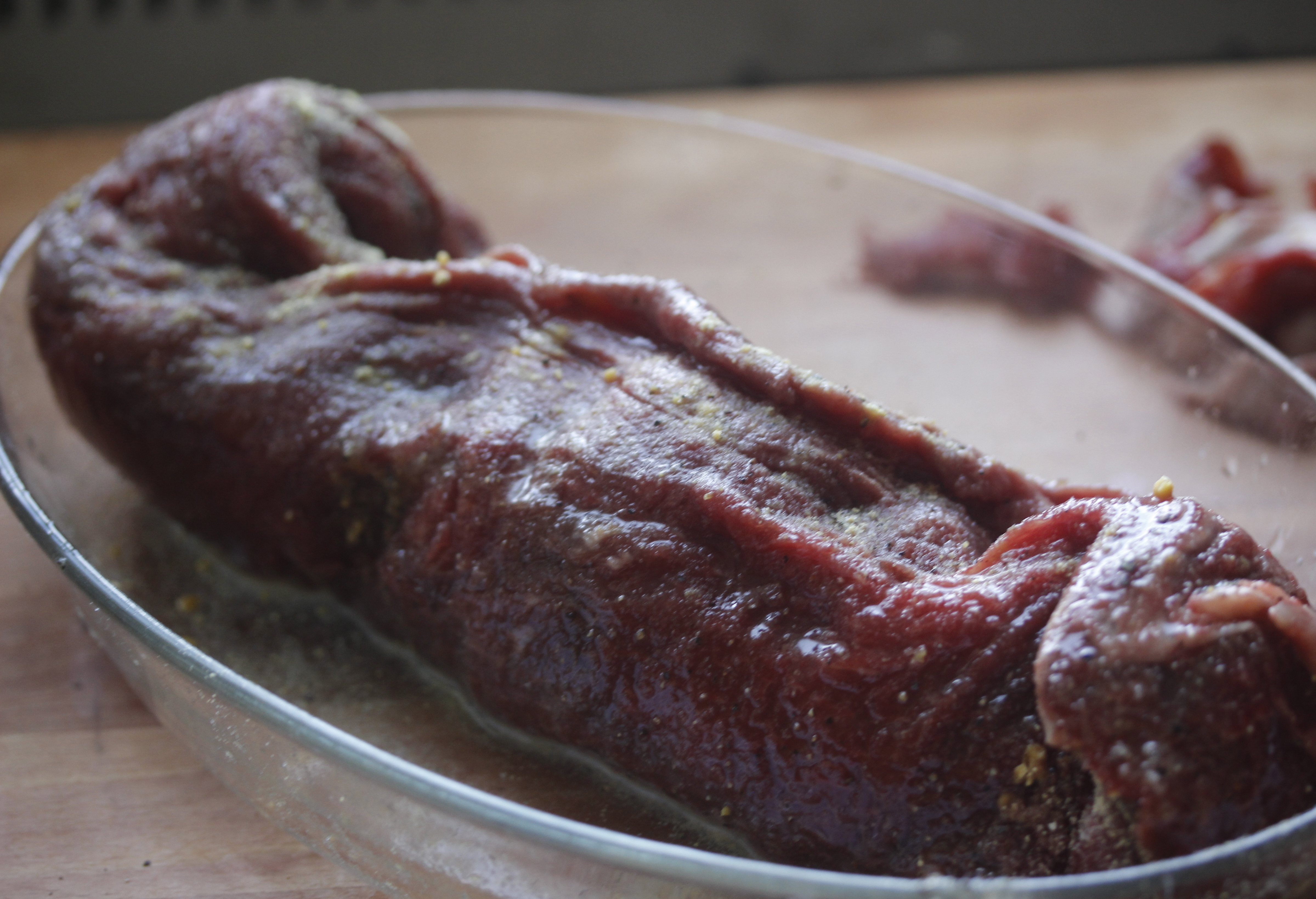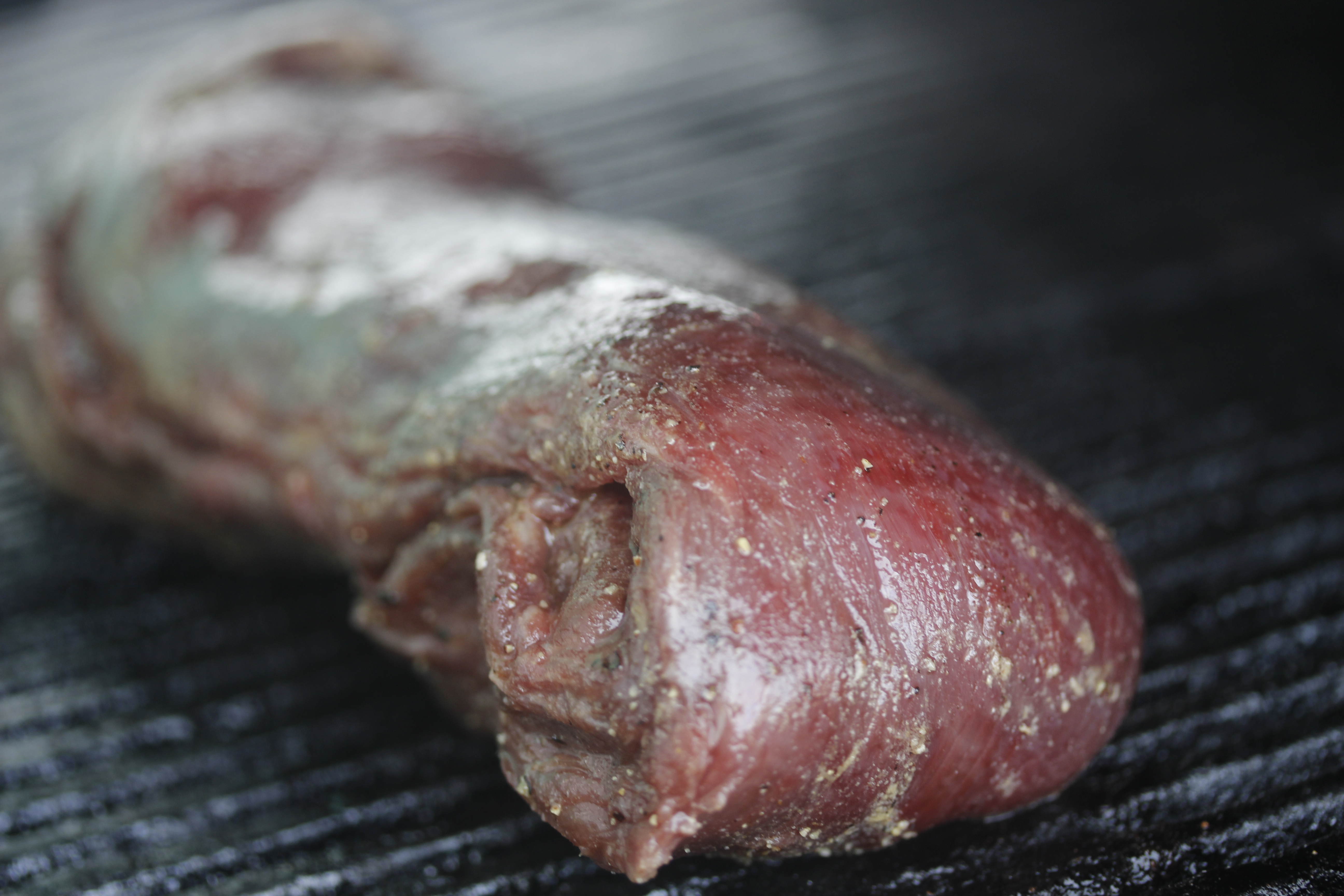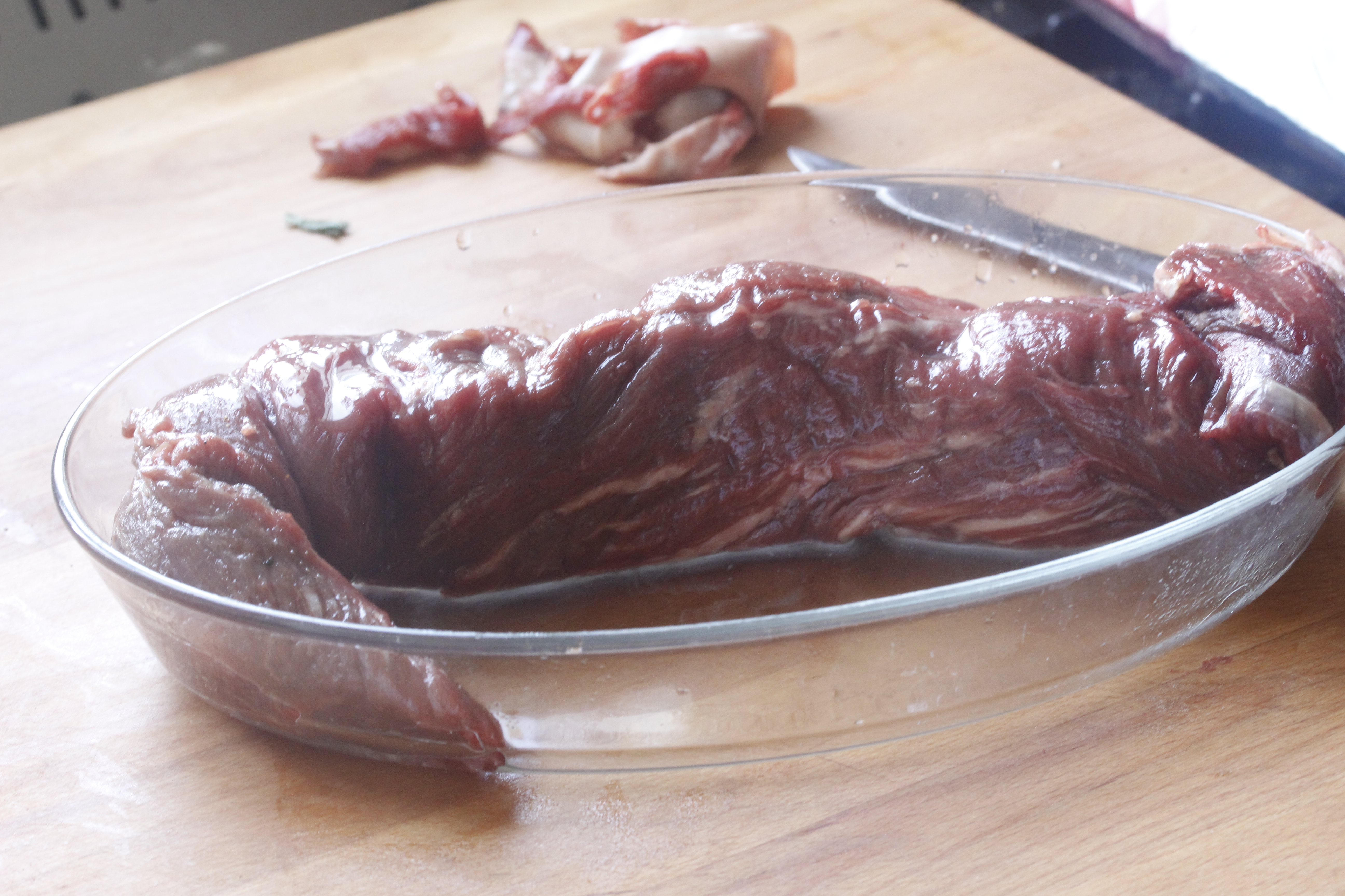 Ég byrjaði á að tala nautalund – þýska minnir mig – sem ég hafði látið þiðna í ísskápnum. Hún var ekki heil, vantaði þykkasta hlutann (ég notaði hann í annað) en var líklega um 1 kg. Ég snyrti hana og skar burt allar himnur.