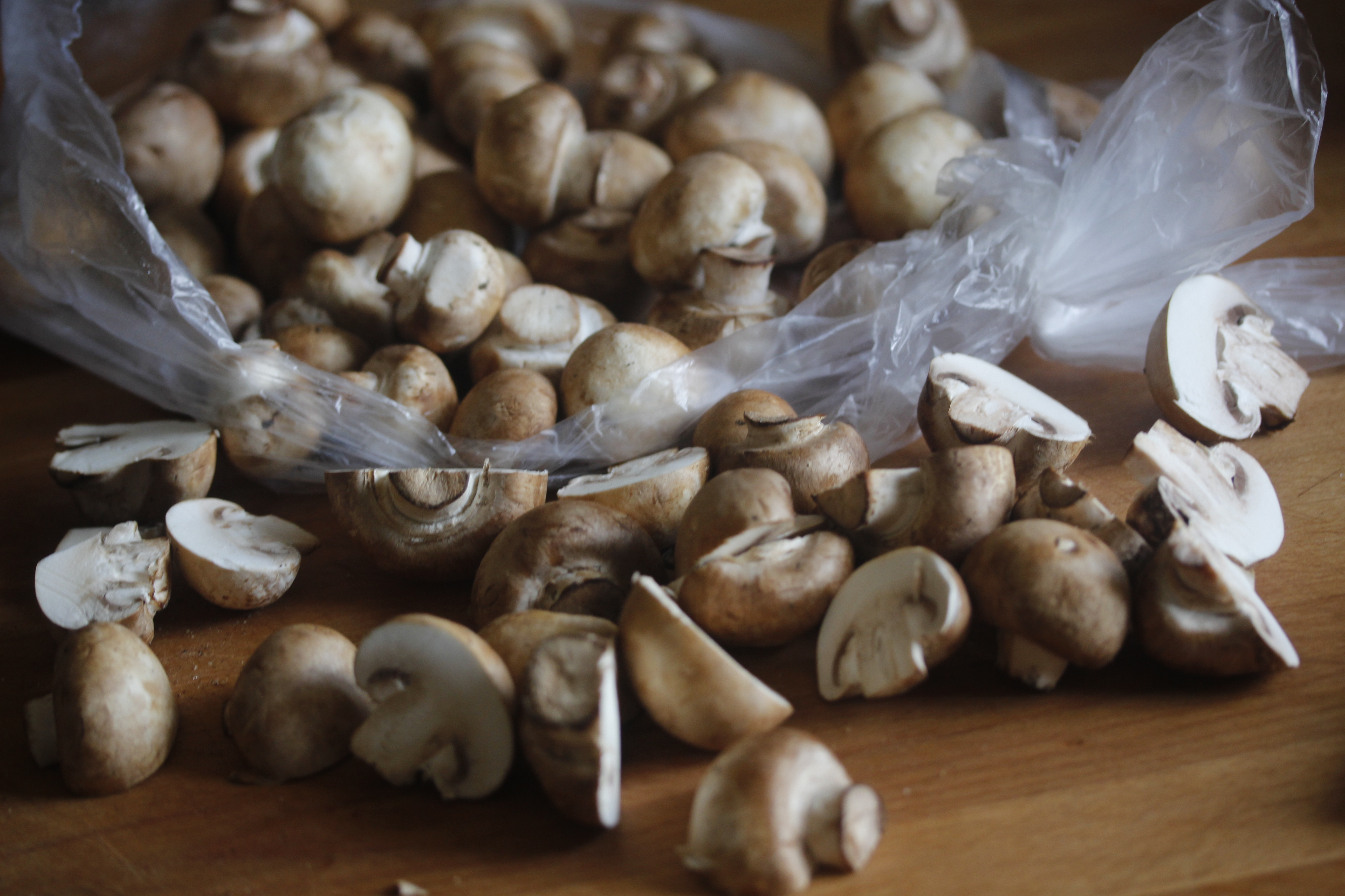 Á meðan sauð ég kartöflur og perlubygg (ég er mjög hrifin af því um þessar mundir). Og af því að aðalsveppahatarinn í fjölskyldunni var ekki í mat og það er kominn nýr sveppaelskandi í hópinn, þá hafði ég keypt eitthvað 700 g af sveppum – frekar litlum, ekki alveg nýjum, þeir verða bragmeiri og betri með aldrinum. Ég hreinsaði þá og skar þá í tvennt, nema þá allra minnstu. Ég skar líka tvo hvítlauksgeira og nálar af einni rósmaríngrein smátt.