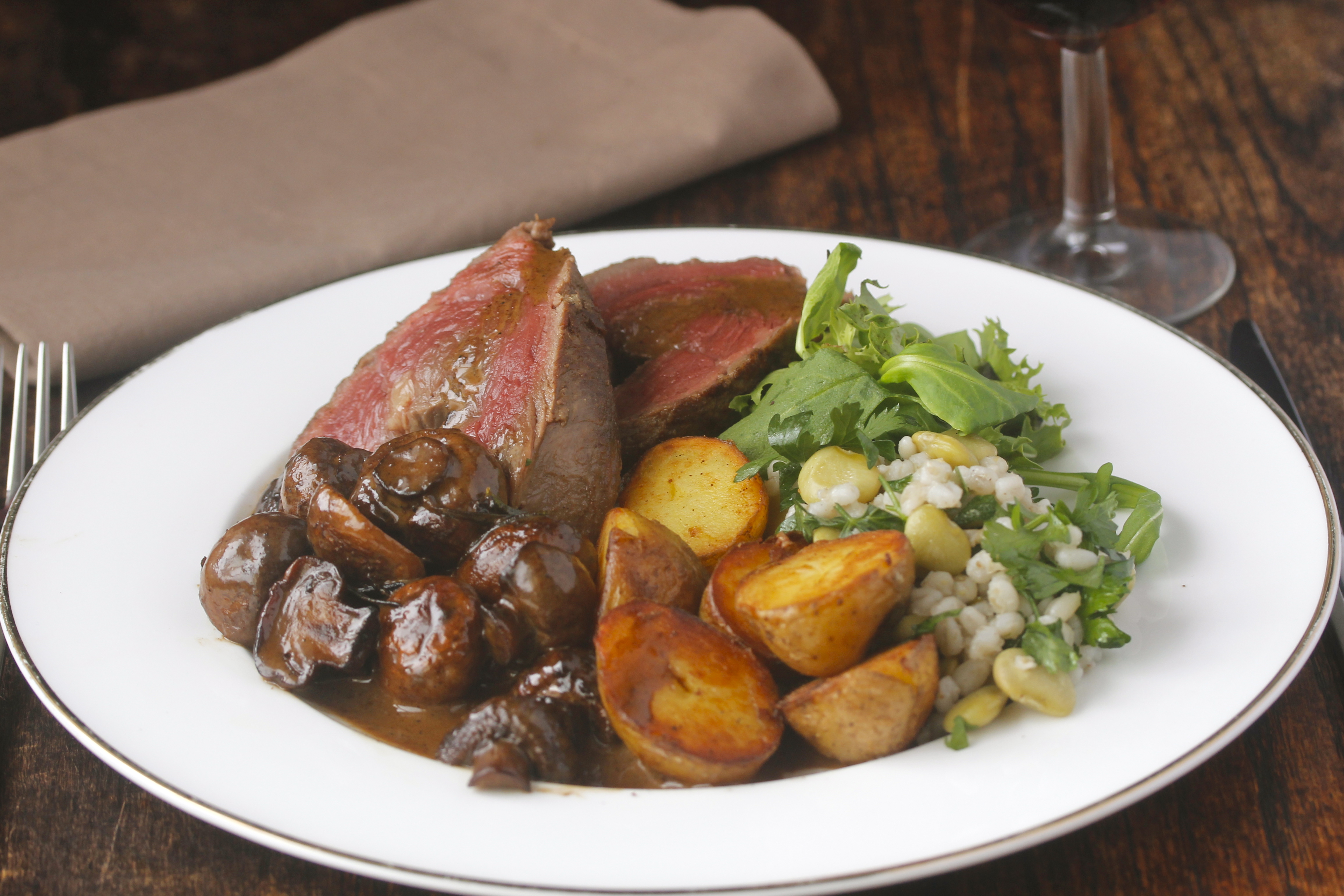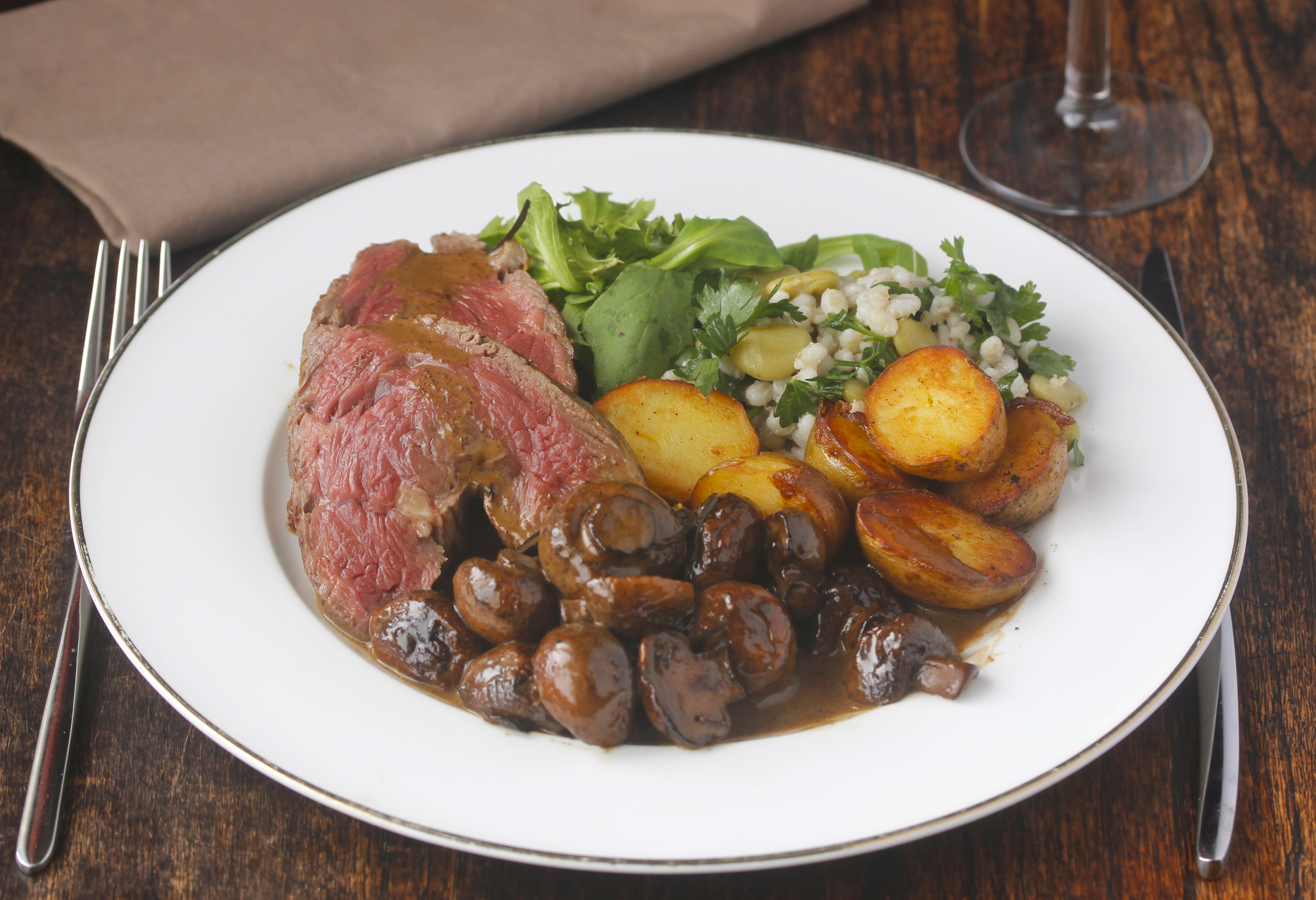 Grilluð nautalund með sveppum, steiktum kartöflum og byggsalati