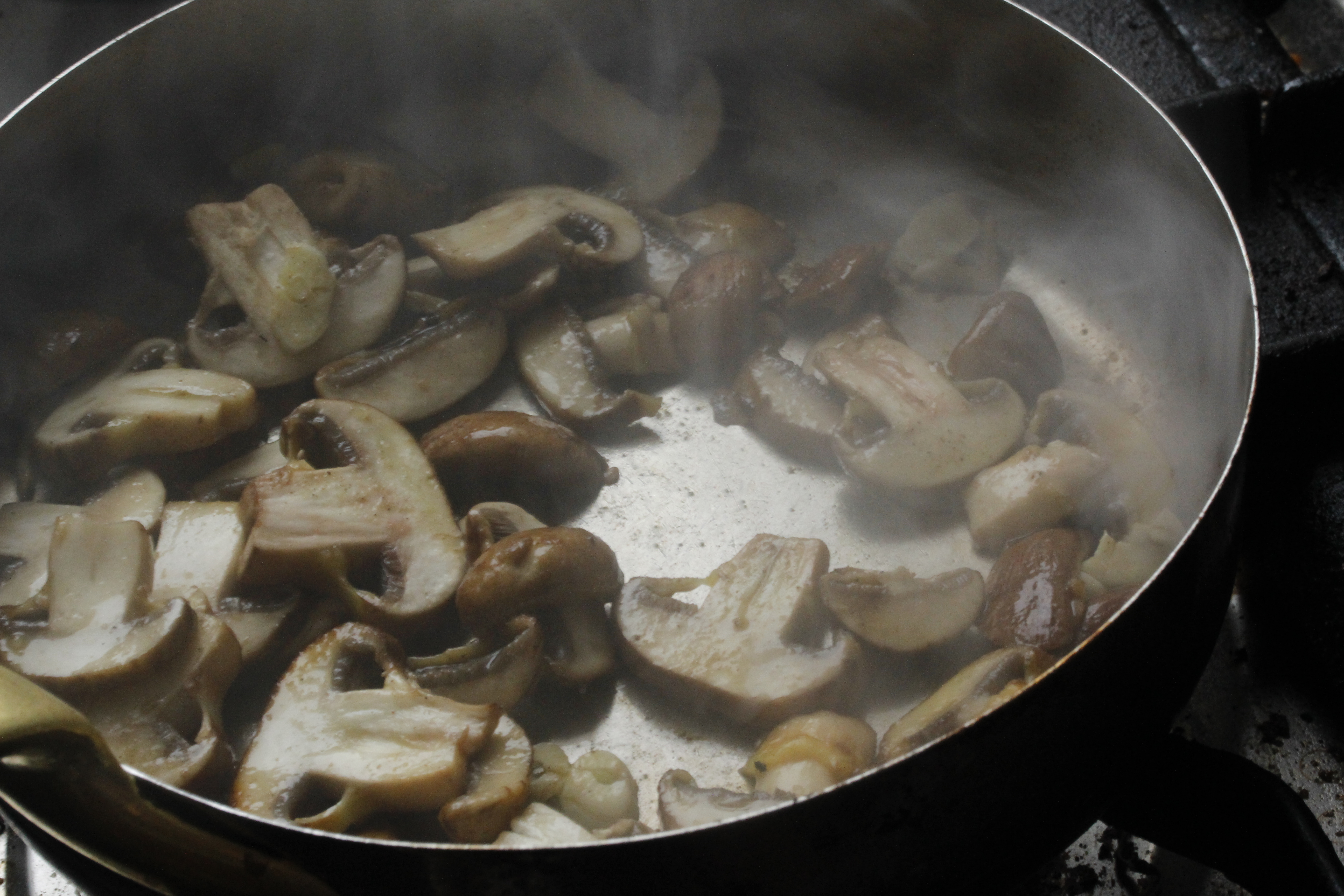 Á meðan (eða það er líklega best að byrja á þessu um leið og byrjað er að hita pastavatnið) bræddi ég 25 g af smjöri á pönnu. Skar svo 250 g af kastaníusveppum (mega vera venjulegir) í sneiðar og lét þá svo krauma í smjörinu í nokkrar mínútur, ásamt 2 smátt söxuðum hvítlauksgeirum og hvíta hlutanum af 3-4 vorlaukum (líka söxuðum).