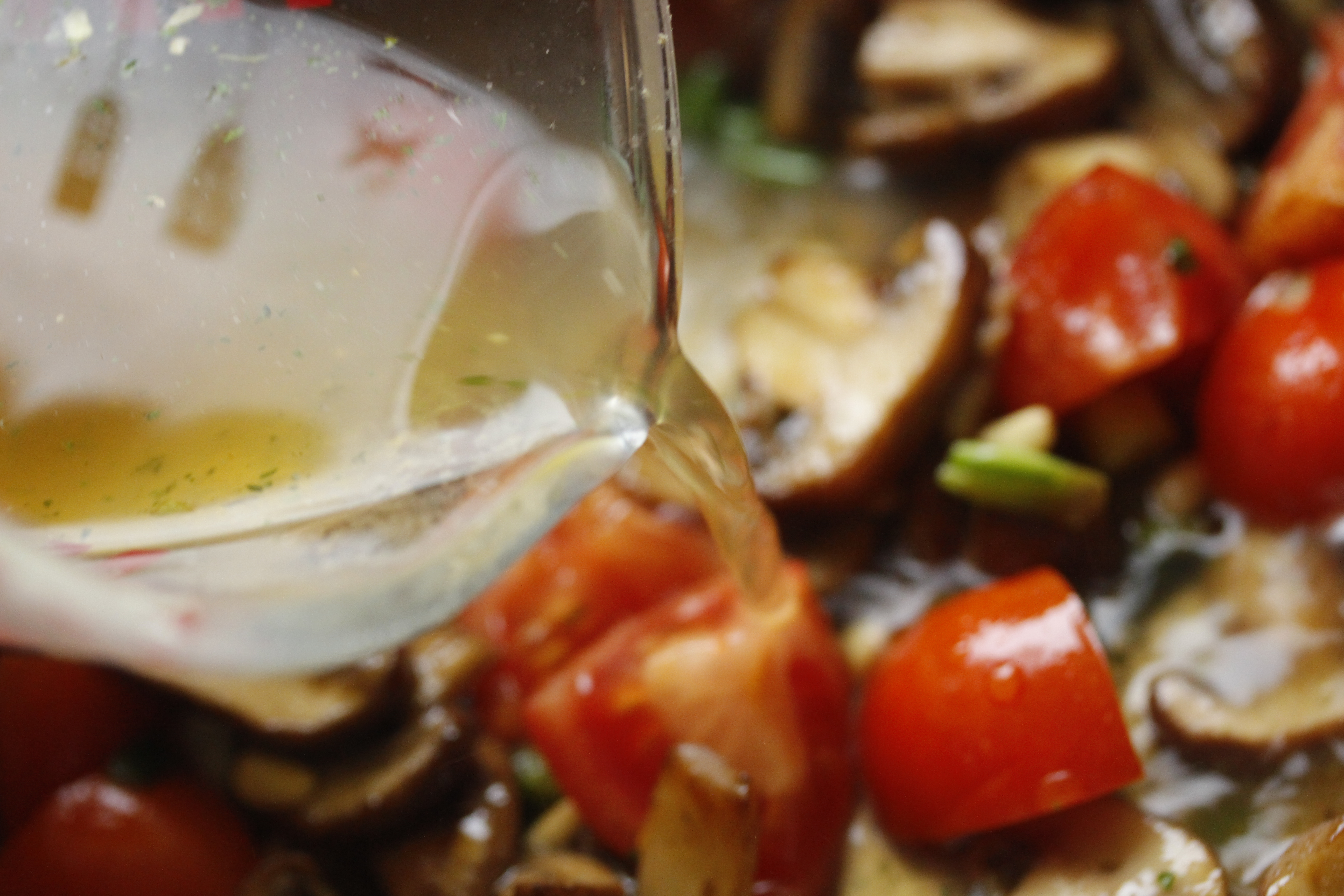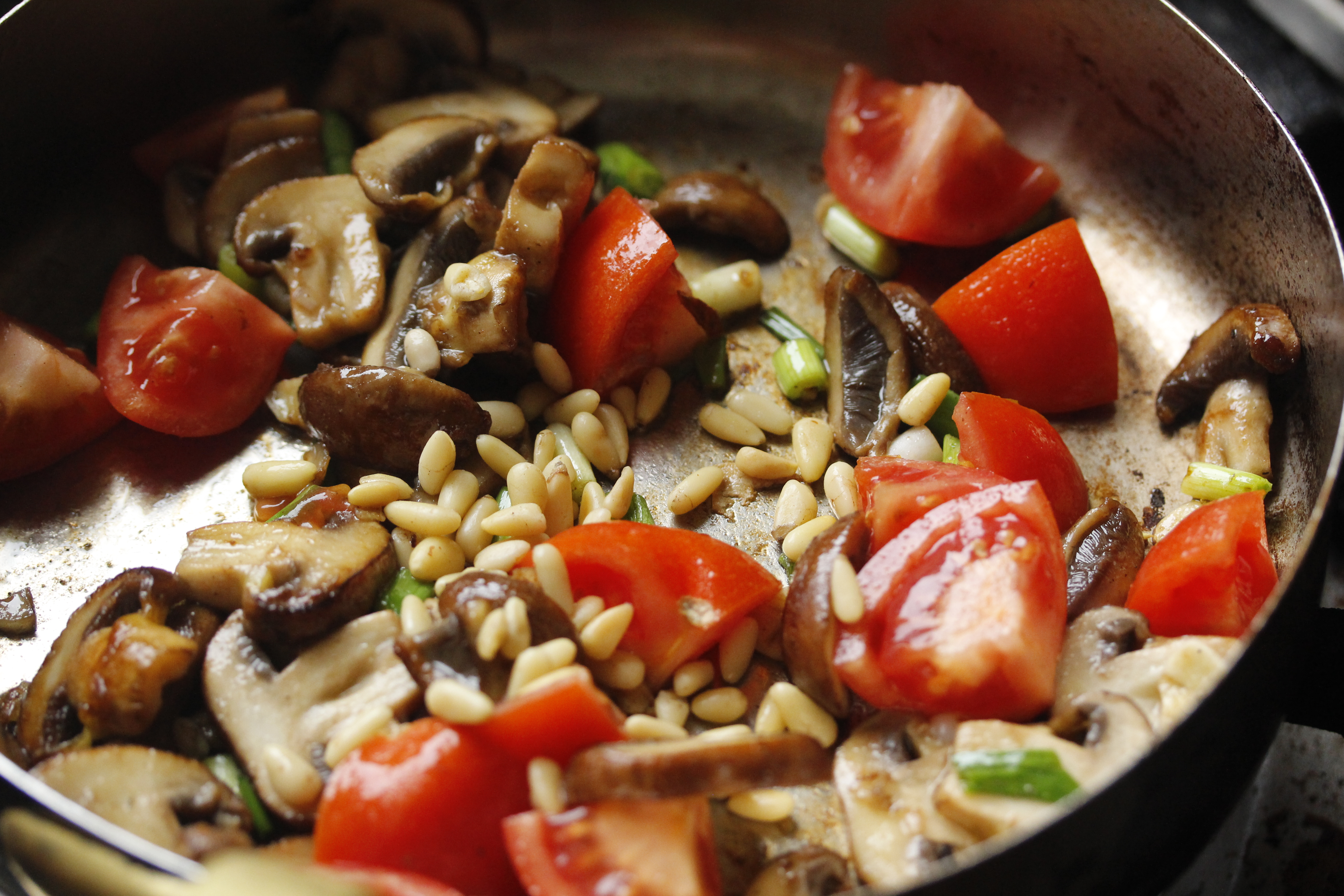 Ég skar 4-5 vel þroskaða tómata í bita og setti þá á pönnuna, ásamt 2 msk af furuhnetum, og steikti þetta í 3-4 mínútur í viðbót við meðalhita.