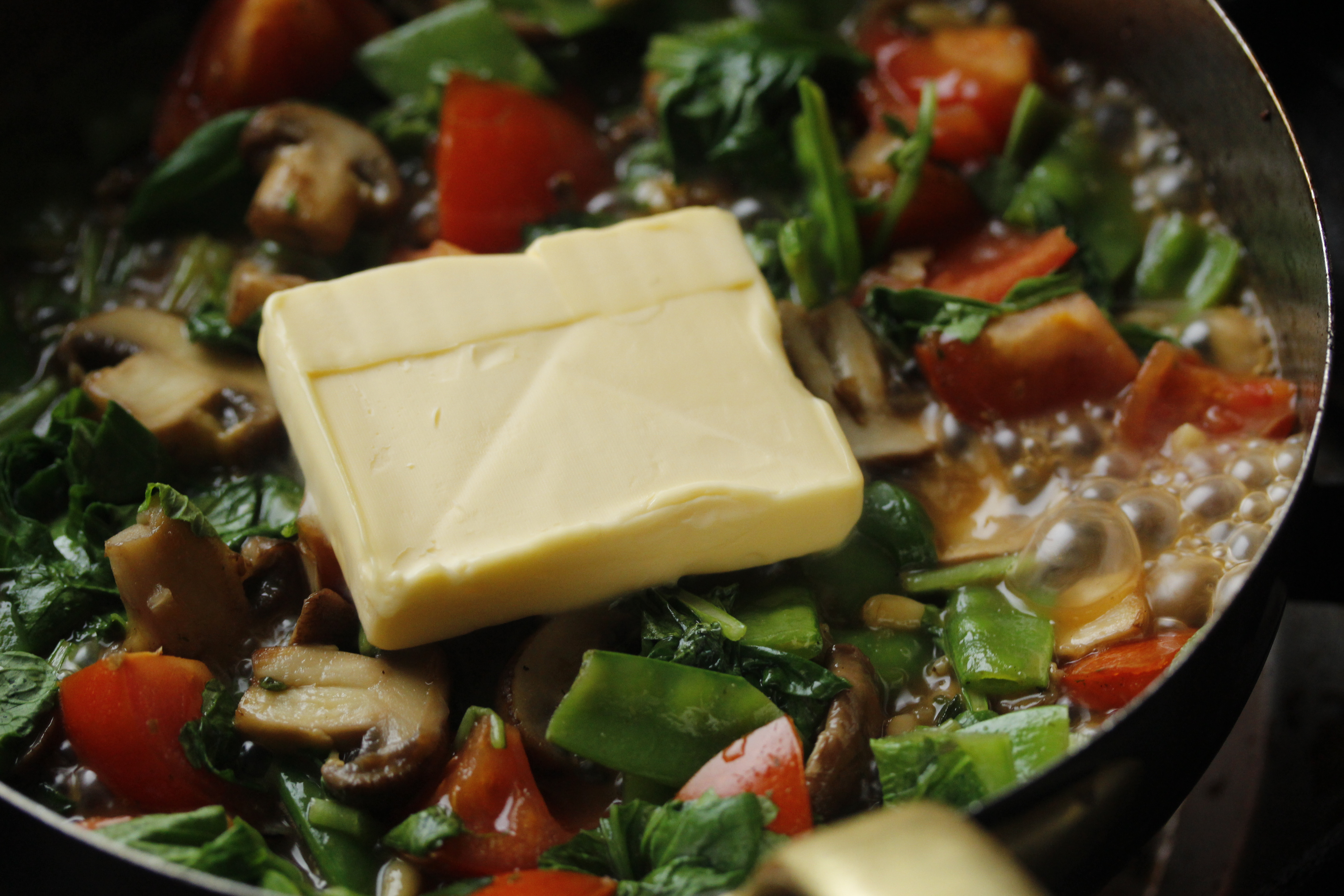 … og hrærði þar til smjörið var bráðið og hafði myndað sósu með soðinu.