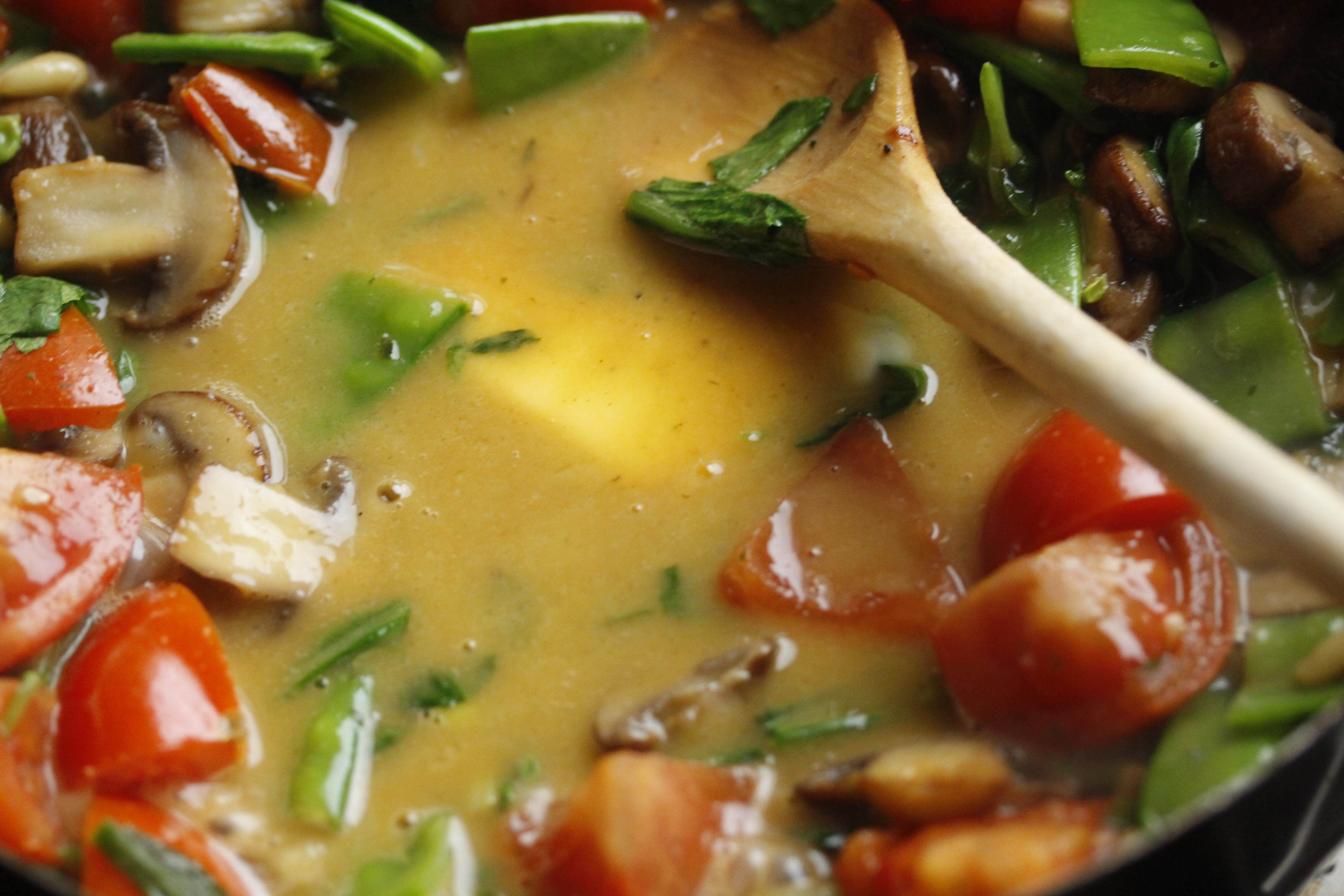 Ég átti svona 150 g af sykurbaunum sem ég skar niður og setti út í en það má alveg sleppa þeim (þær eru frekar dýrar) eða nota eitthvert annað hentugt grænmeti – reyndar er tilvalið að nota ýmiss konar ísskápsafganga í þennan rétt en þá þarf kannski að setja grænmetið út í fyrr, eftir því hvað það þarf langa suðu. Sykurbaunirnar þurfa mjög stutta suðu, ég lét þetta sjóða rösklega í 2-3 mínútur.