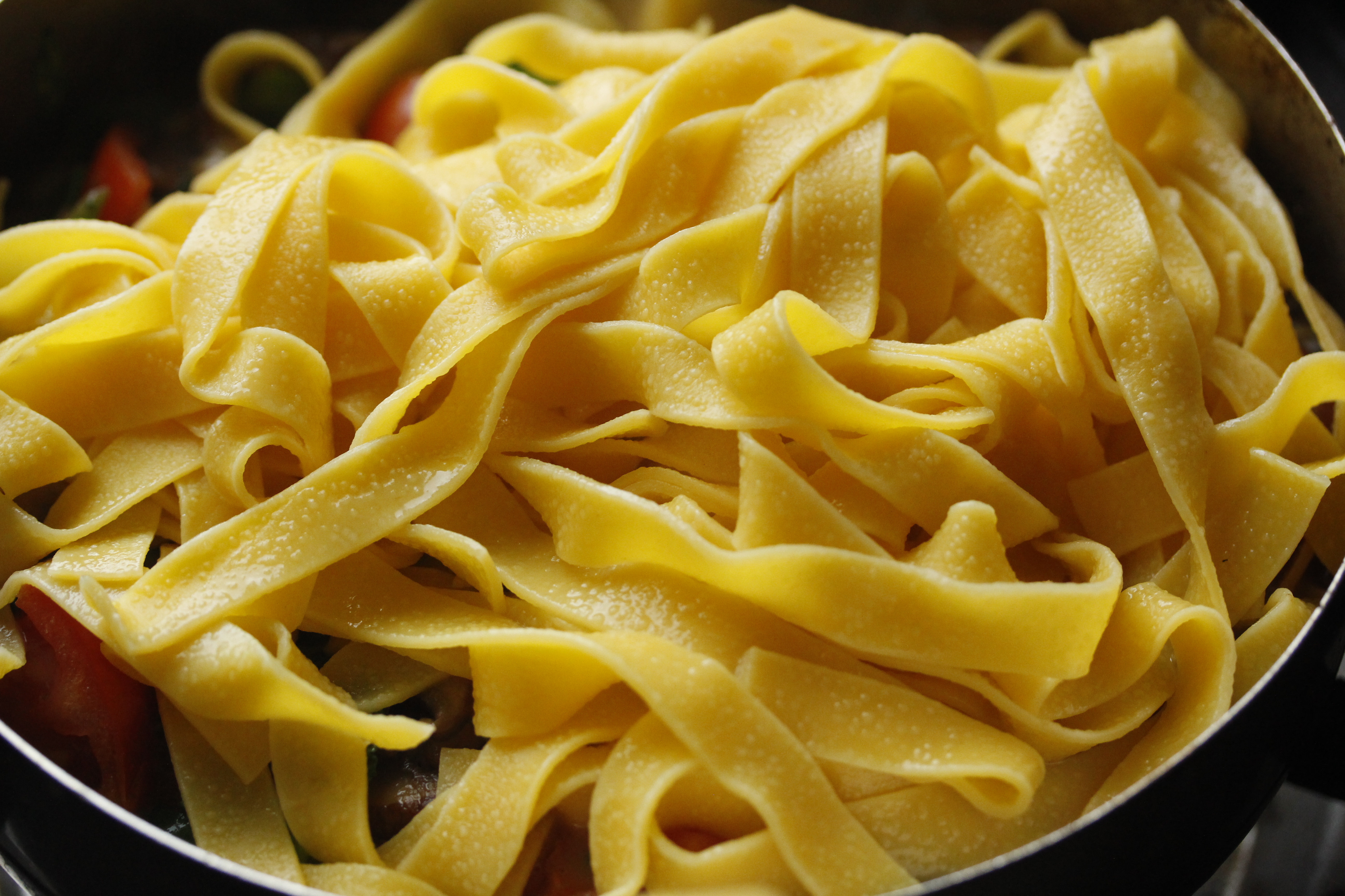 Ég byrjaði á að hita vatn (svona 3 lítra) í stórum potti og salta. Setti svo 350-400 g af tagliatelle út í, lét suðuna koma upp aftur og lét svo pastað sjóða án loks í 10 mínútur (eða eftir leiðbeiningum á umbúðum. Suðan ætti að vera nokkuð rösk eða allavega stöðug, þetta á ekki að malla. Og nei, það á ekki að setja olíu út í.