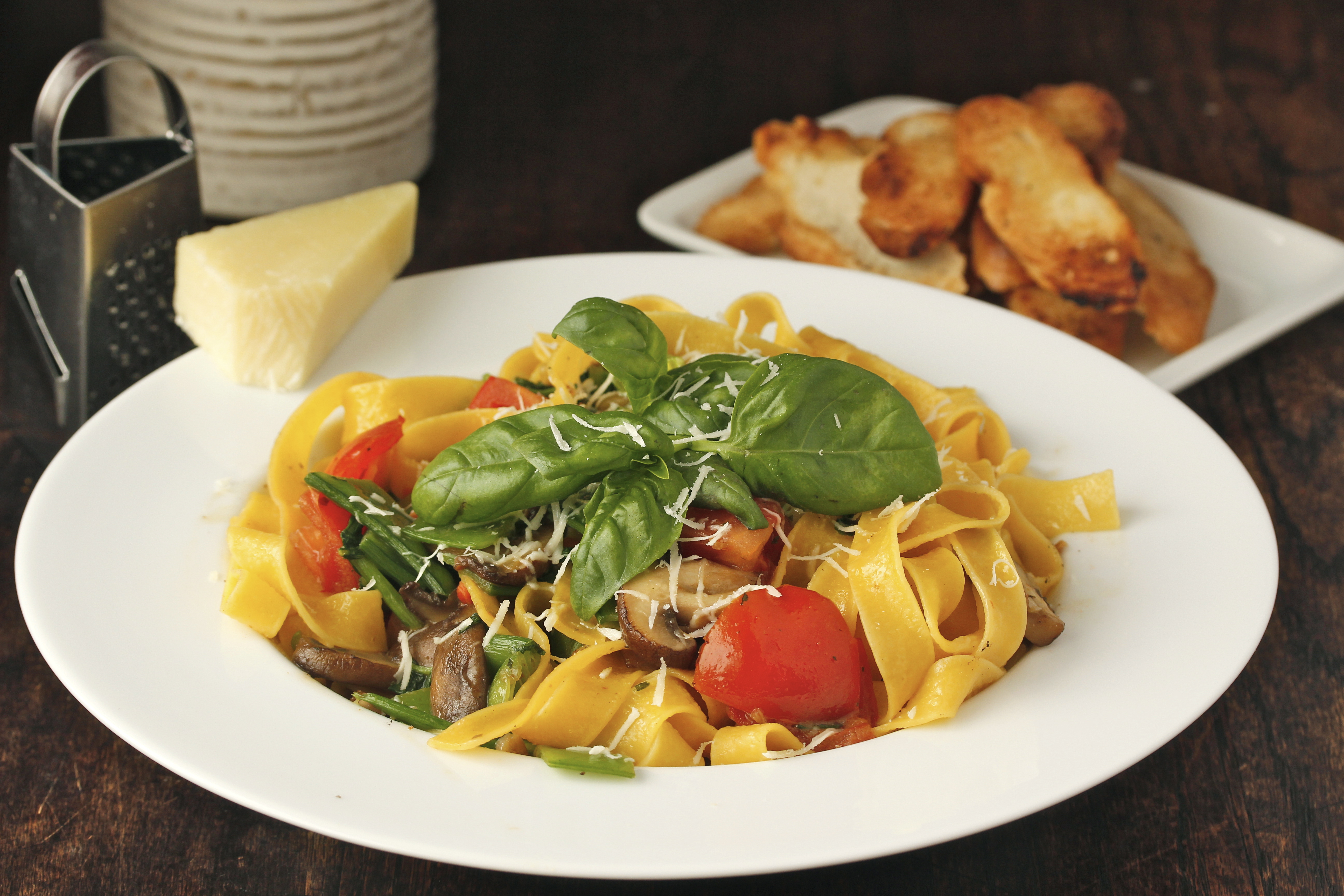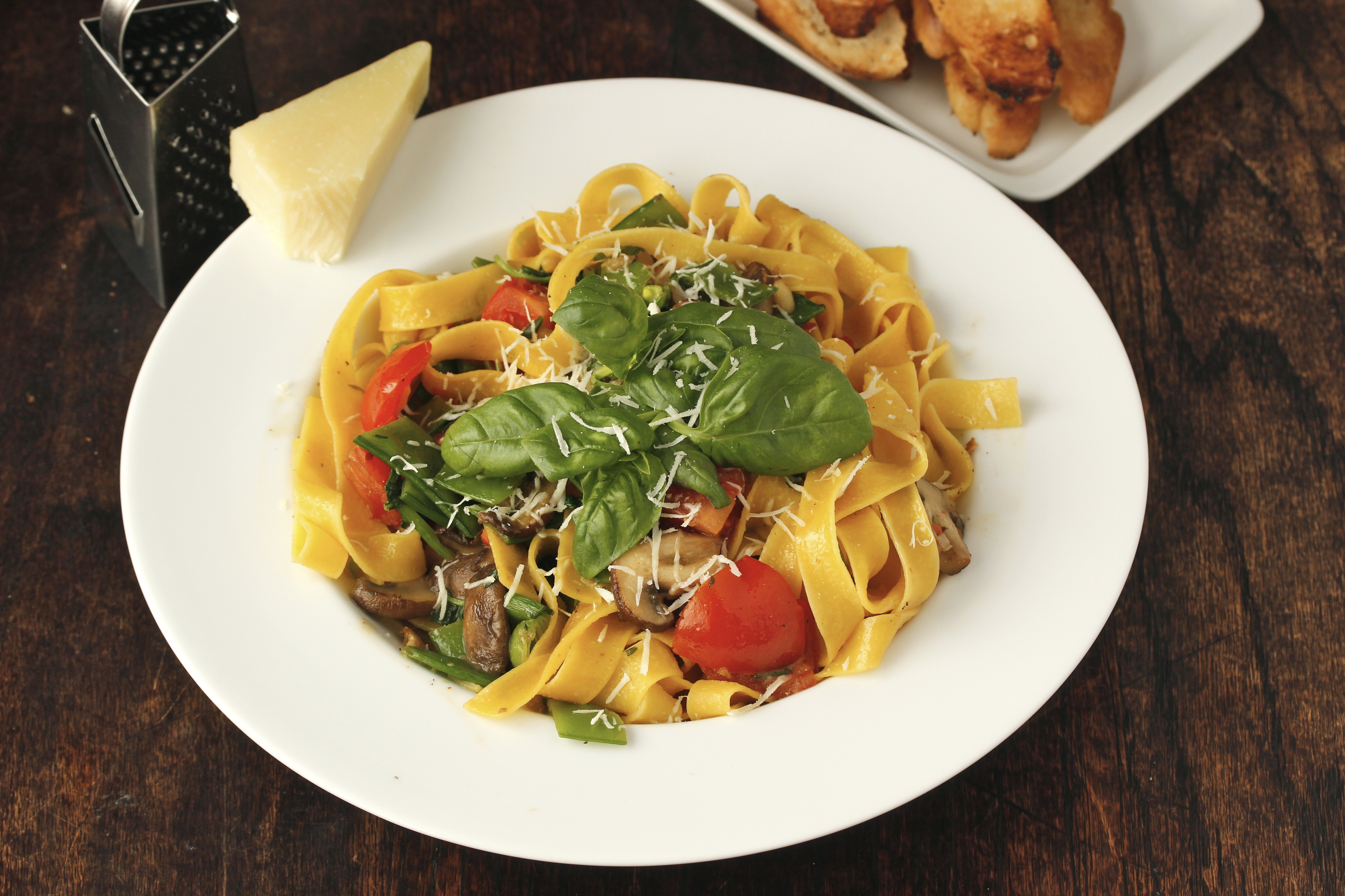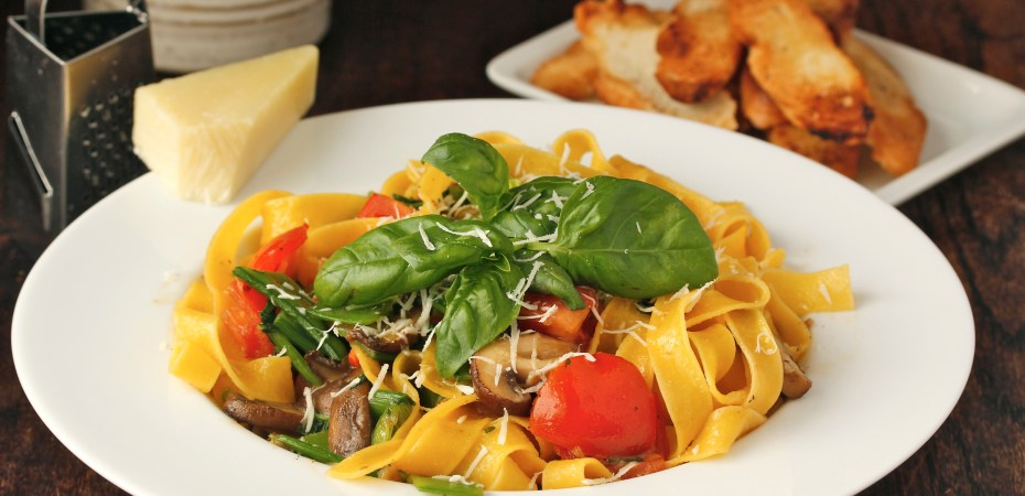 Svo er bara að rífa dálítinn parmesanost yfir, skreyta með basilíku og bera fram með meiri parmesanosti og e.t.v. hvítlauksbrauði eða ristuðum baguettesneiðum.