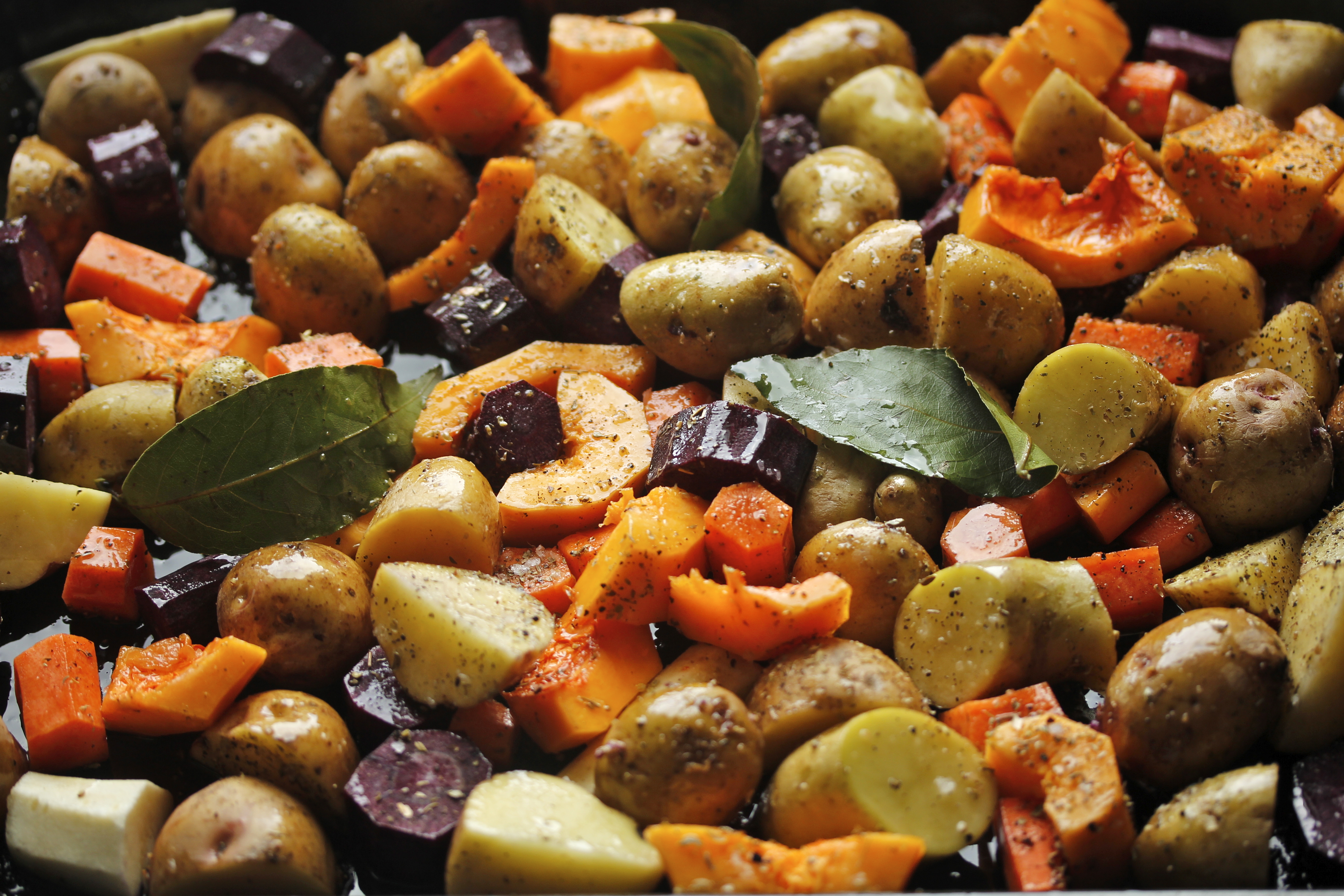 Ef ég man rétt voru þetta þrjár mismunandi tegundir af kartöflum, venjulegar gulrætur (litlar og stórar), fjólubláar gulrætur, ein einmana nípa, einn butternut – og svo bættist við seinna blómkál en það þarf styttri tíma í ofninum og er þess vegna ekki á fjölskyldumyndinni, sem var tekin áður en grænmetið fór í ofninn. Svo að nú eru grænmetisskúffan með harða grænmetinu meira og minna tóm en það er eitt og annað enn í skúffunni með mýkra/viðkvæmara grænmetinu og ég þarf að nota það áður en ég fer út (og gefa syninum það sem ég kem ekki í lóg). Ég gæti þá til dæmis gert eitthvað á þessum nótum – þetta er uppskrift sem ég var með í maíblaði MAN.